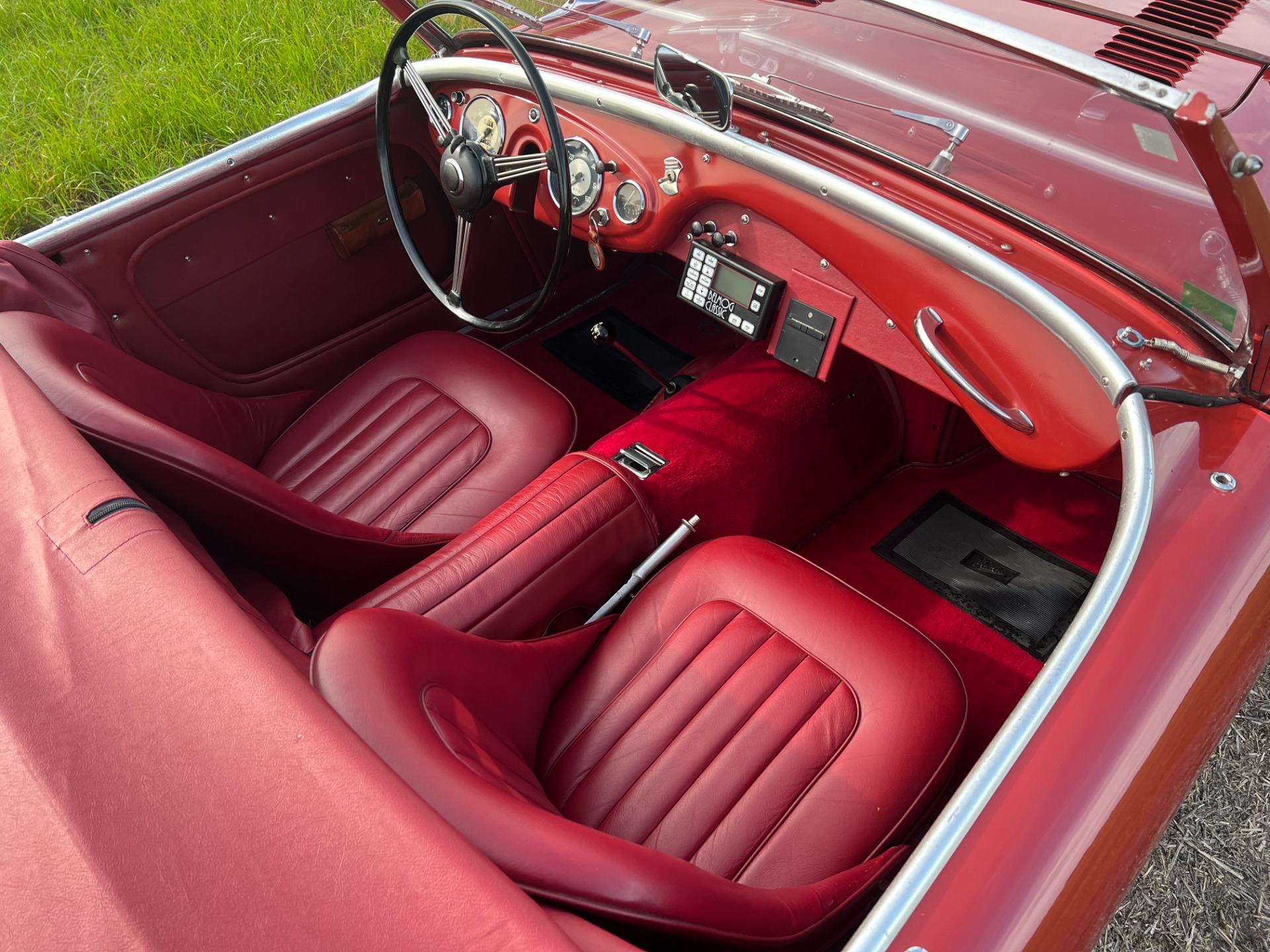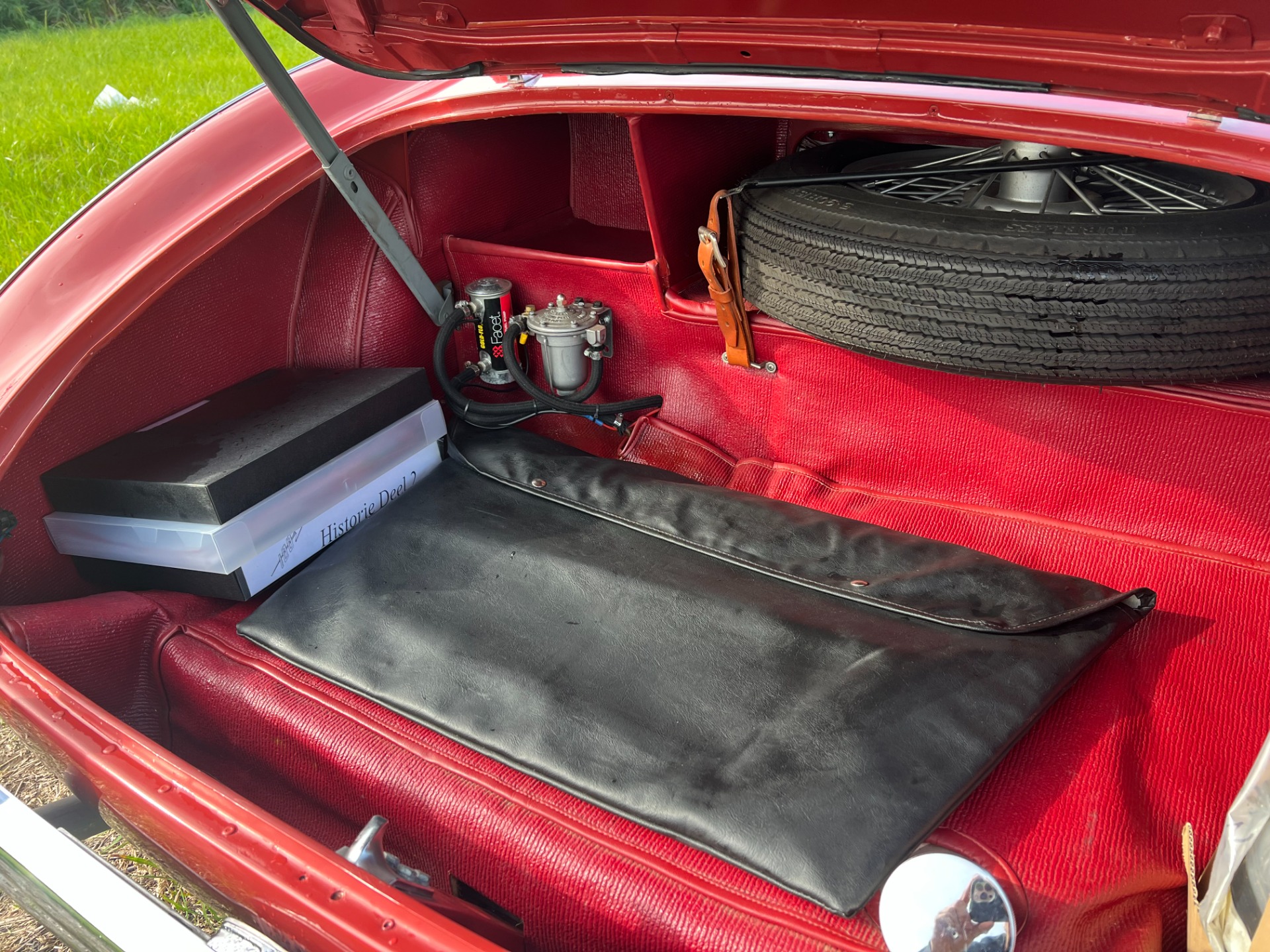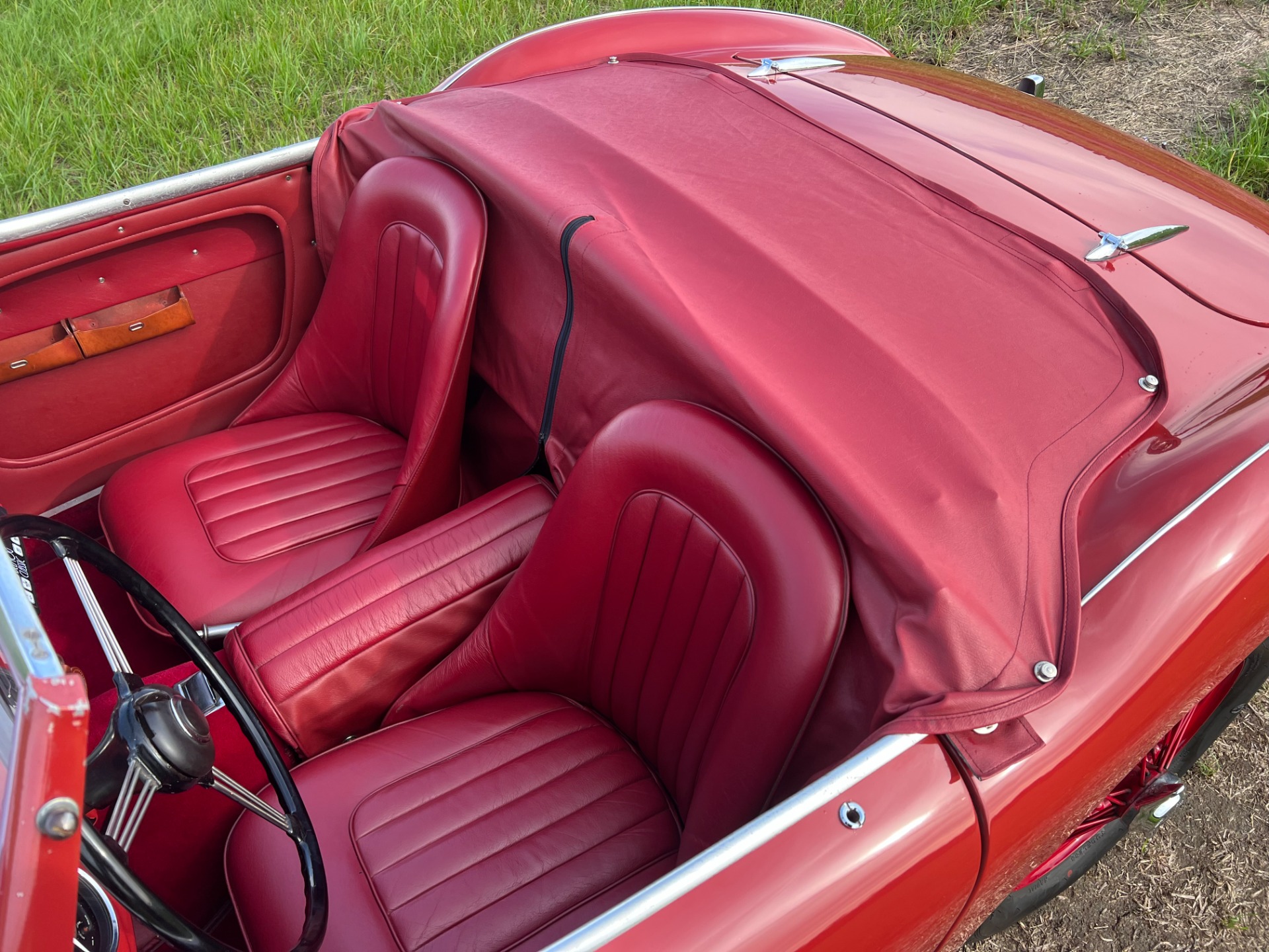 The red interior was redone a while back but is still in very good looking condition. Red leather seats as well as the red carpets do not have any tears or rips. When driving without soft top, a tonneau cover is included.