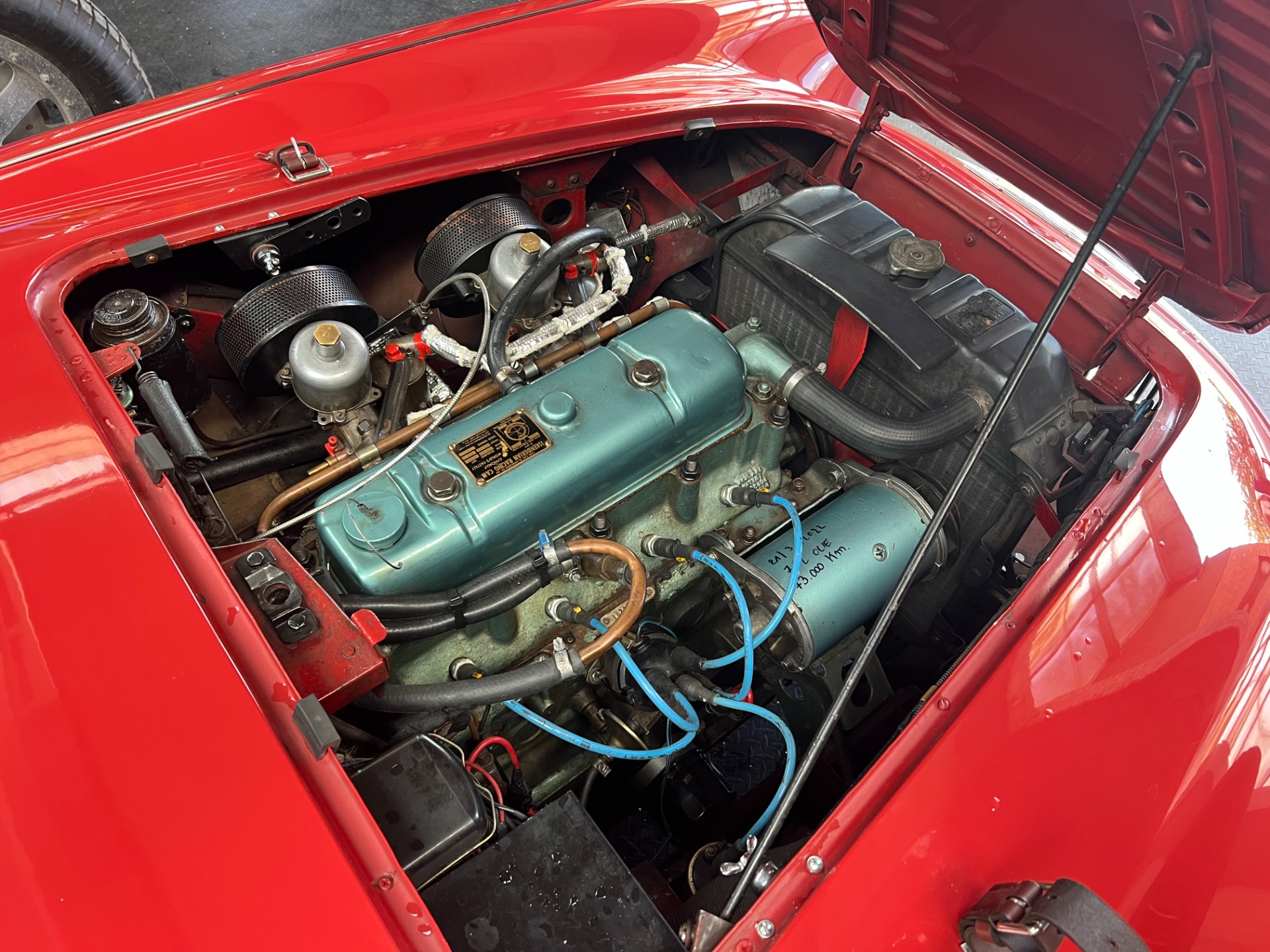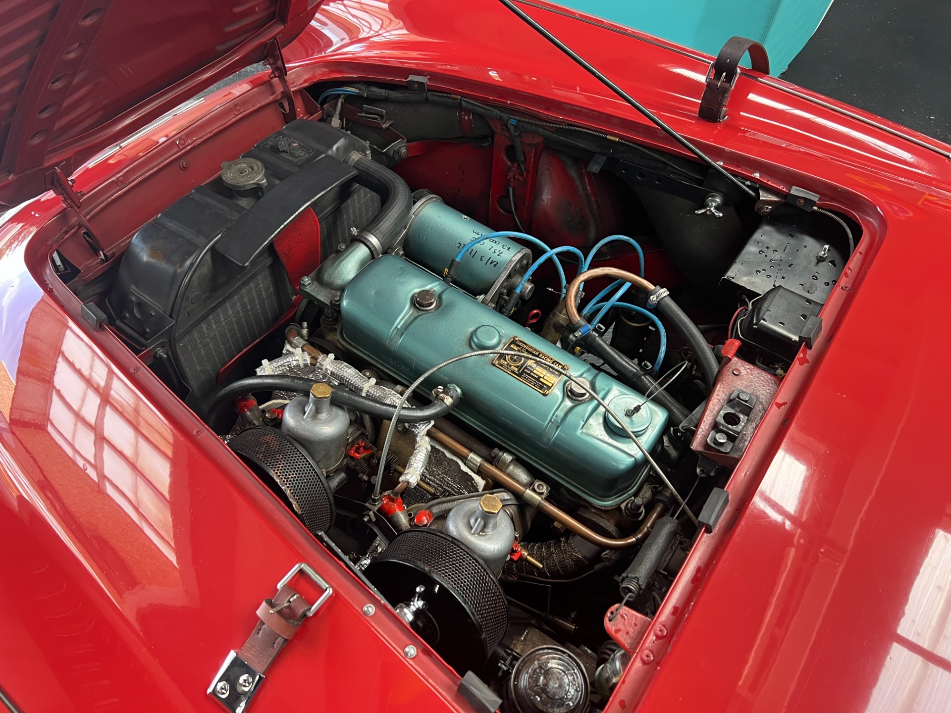 The engine and appurtenances (starter, air filter, carburetors, radiator,...) are to original specifications. The carburetors were recently overhauled. An aluminum gasoline tank was also installed. The engine starts easily and runs smoothly without abnormal noises. the exhaust was renewed and is in good condition. The Austin healey is equipped with a braking system to original specifications with drum brakes all around.<br>