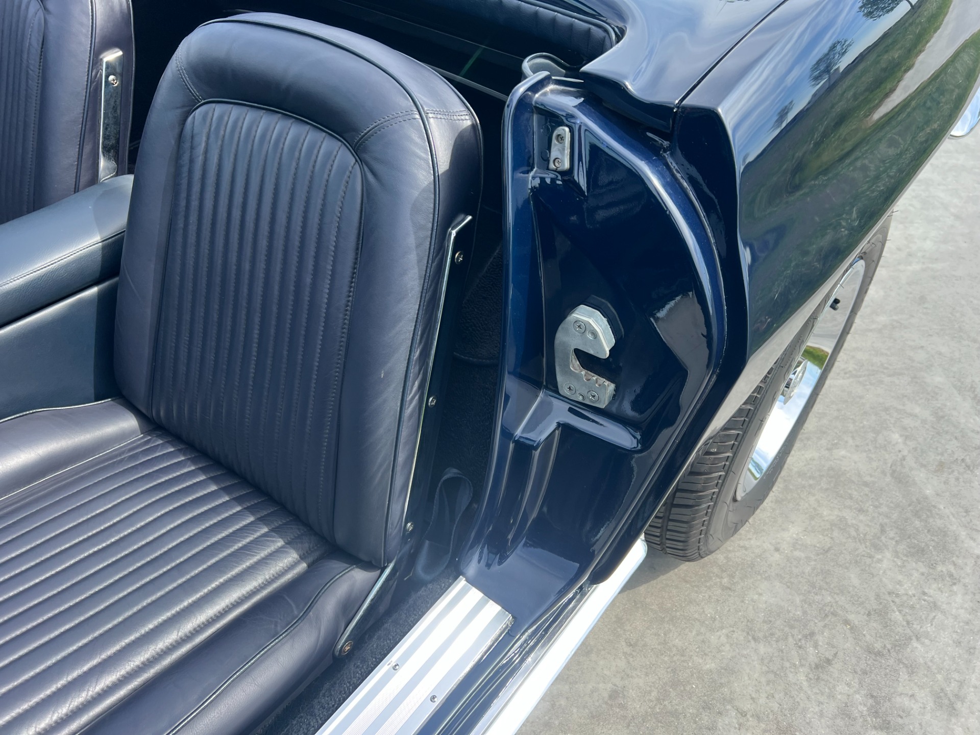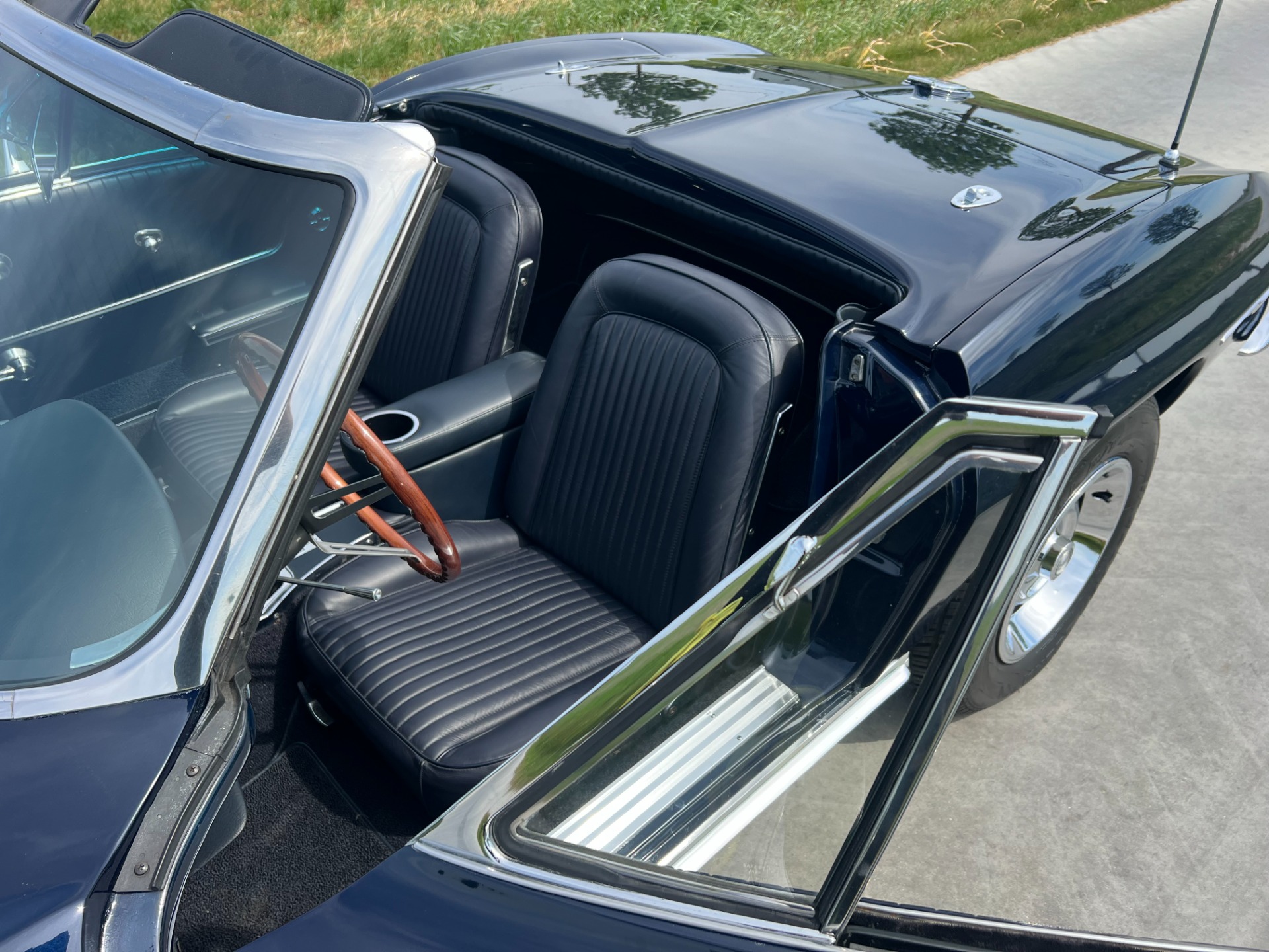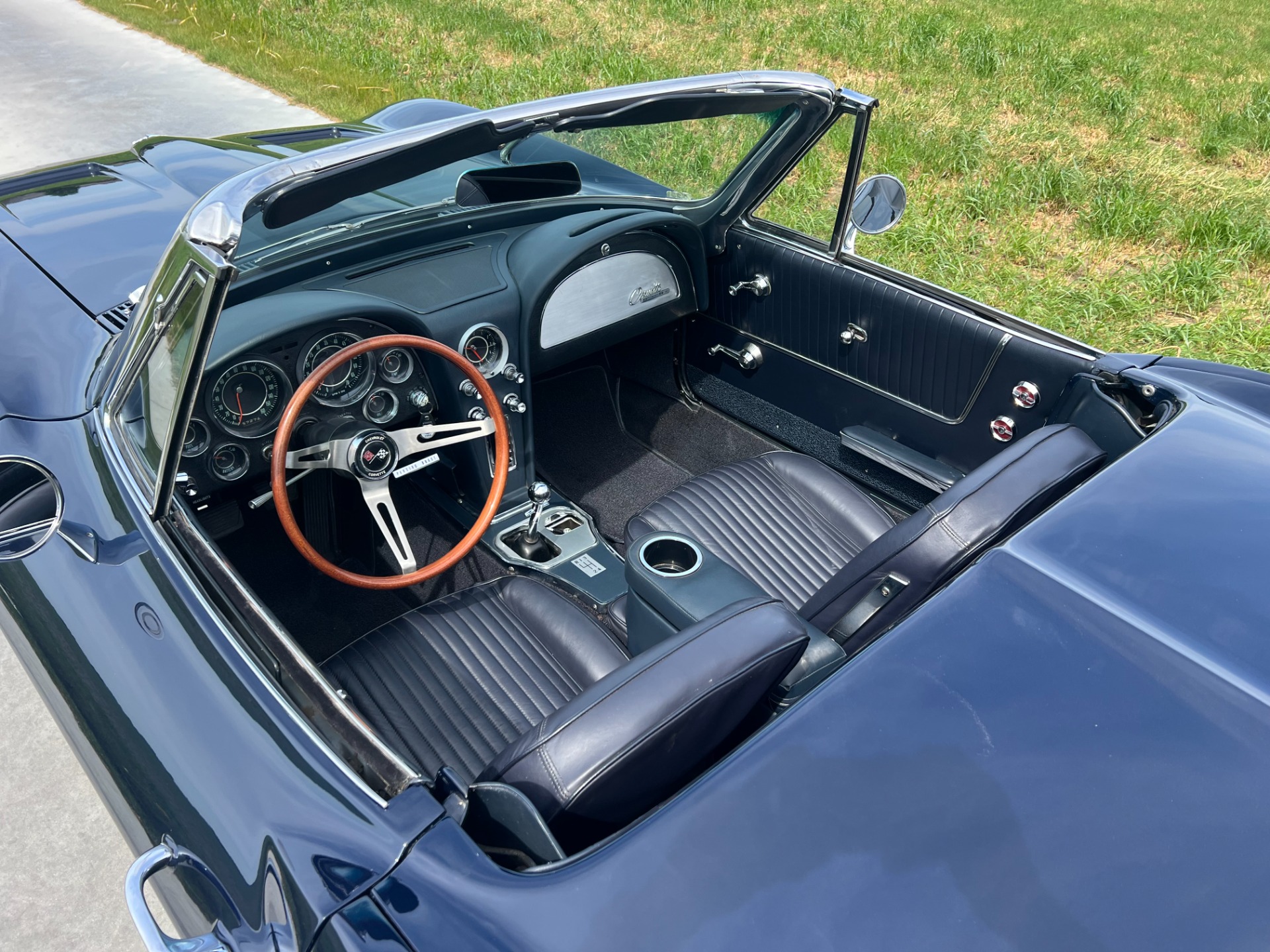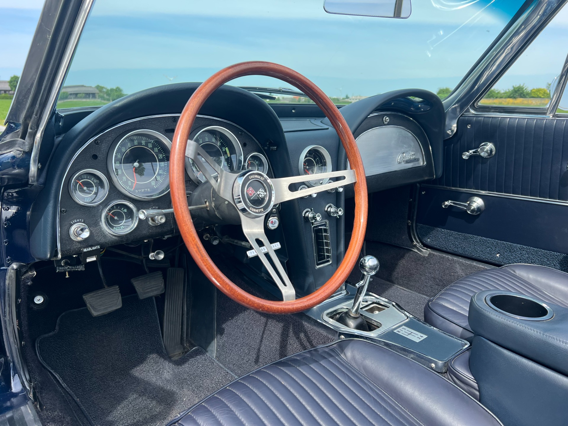 The dark blue interior of this 1964 Corvette C2 Convertible complements its Daytona Blue exterior with a rich, cohesive look. It features bucket seats, a dual-cockpit dash, full instrumentation, and chrome accents—classic and clean, with a distinctly sporty edge.