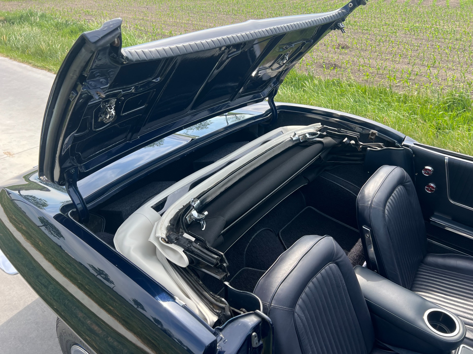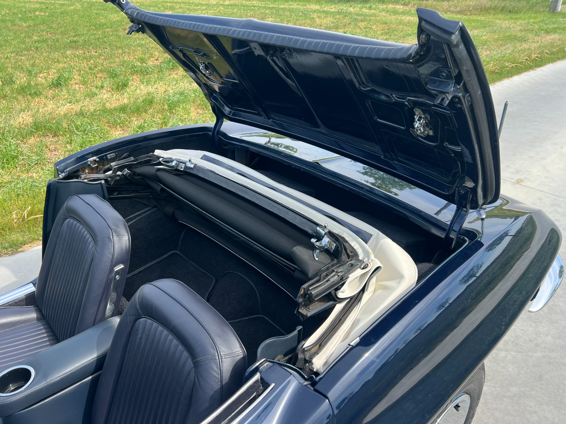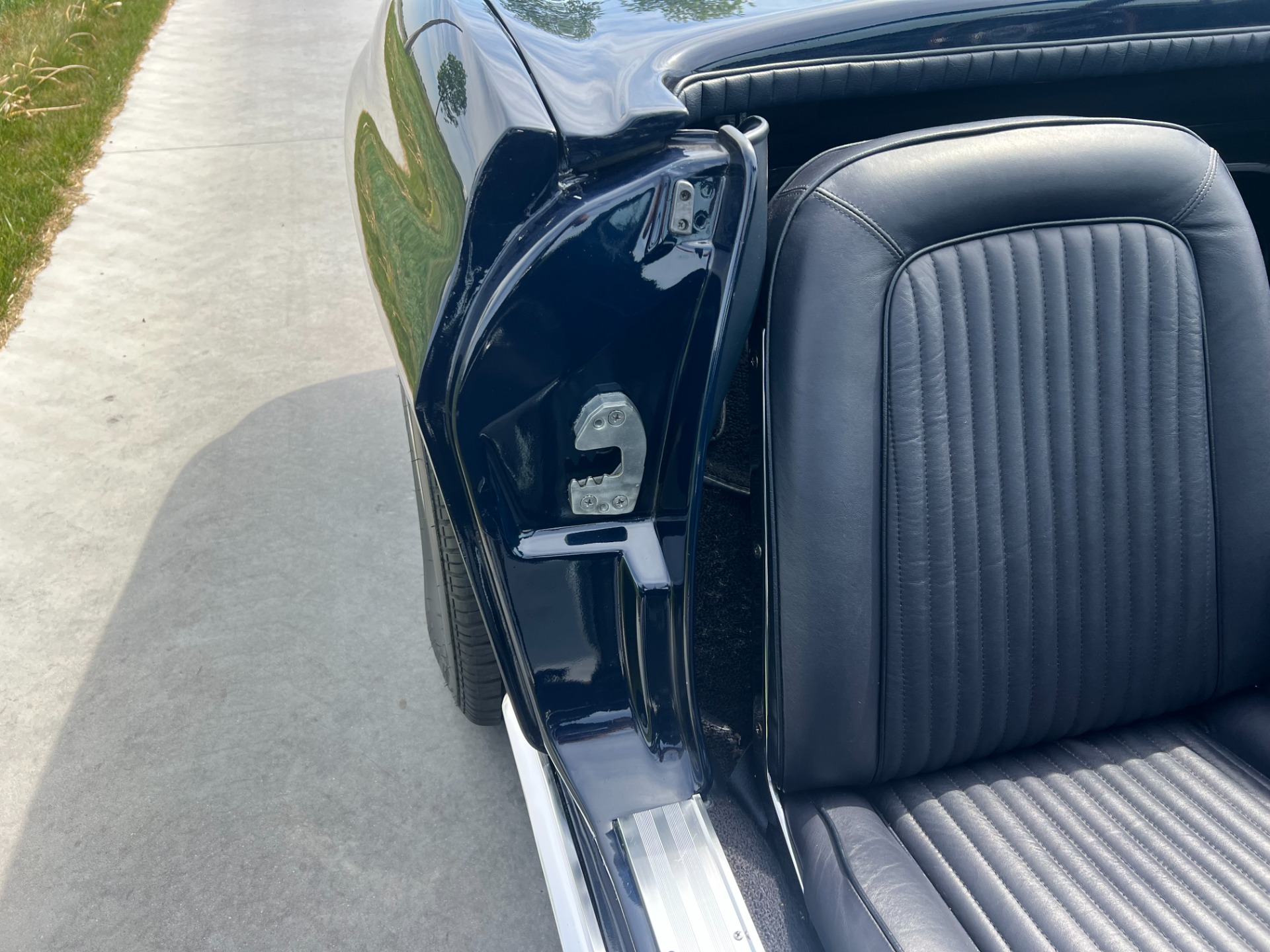 Paint has been redone and is in splendid condition. Chrome was also restored and looks very nice. The white vinyl soft top is also brand new and looks great on the blue paint.