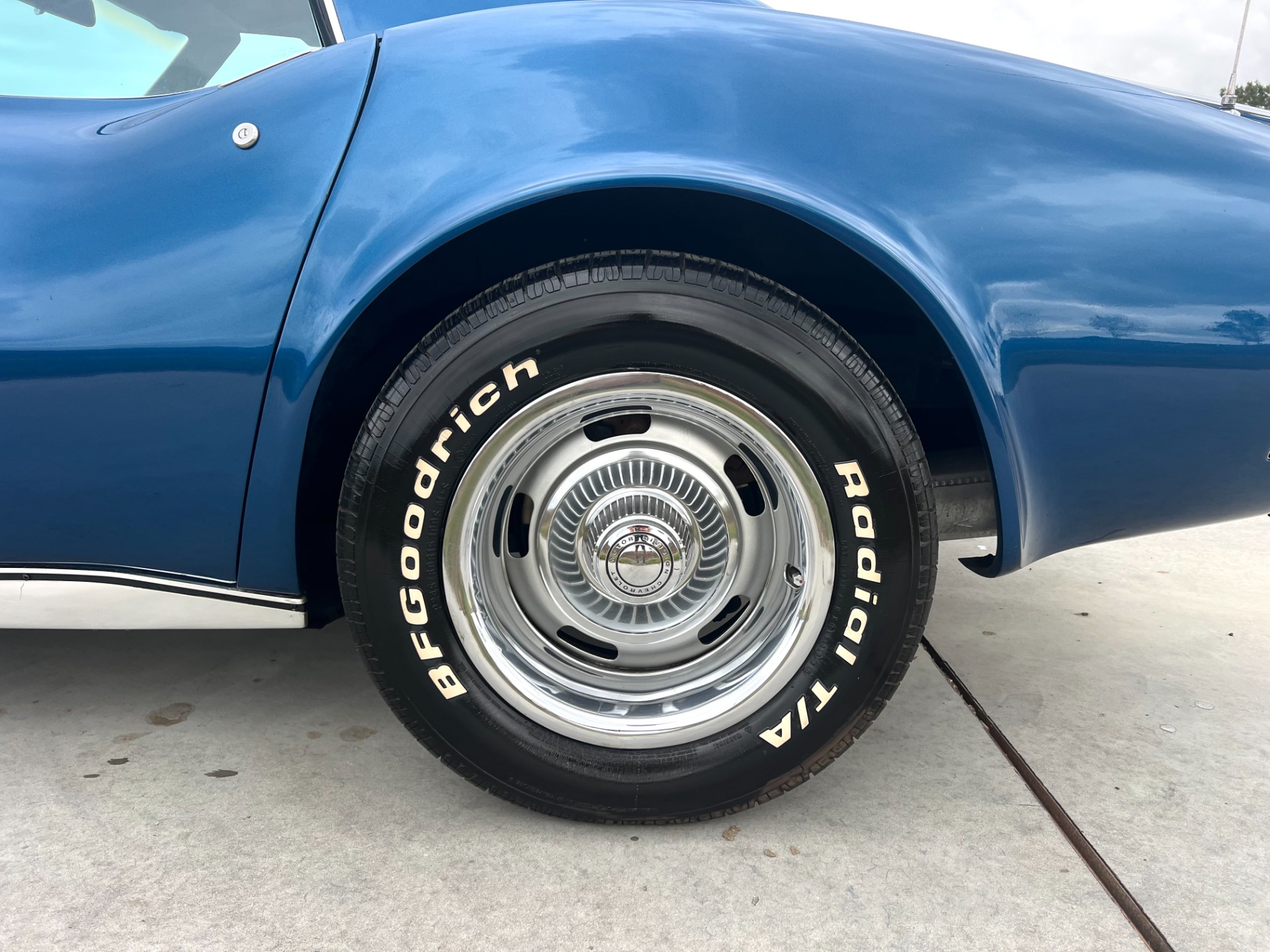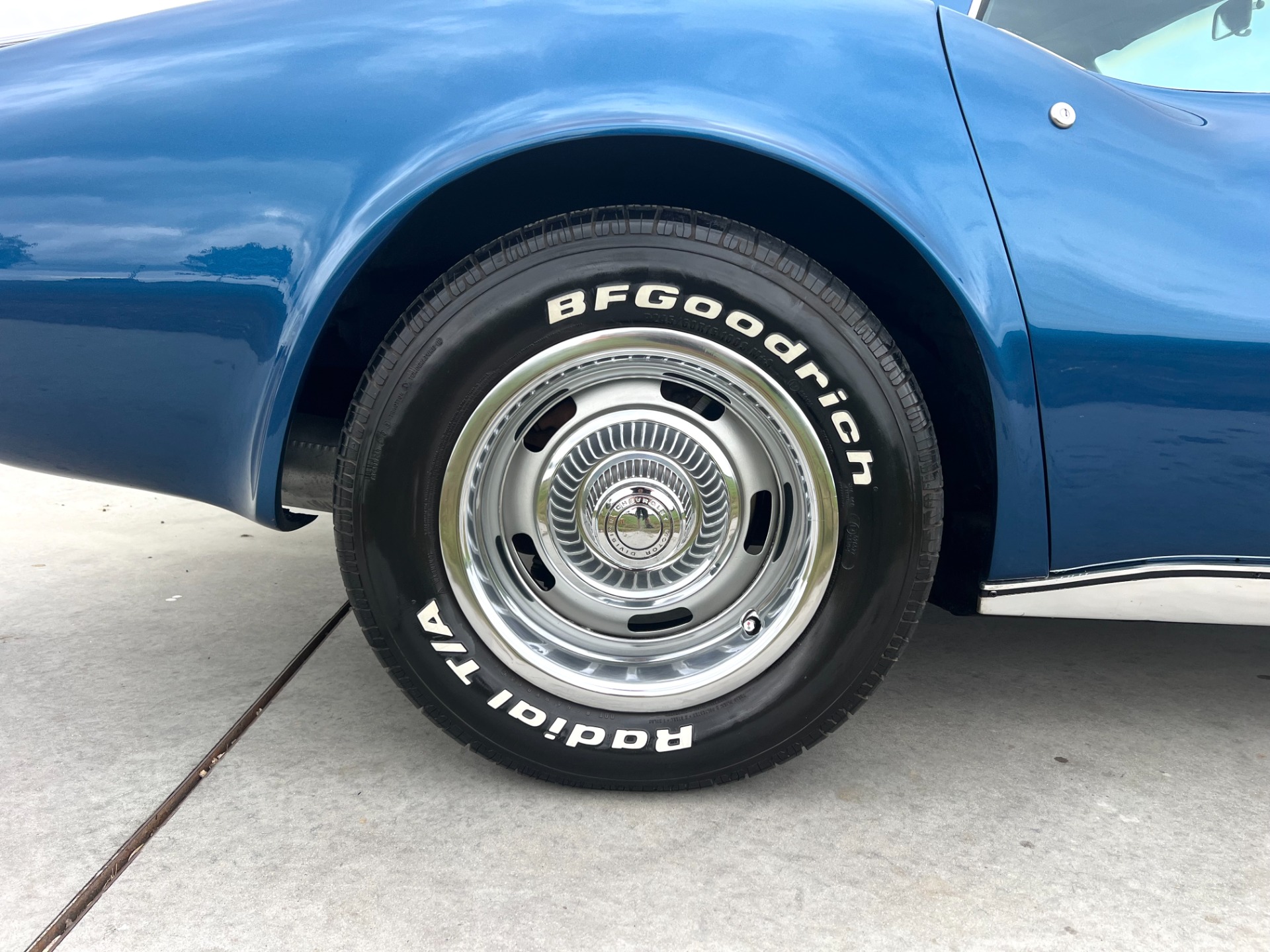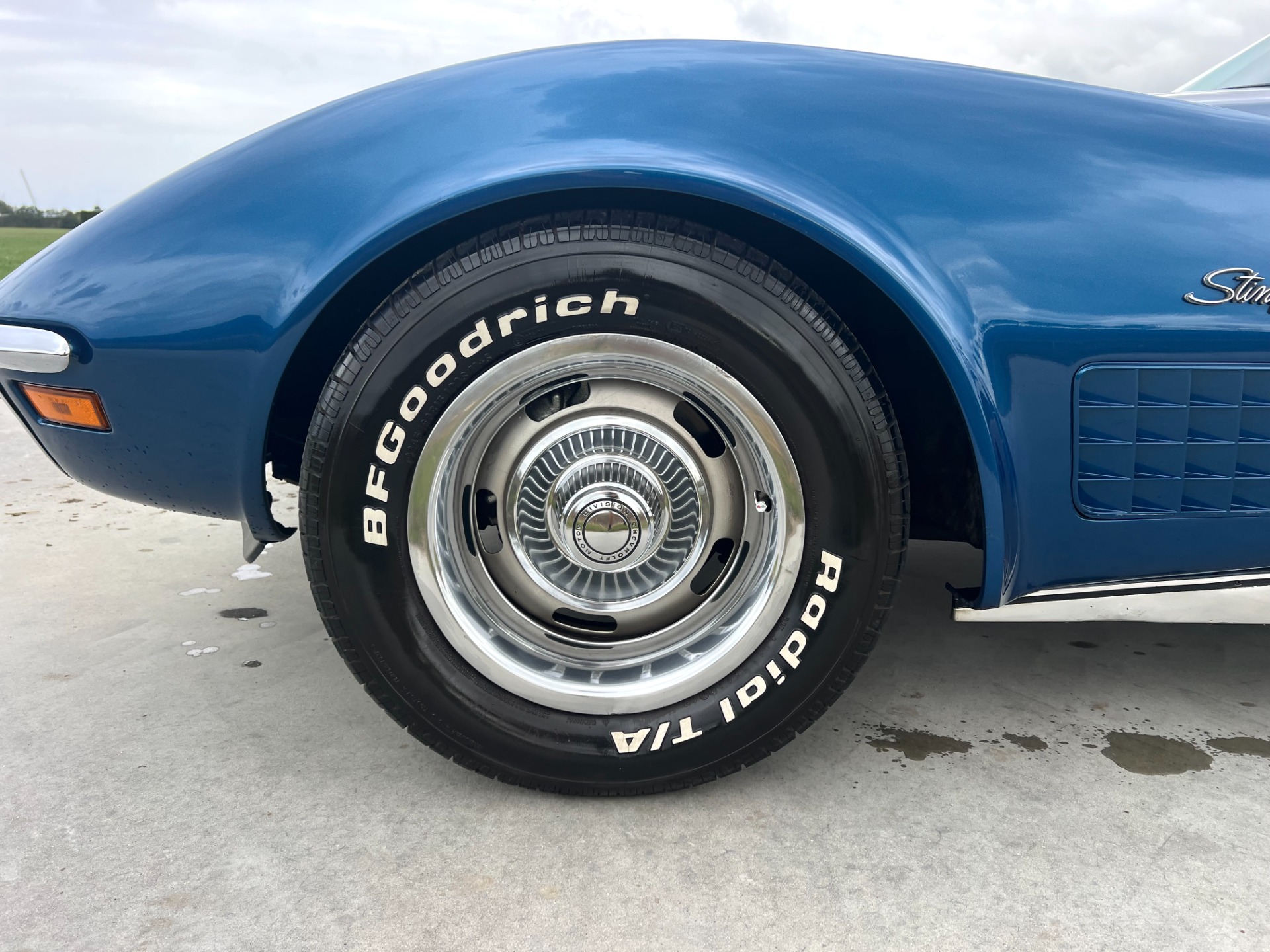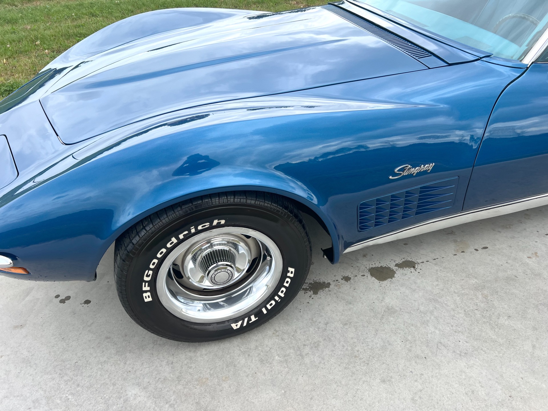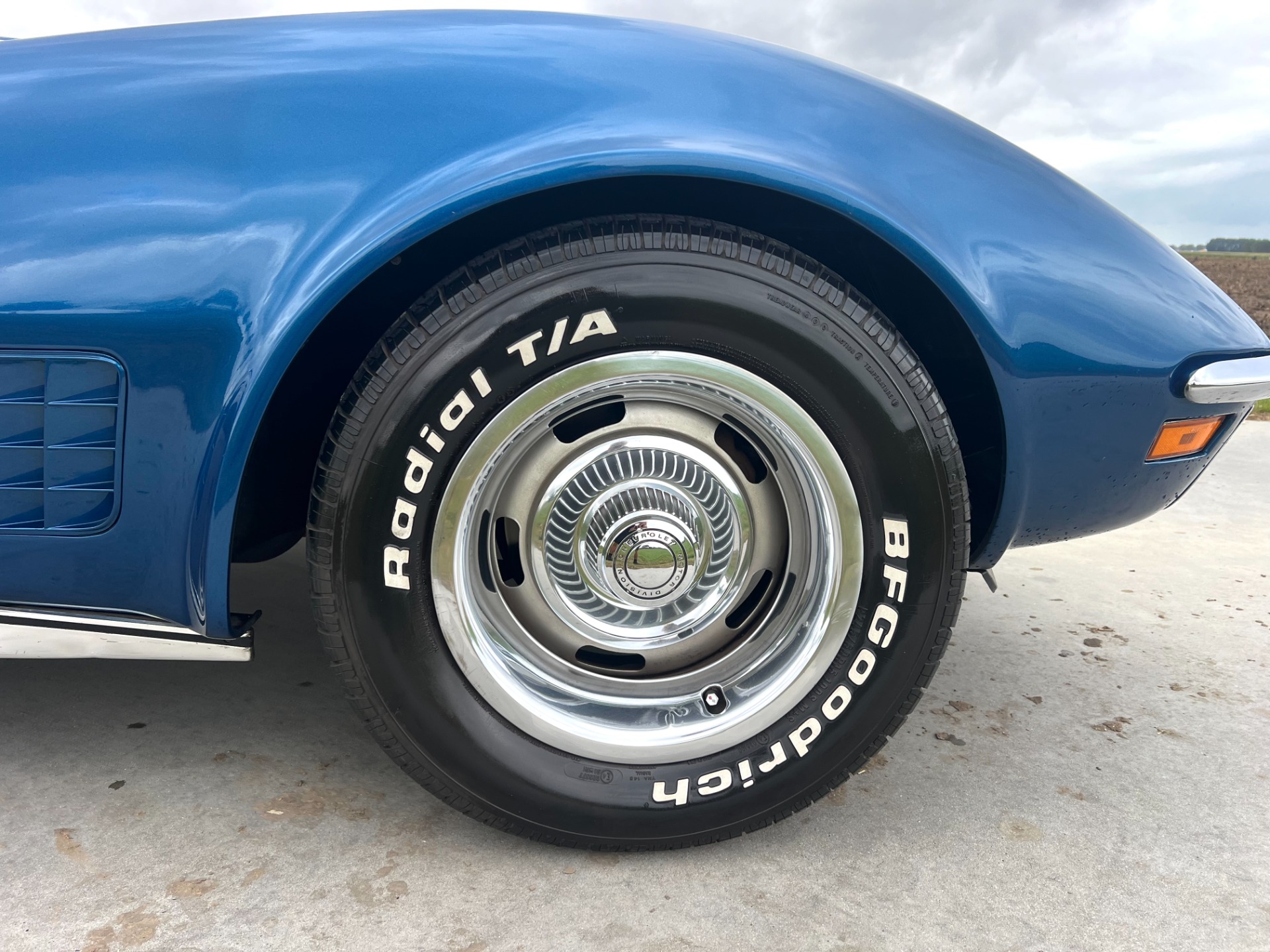 This 1970 Chevrolet Corvette Stingray is finished in its desirable Mulsanne Blue, a color that perfectly complements the car's iconic C3 "shark" styling. The paint presents very well, with a deep gloss and only minor, nearly invisible imperfections. Chrome trim, including bumpers and window surrounds, is in excellent condition and enhances the overall presentation. Period-correct rally wheels with BFGoodrich Radial T/A tires complete the look. With its long sculpted hood, pop-up headlights, and flared fenders, this Corvette remains a standout example of early 1970s American sports car design.