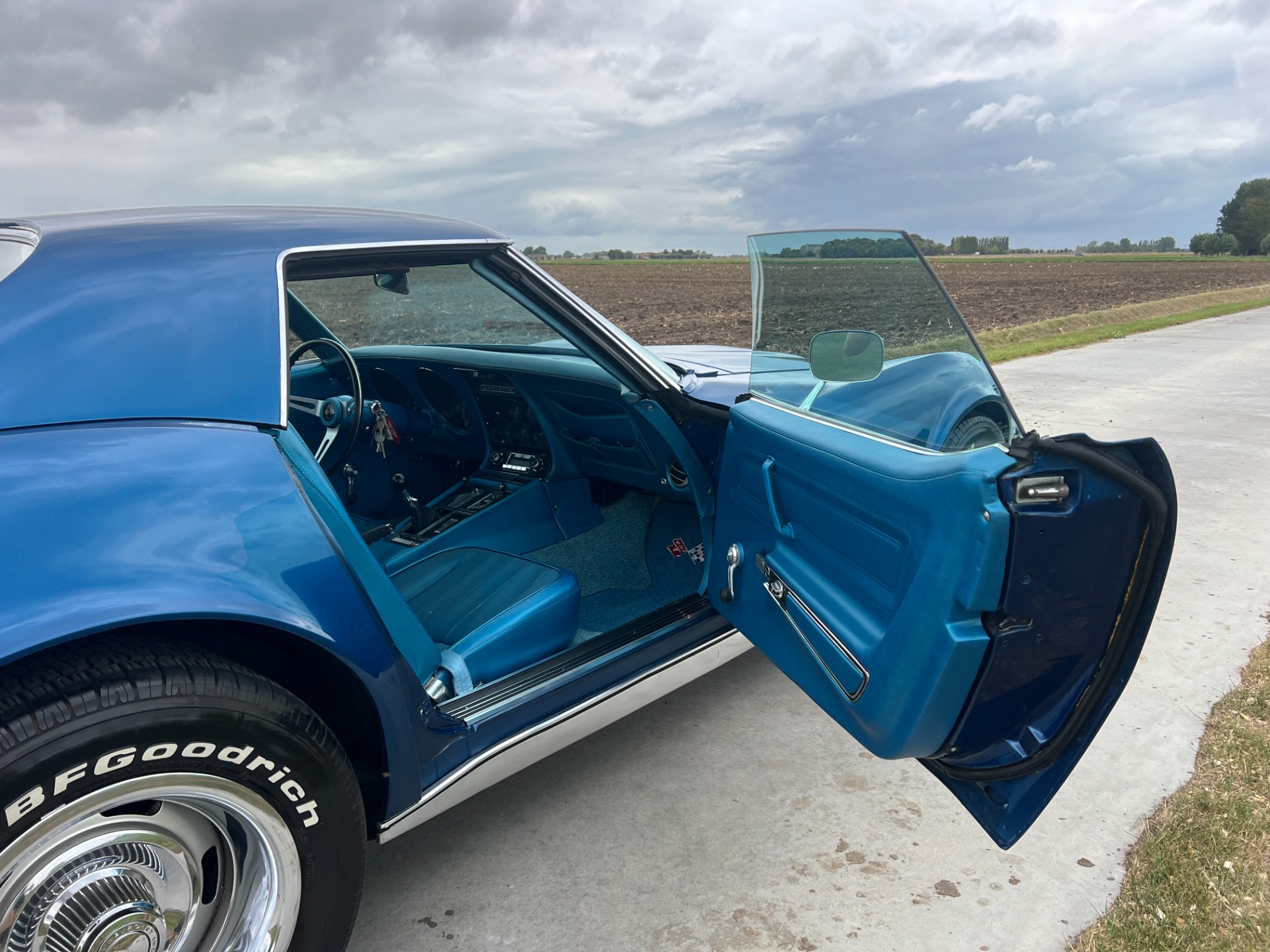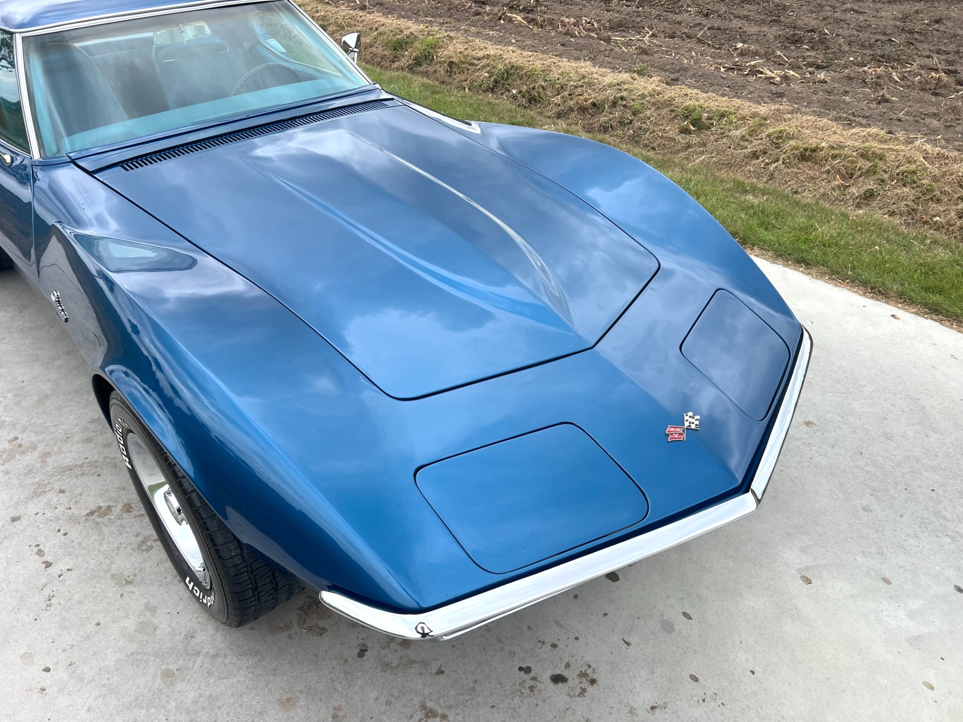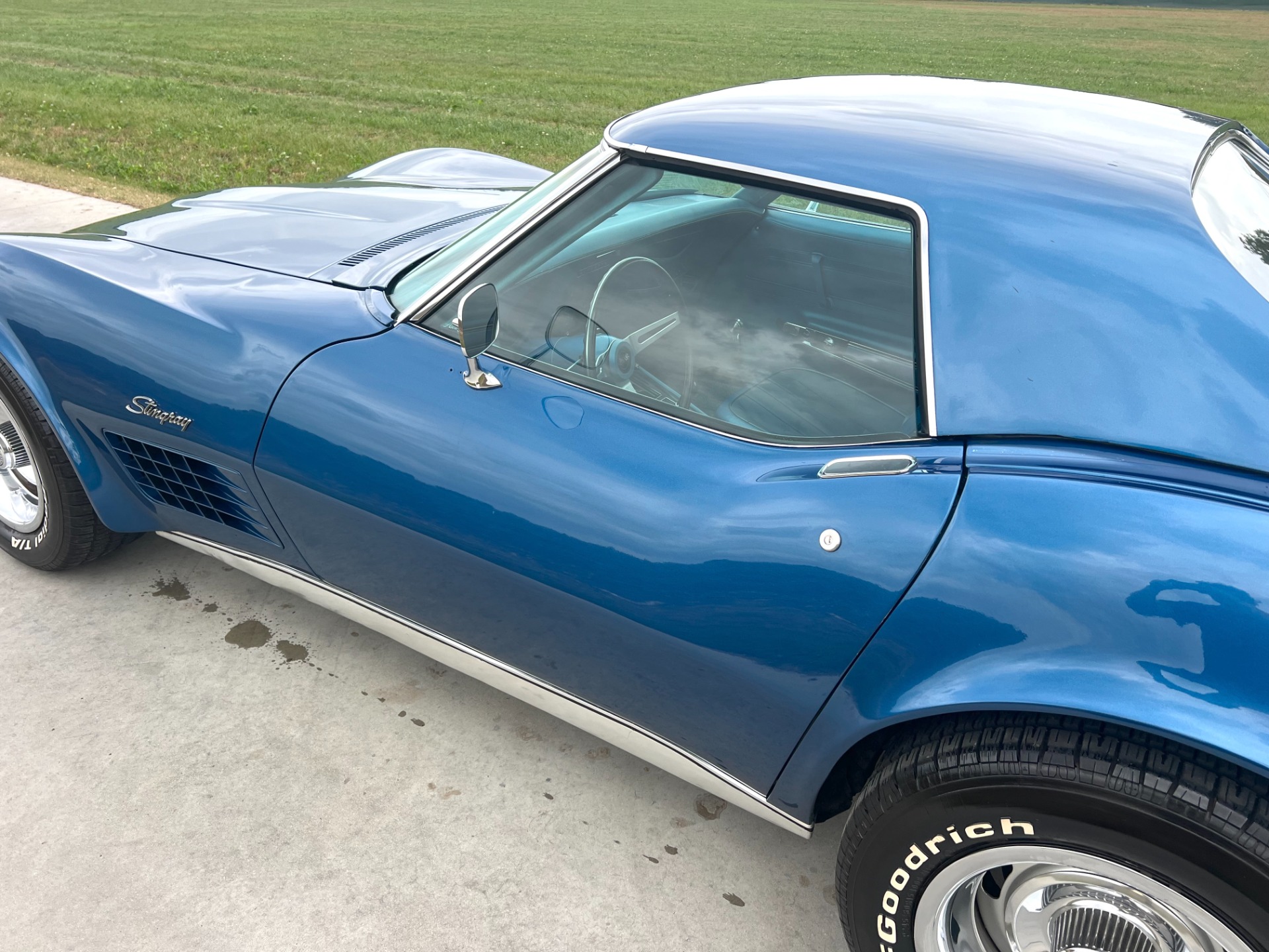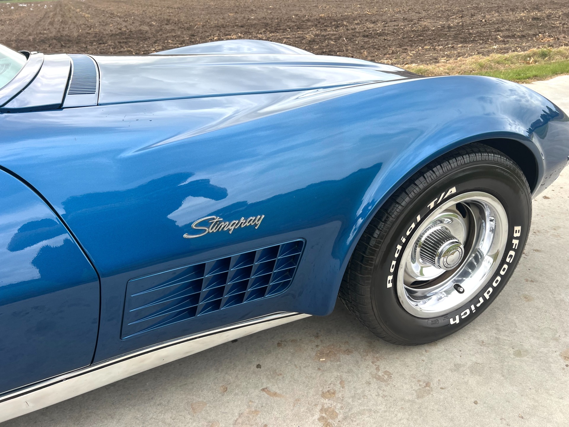 This 1970 Chevrolet Corvette Stingray is finished in its desirable Mulsanne Blue, a color that perfectly complements the car's iconic C3 "shark" styling. The paint presents very well, with a deep gloss and only minor, nearly invisible imperfections. Chrome trim, including bumpers and window surrounds, is in excellent condition and enhances the overall presentation. Period-correct rally wheels with BFGoodrich Radial T/A tires complete the look. With its long sculpted hood, pop-up headlights, and flared fenders, this Corvette remains a standout example of early 1970s American sports car design.