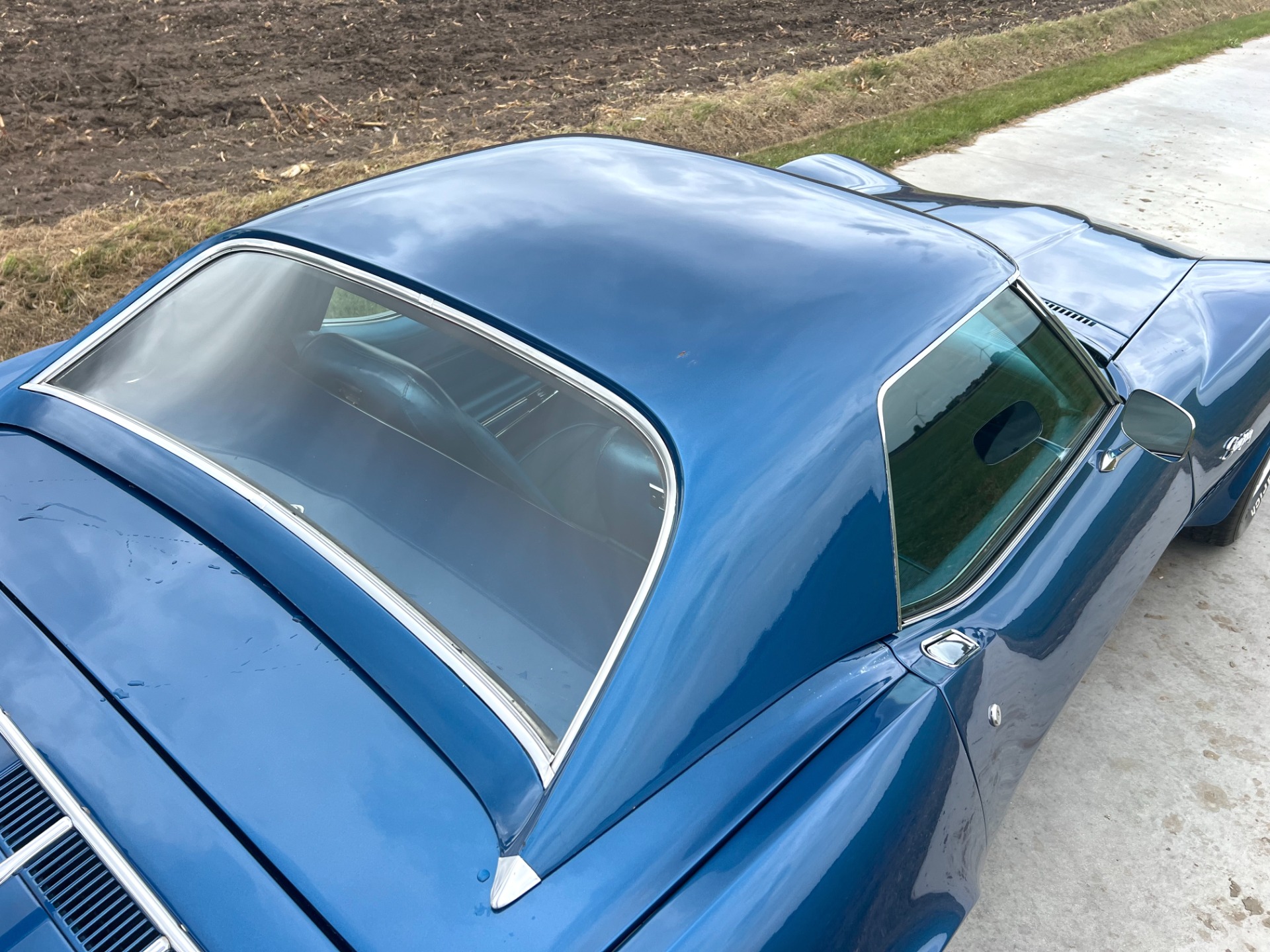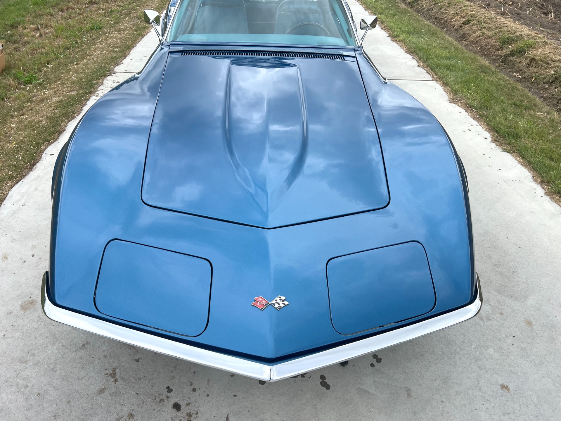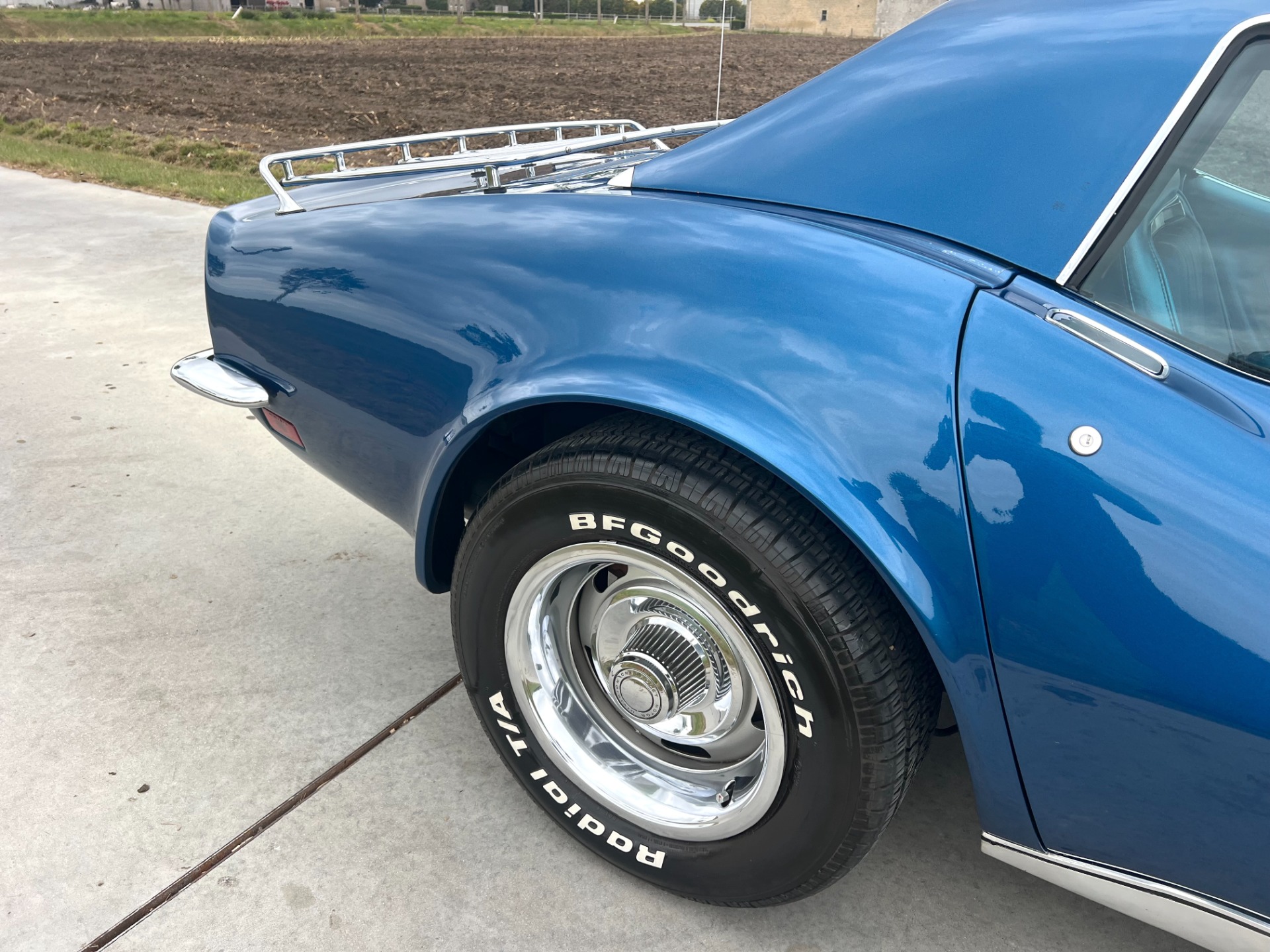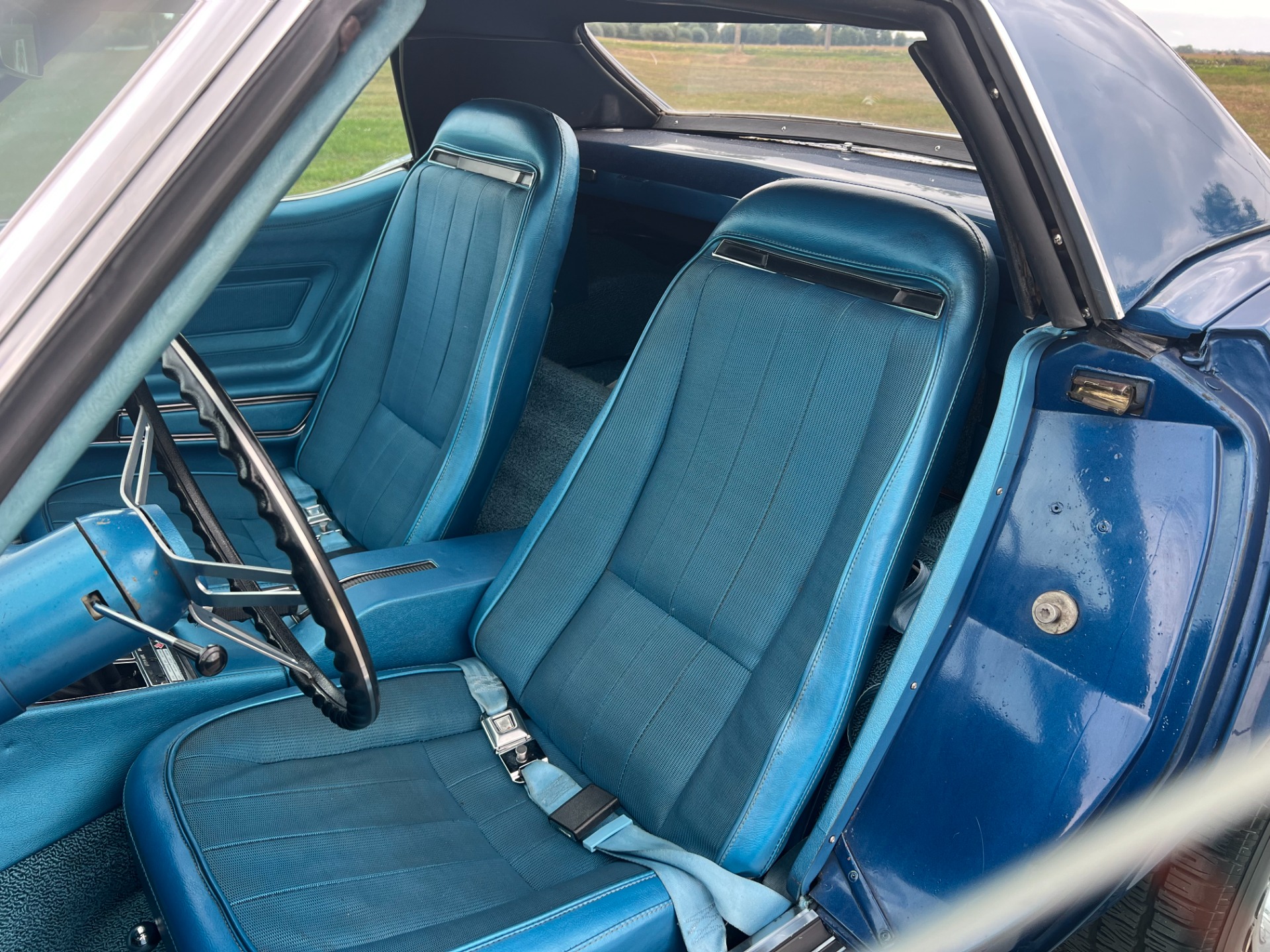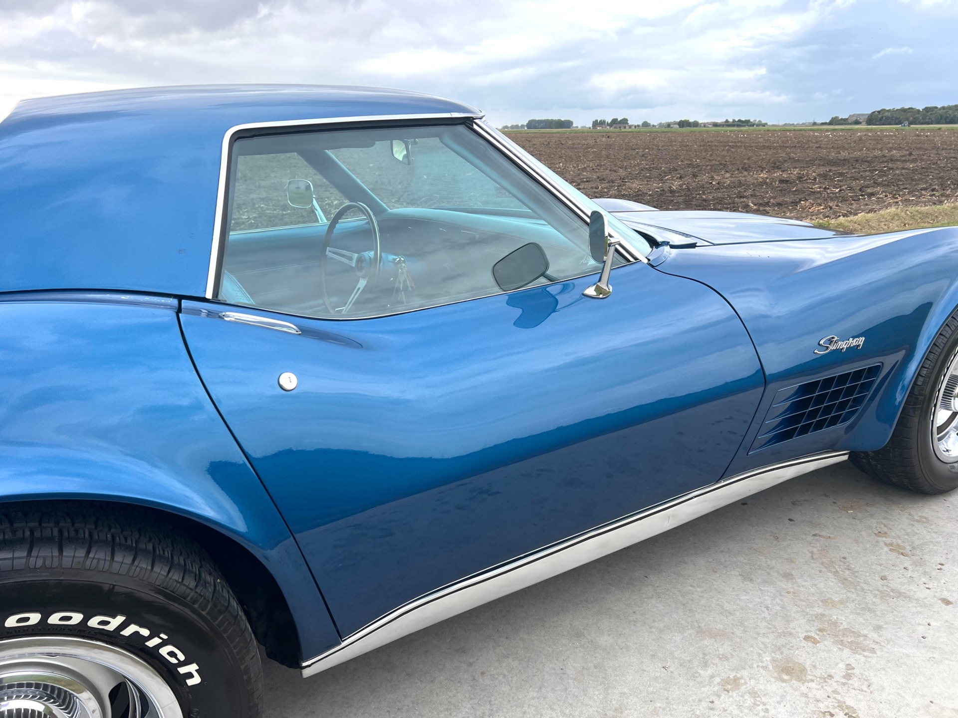 This 1970 Chevrolet Corvette Stingray is finished in its desirable Mulsanne Blue, a color that perfectly complements the car's iconic C3 "shark" styling. The paint presents very well, with a deep gloss and only minor, nearly invisible imperfections. Chrome trim, including bumpers and window surrounds, is in excellent condition and enhances the overall presentation. Period-correct rally wheels with BFGoodrich Radial T/A tires complete the look. With its long sculpted hood, pop-up headlights, and flared fenders, this Corvette remains a standout example of early 1970s American sports car design.