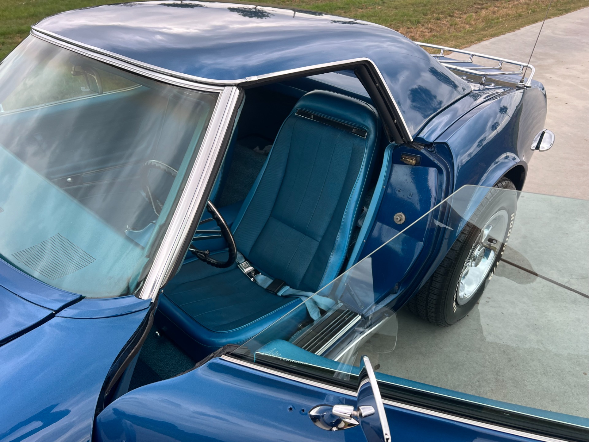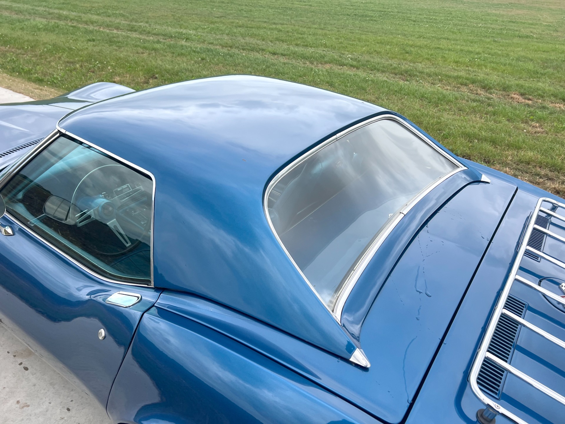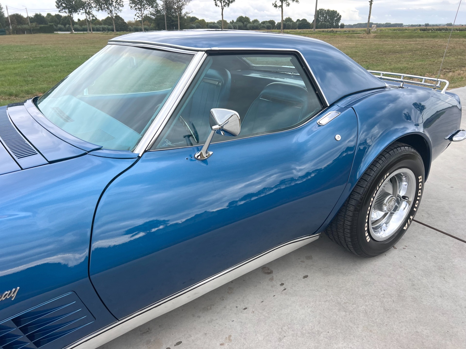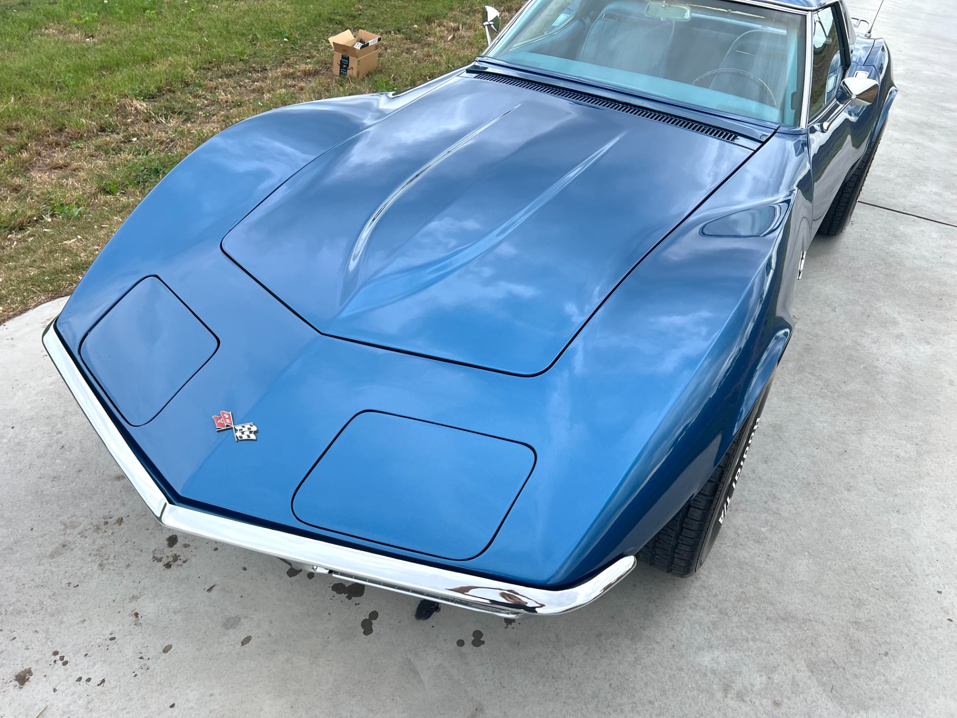 This 1970 Chevrolet Corvette Stingray is finished in its desirable Mulsanne Blue, a color that perfectly complements the car's iconic C3 "shark" styling. The paint presents very well, with a deep gloss and only minor, nearly invisible imperfections. Chrome trim, including bumpers and window surrounds, is in excellent condition and enhances the overall presentation. Period-correct rally wheels with BFGoodrich Radial T/A tires complete the look. With its long sculpted hood, pop-up headlights, and flared fenders, this Corvette remains a standout example of early 1970s American sports car design.