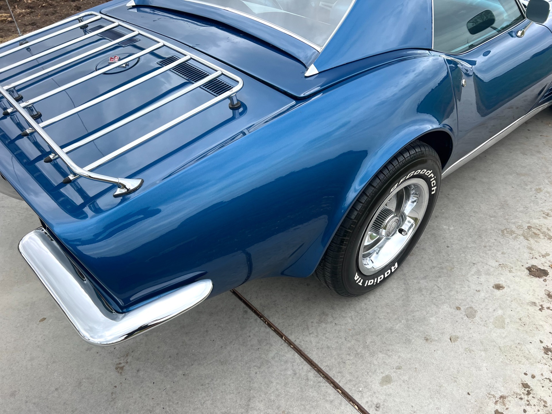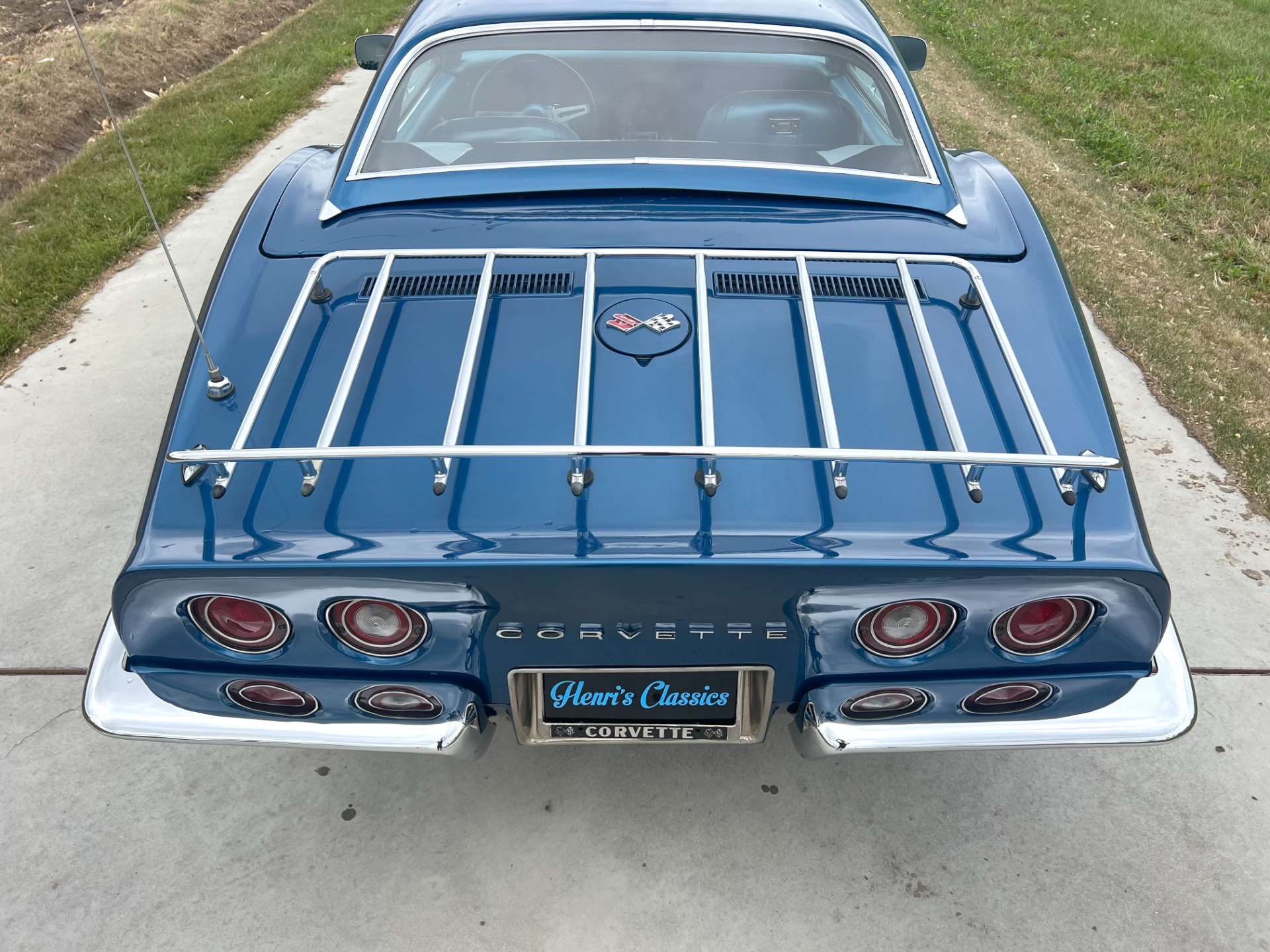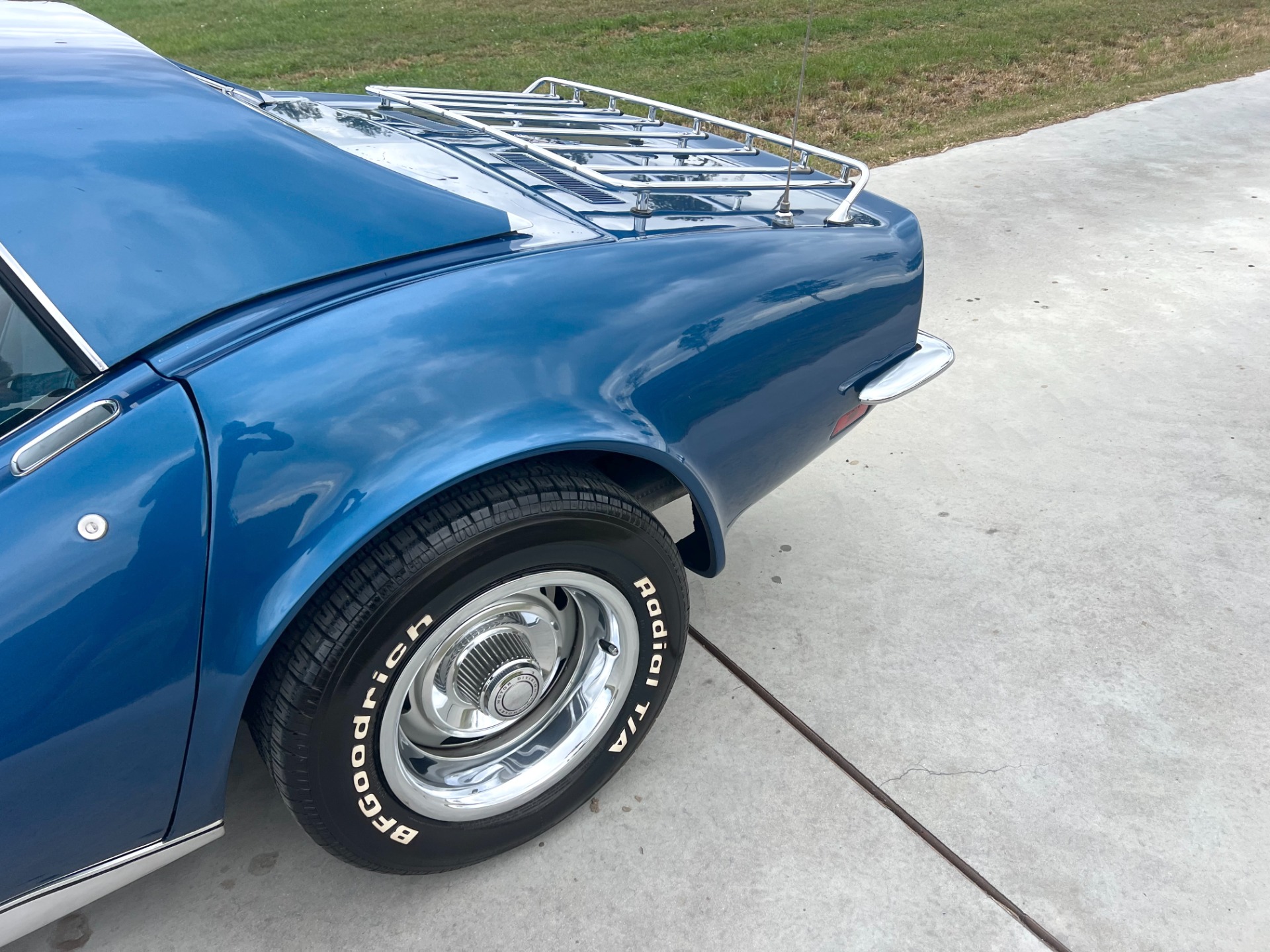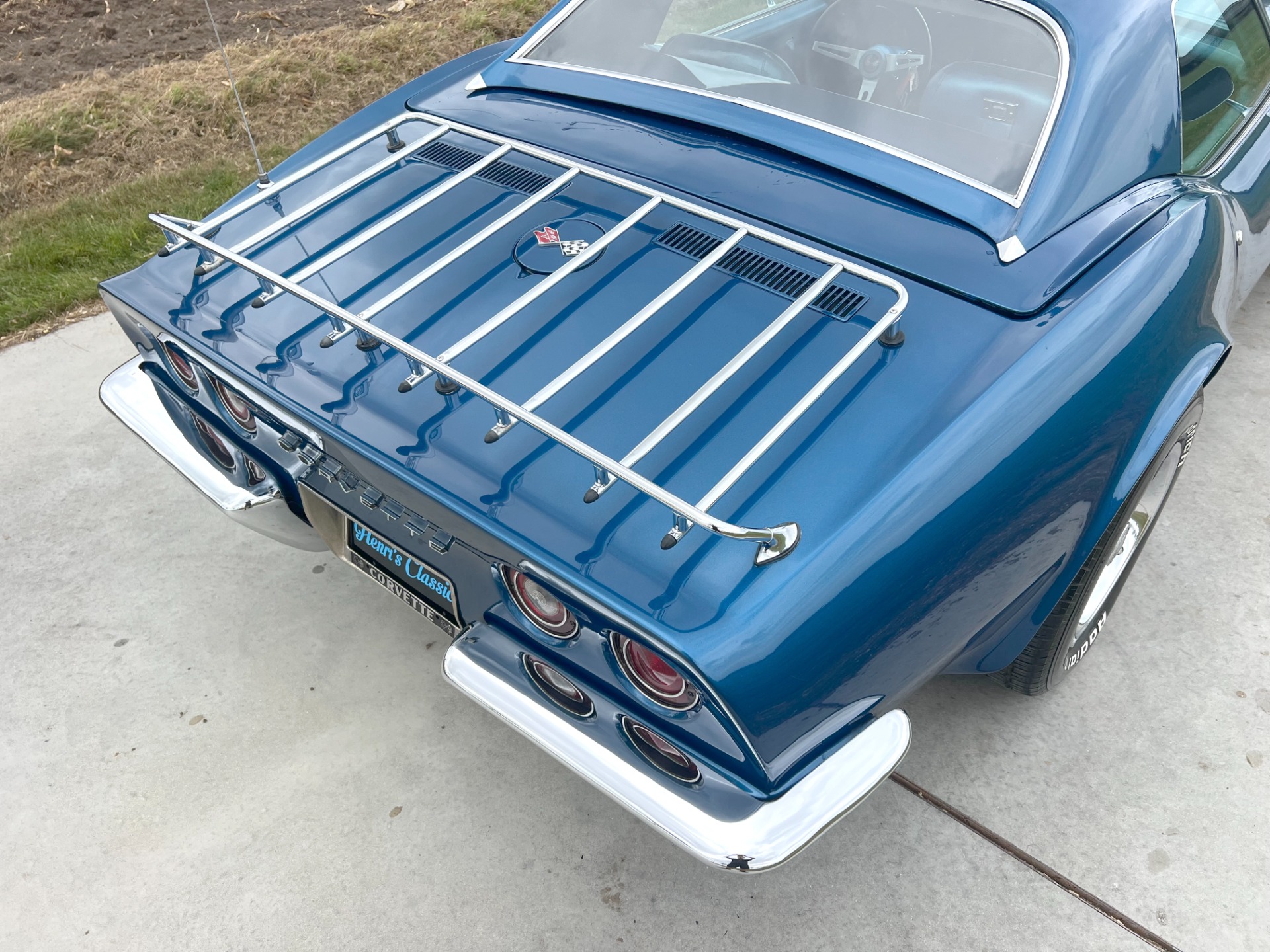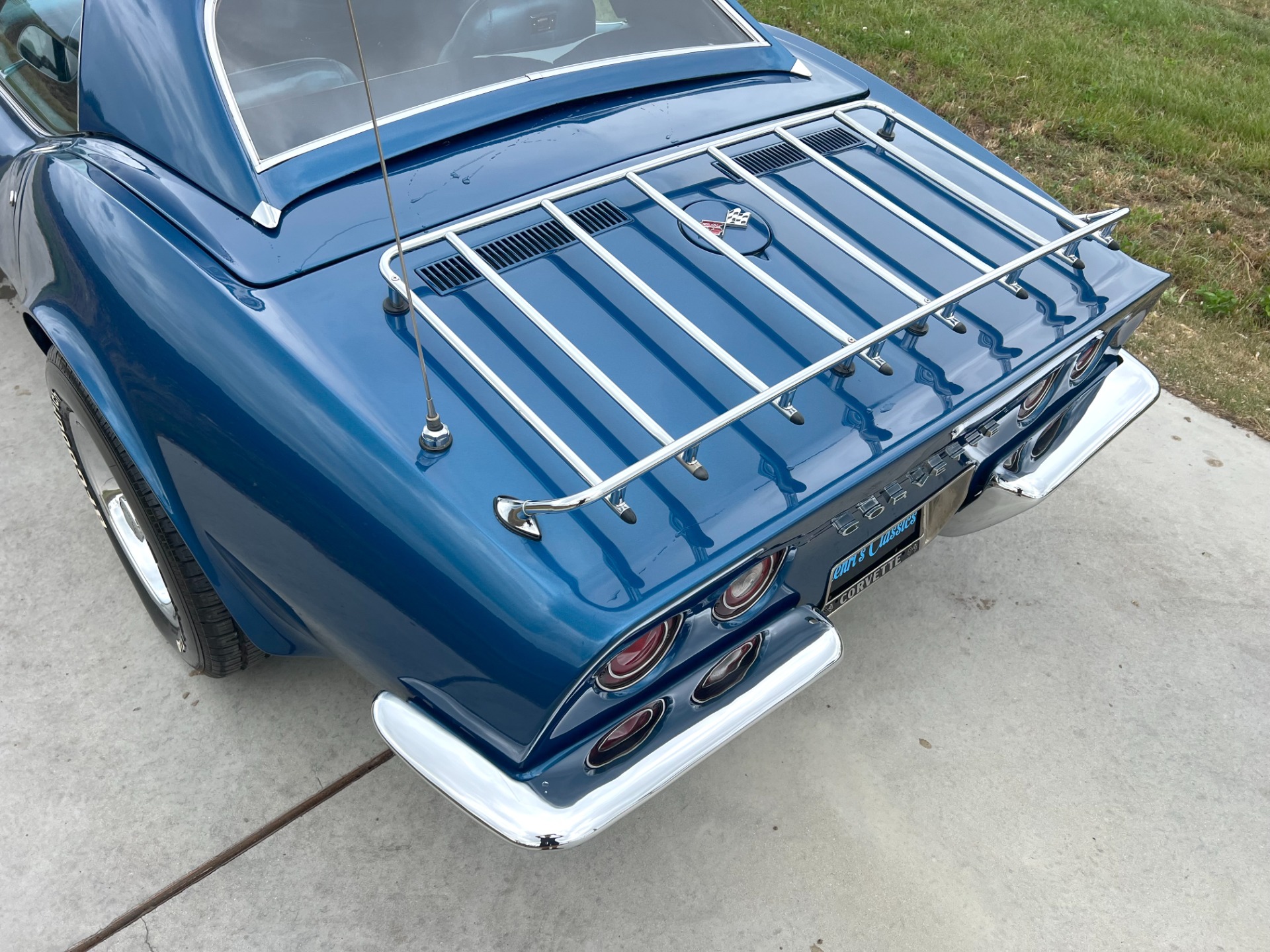 This 1970 Chevrolet Corvette Stingray is finished in its desirable Mulsanne Blue, a color that perfectly complements the car's iconic C3 "shark" styling. The paint presents very well, with a deep gloss and only minor, nearly invisible imperfections. Chrome trim, including bumpers and window surrounds, is in excellent condition and enhances the overall presentation. Period-correct rally wheels with BFGoodrich Radial T/A tires complete the look. With its long sculpted hood, pop-up headlights, and flared fenders, this Corvette remains a standout example of early 1970s American sports car design.