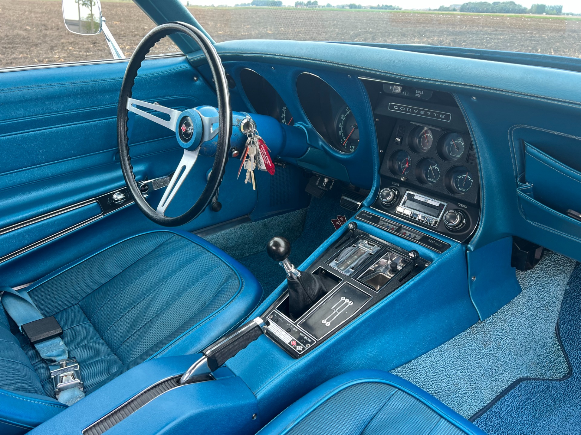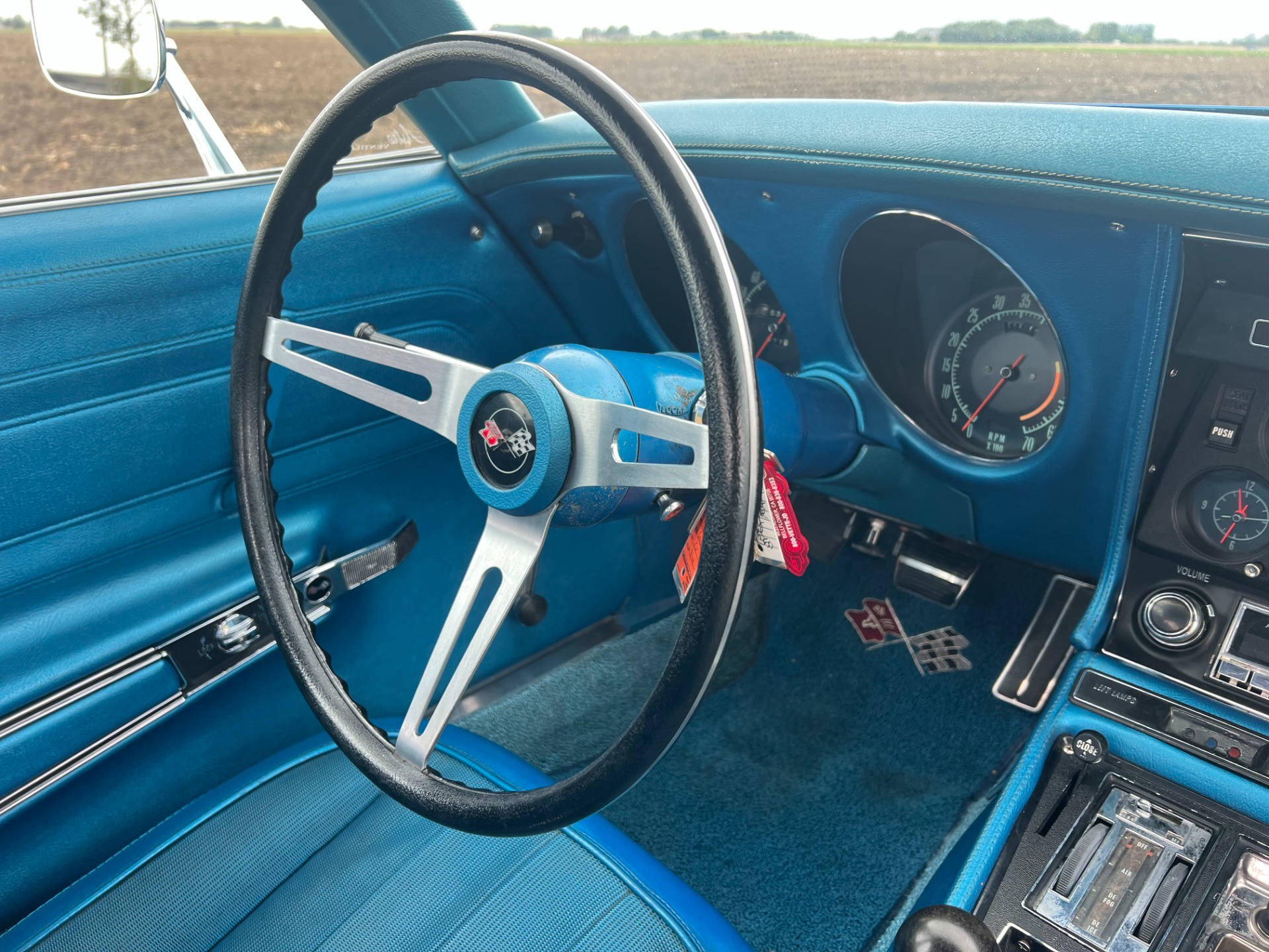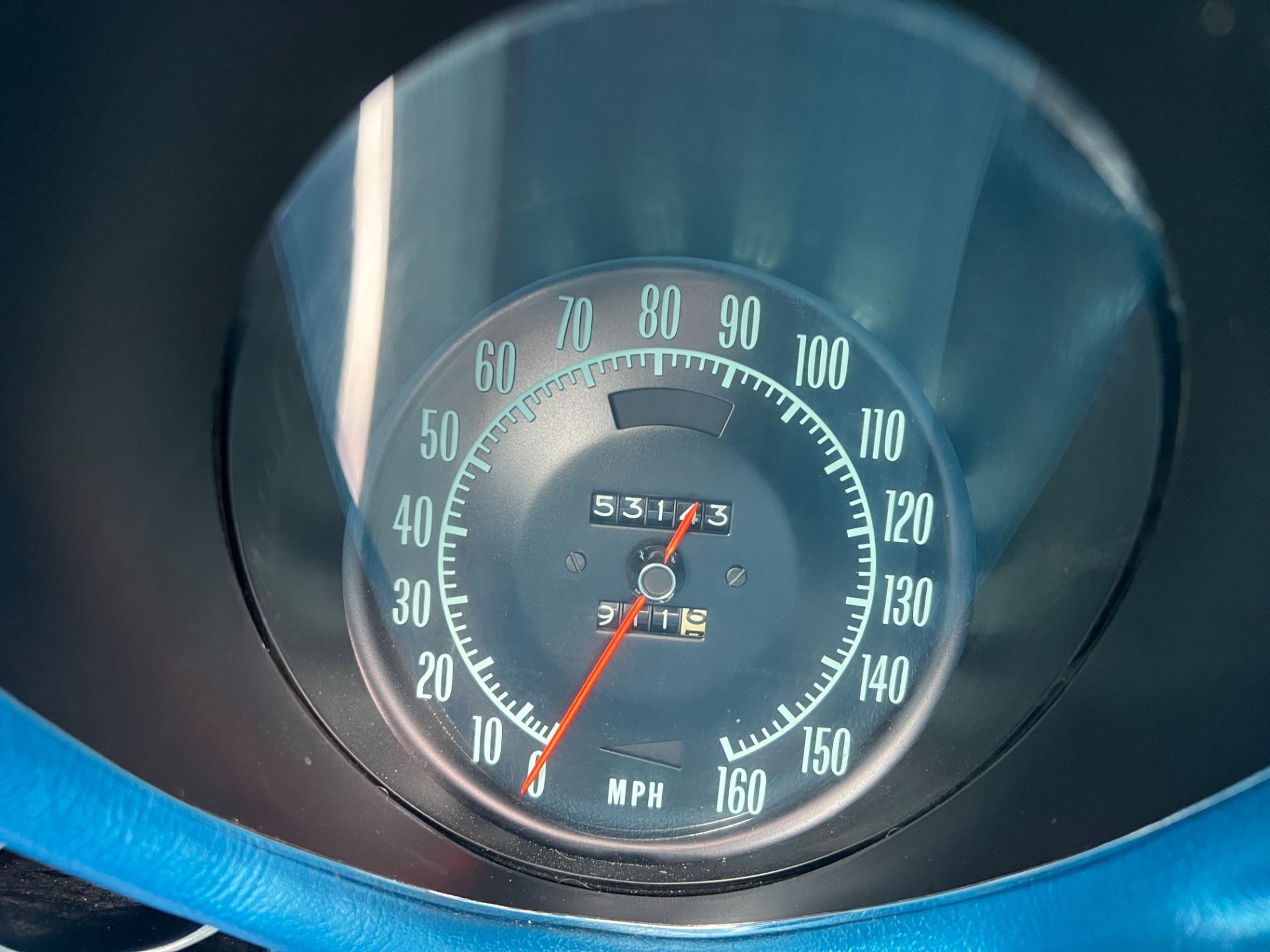 This 1970 Chevrolet Corvette features a striking blue interior that pairs beautifully with its Mulsanne Blue exterior. The cabin is very clean throughout, with seats, door panels, and carpeting all presenting in excellent condition. The dashboard retains its factory layout, and all gauges are fully functional, underscoring the car's well-kept state. Original details such as the three-spoke steering wheel, center console, and chrome accents remain sharp and add to the authentic presentation. Overall, the interior offers a bright, well-preserved environment that enhances the driving experience while showcasing classic Corvette character.