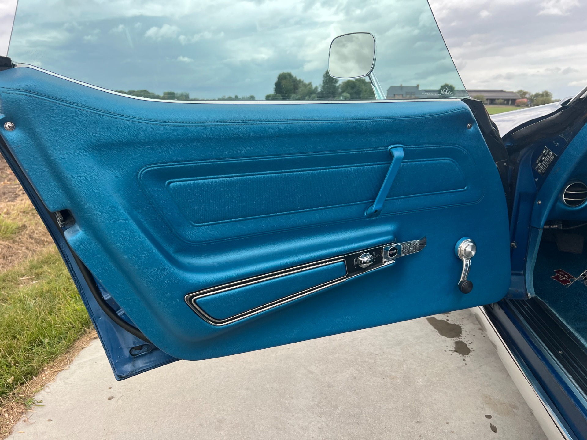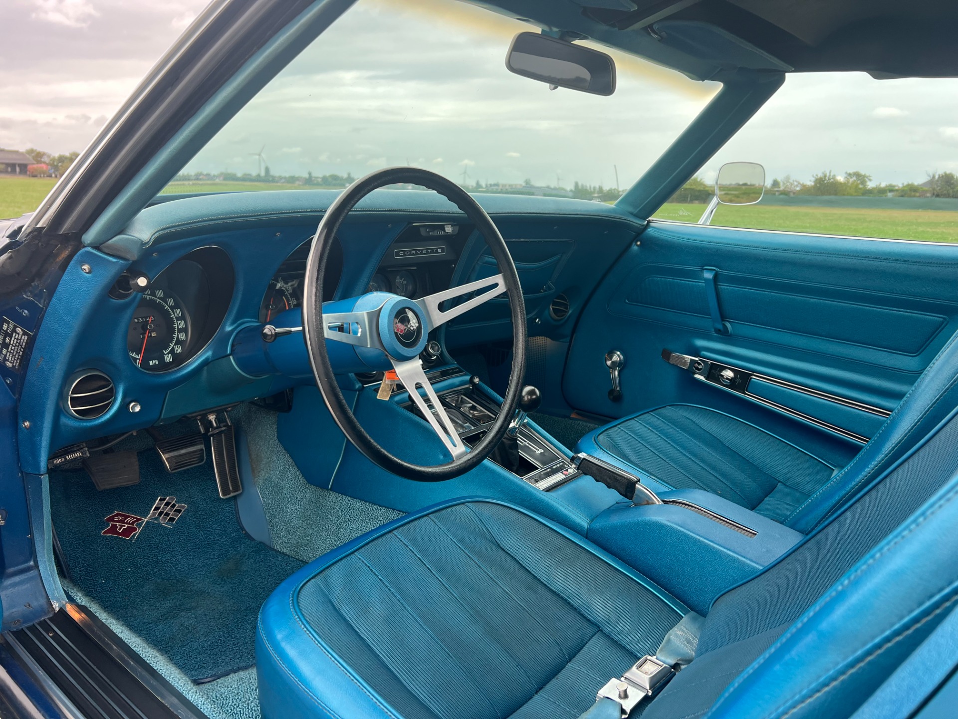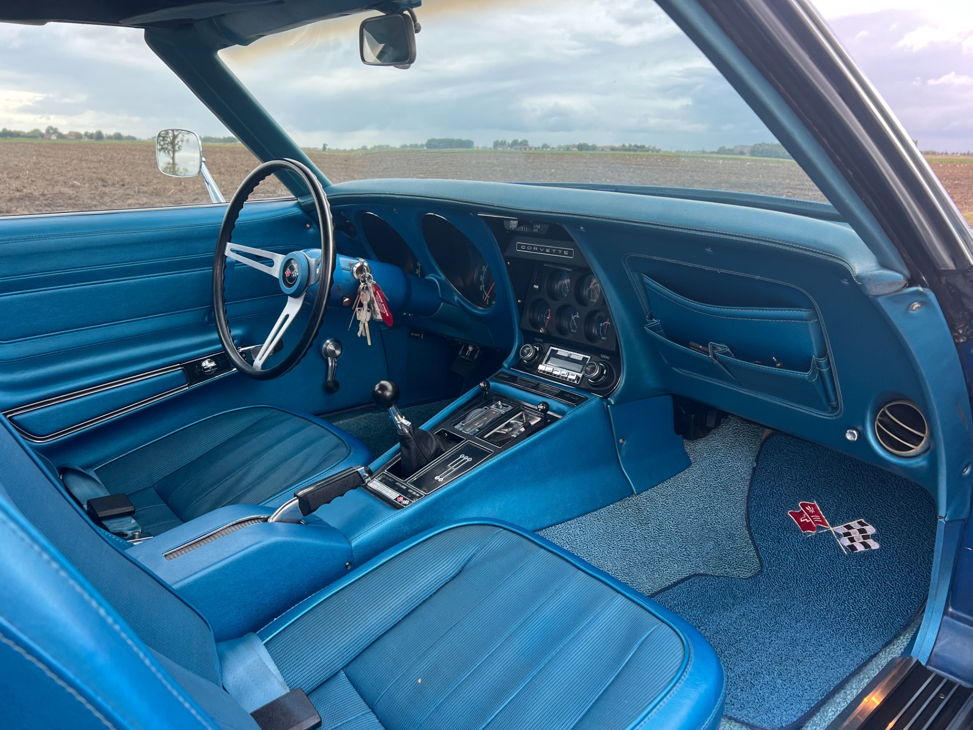 This 1970 Chevrolet Corvette features a striking blue interior that pairs beautifully with its Mulsanne Blue exterior. The cabin is very clean throughout, with seats, door panels, and carpeting all presenting in excellent condition. The dashboard retains its factory layout, and all gauges are fully functional, underscoring the car's well-kept state. Original details such as the three-spoke steering wheel, center console, and chrome accents remain sharp and add to the authentic presentation. Overall, the interior offers a bright, well-preserved environment that enhances the driving experience while showcasing classic Corvette character.