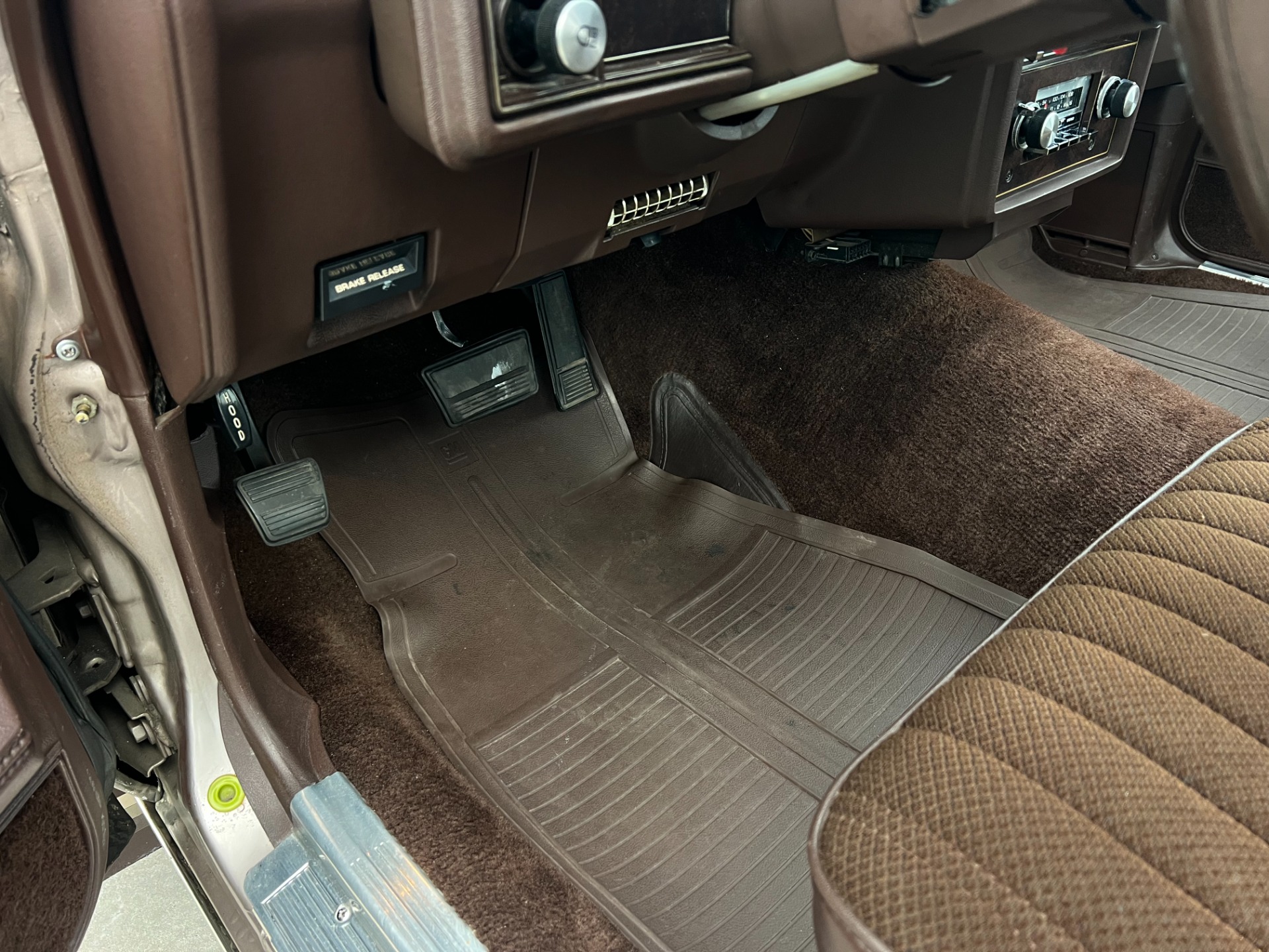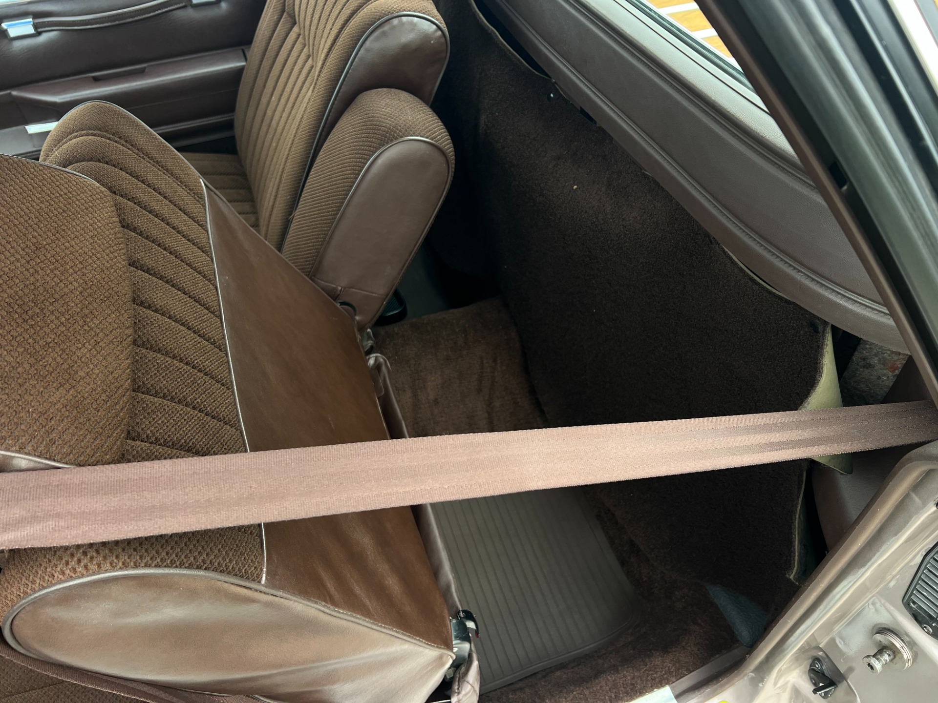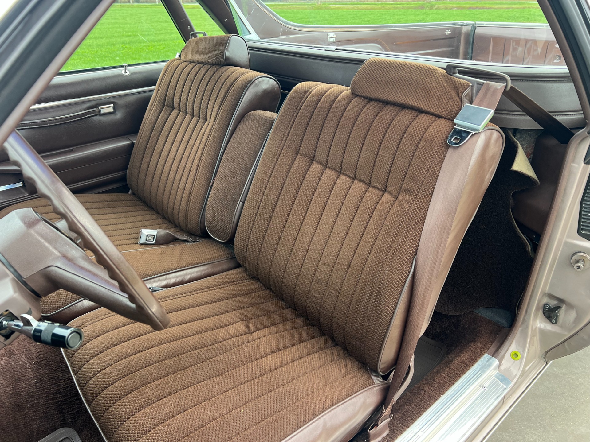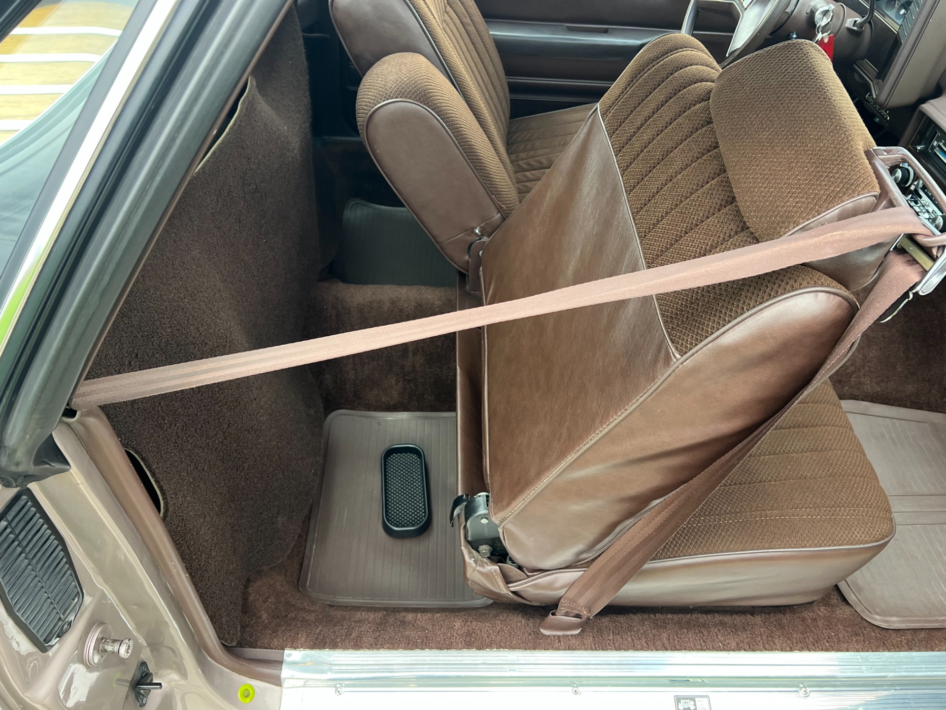 Clean and well-preserved interior featuring original brown upholstery, matching carpets, and classic faux-wood trim. The cabin shows minimal wear, with a tidy dashboard, functional controls, and a period-correct factory radio. Bench seat, door panels, and headliner are all in excellent condition, reflecting careful ownership and true originality throughout.
