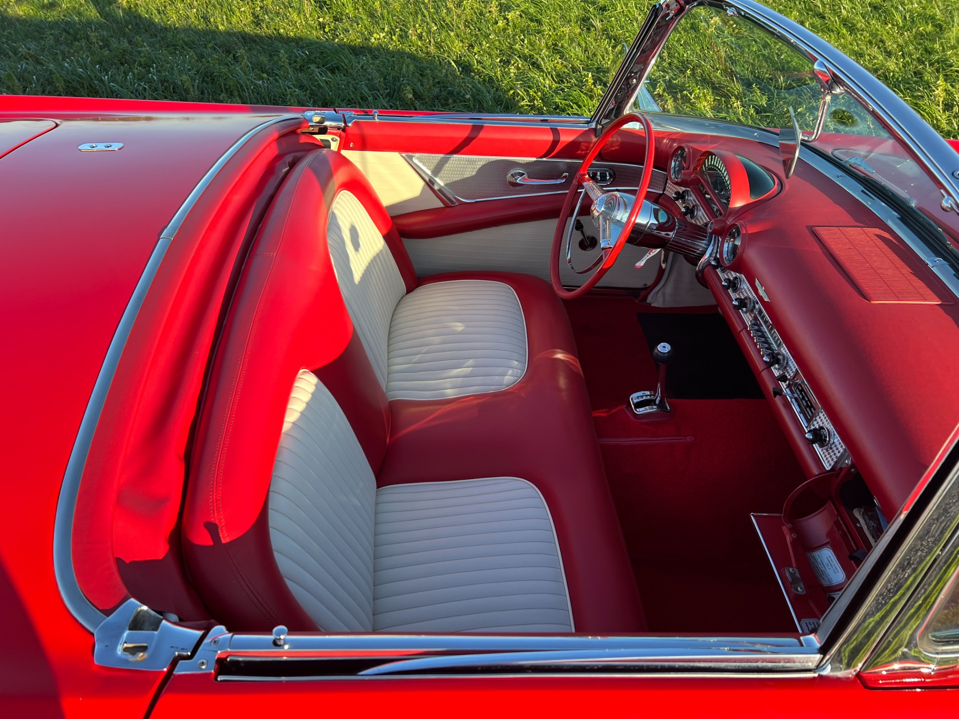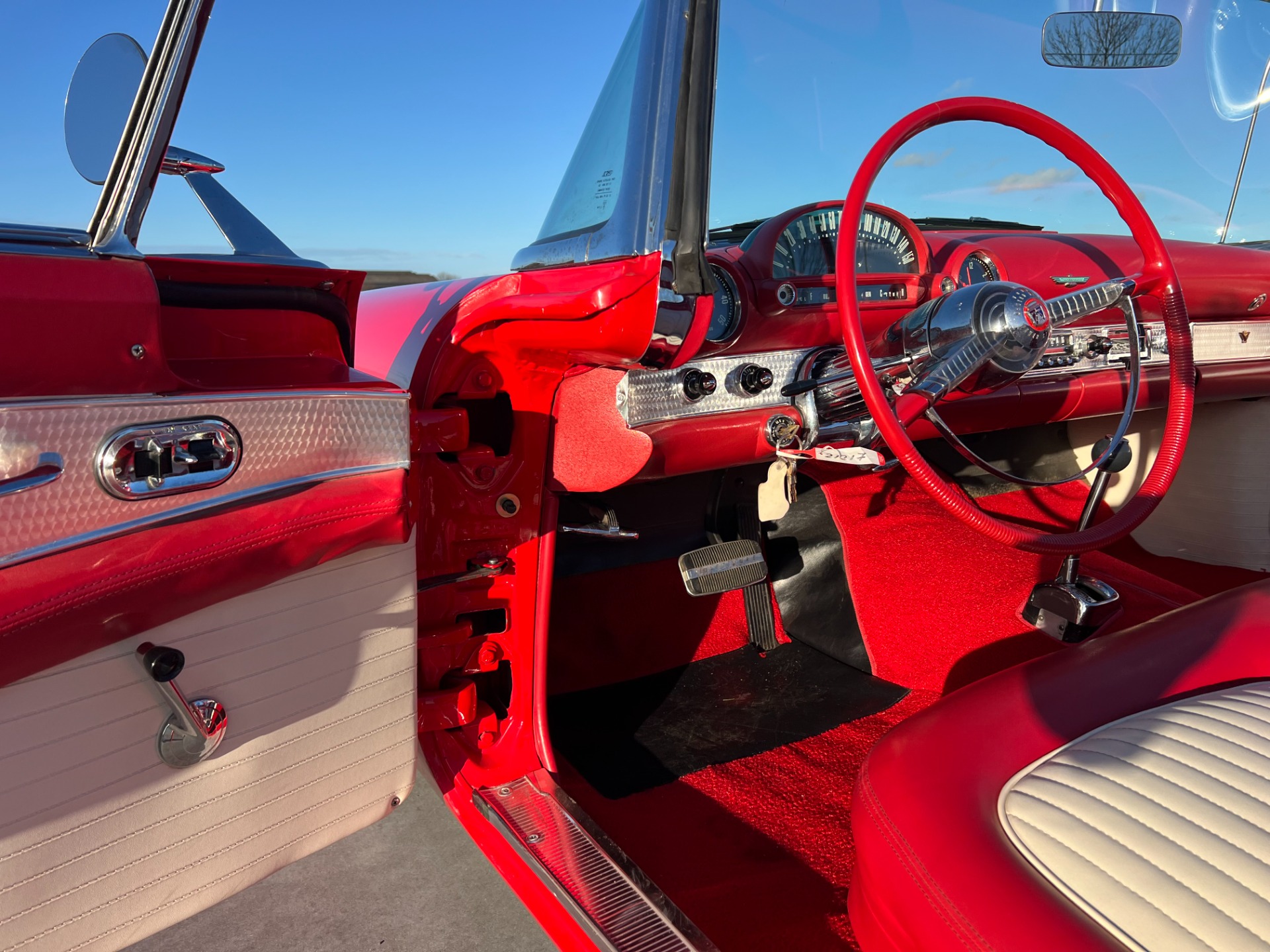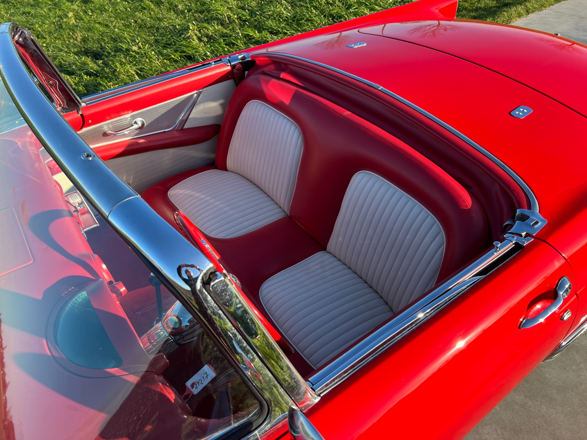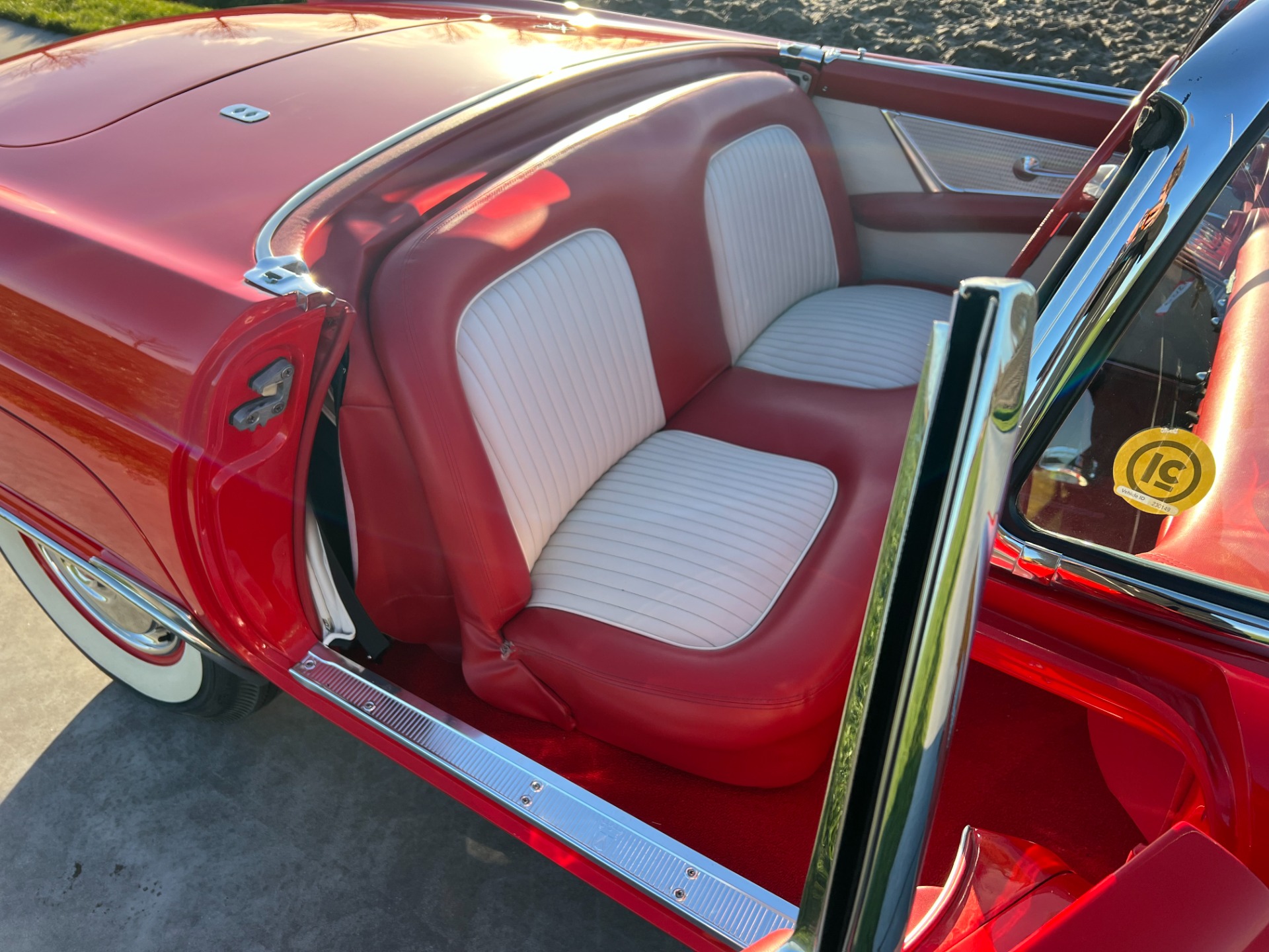 Interior: When you take the top down/off, the beautiful white and red interior looks very fresh and clean, and the trim tag says that this example was born this way. The seat, carpeting, door panels, and dash have a quality and fresh feel that gets the fundamentals right. This '55 bird comes with a power seat feature.