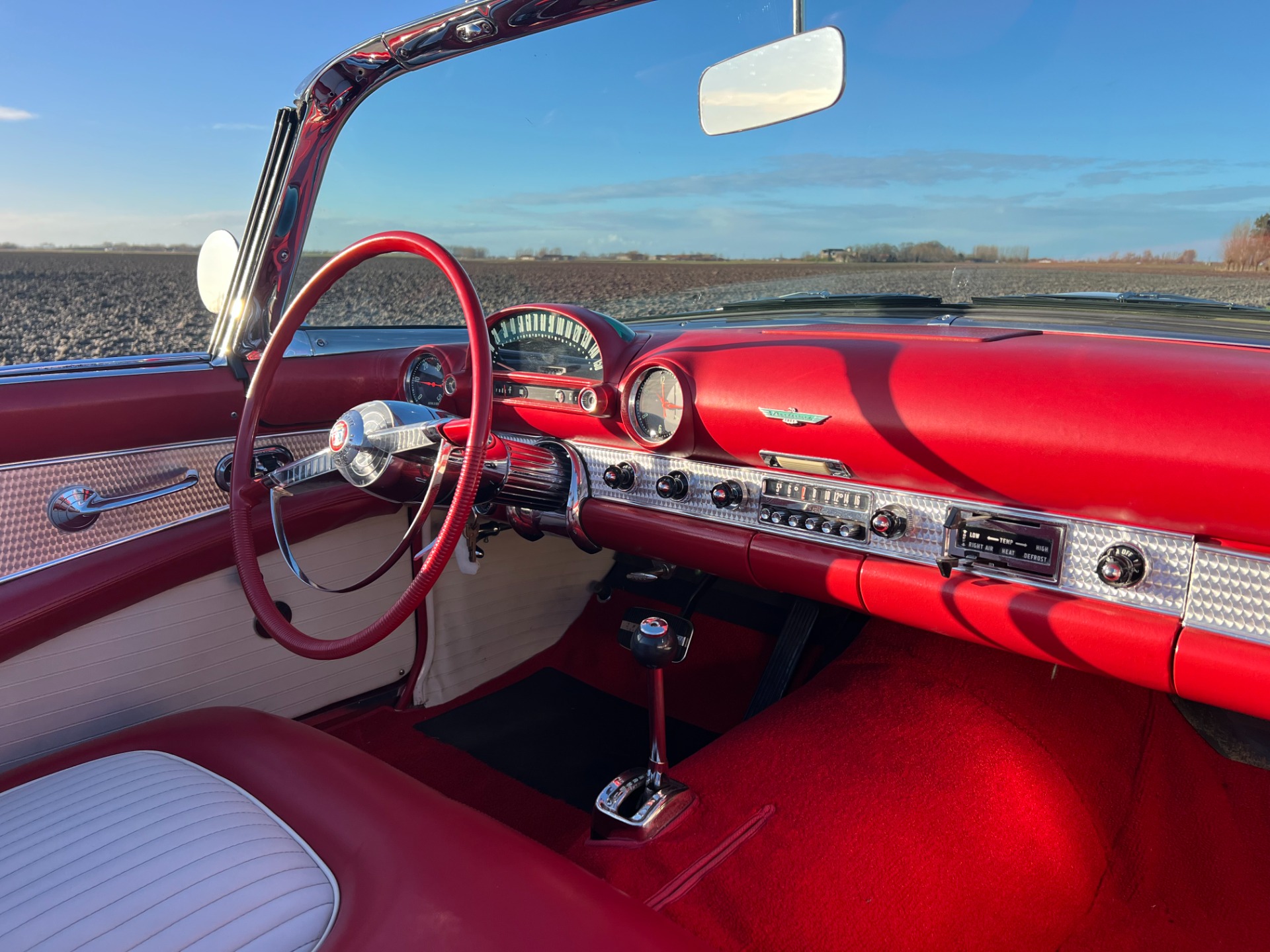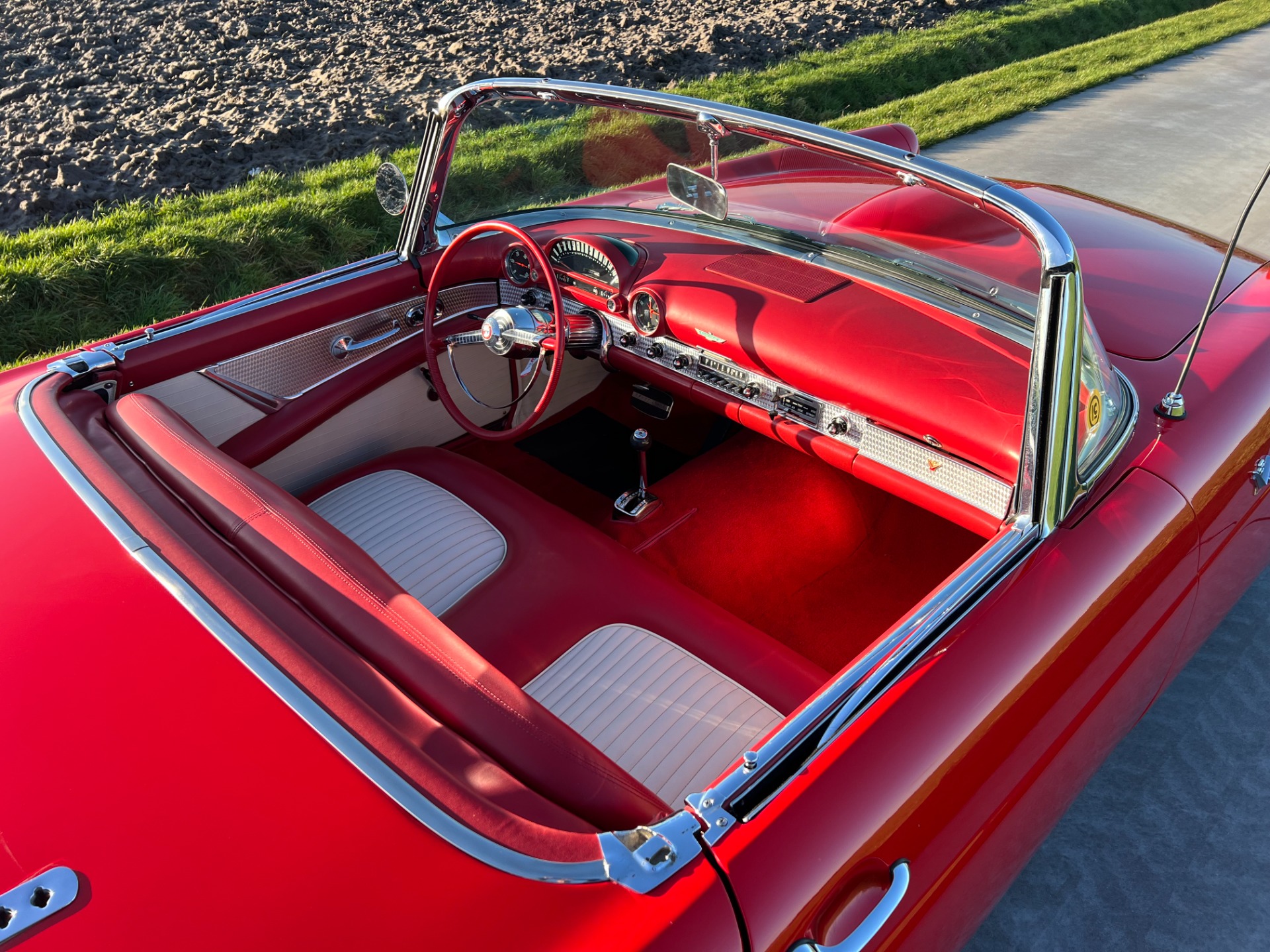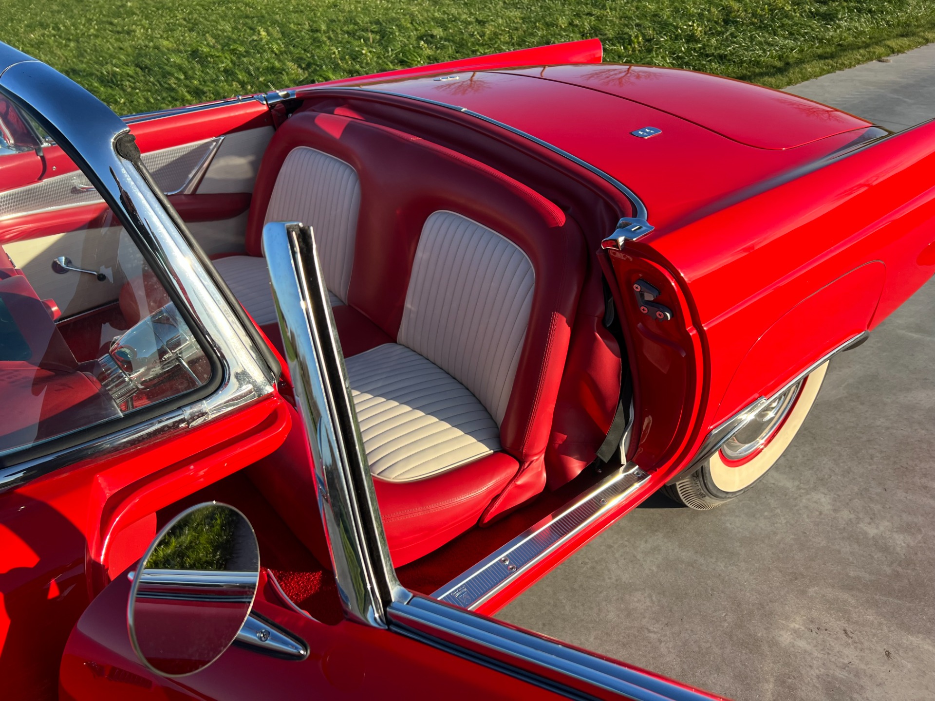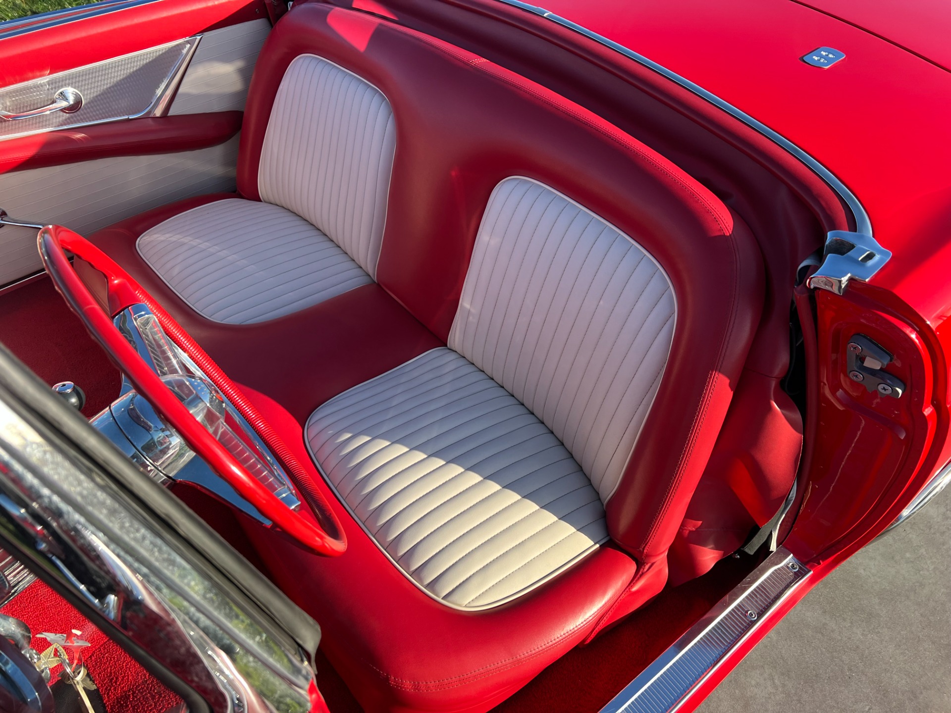 Interior: When you take the top down/off, the beautiful white and red interior looks very fresh and clean, and the trim tag says that this example was born this way. The seat, carpeting, door panels, and dash have a quality and fresh feel that gets the fundamentals right. This '55 bird comes with a power seat feature.