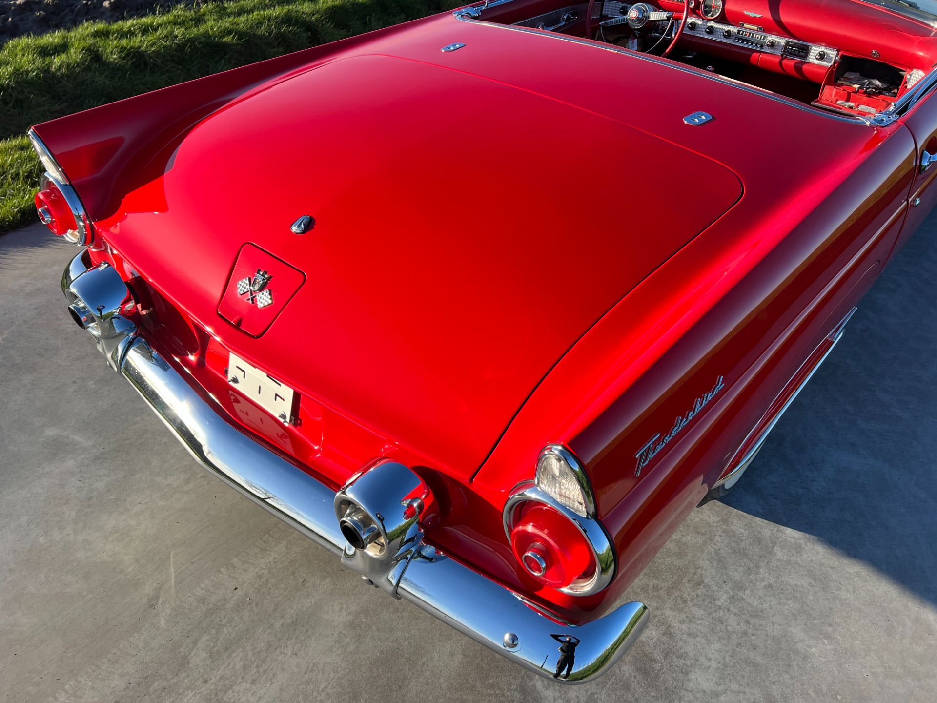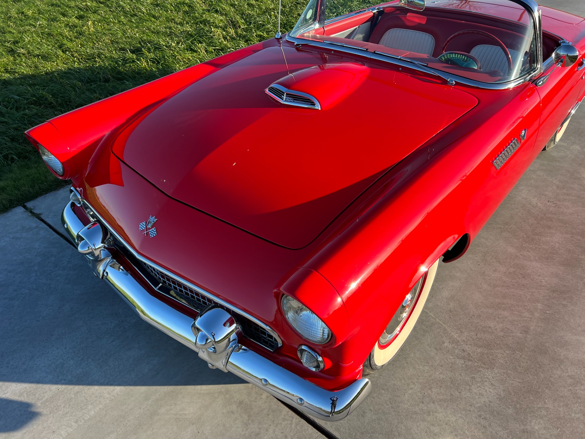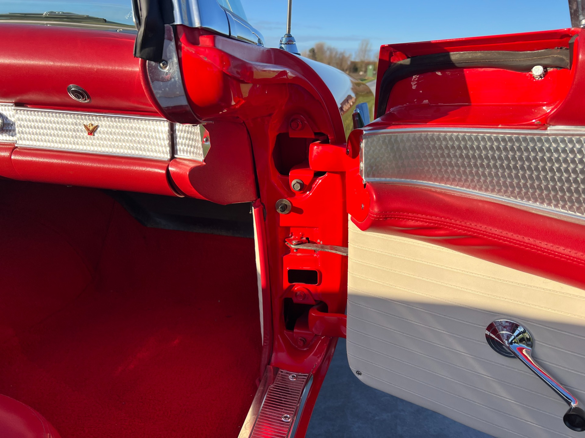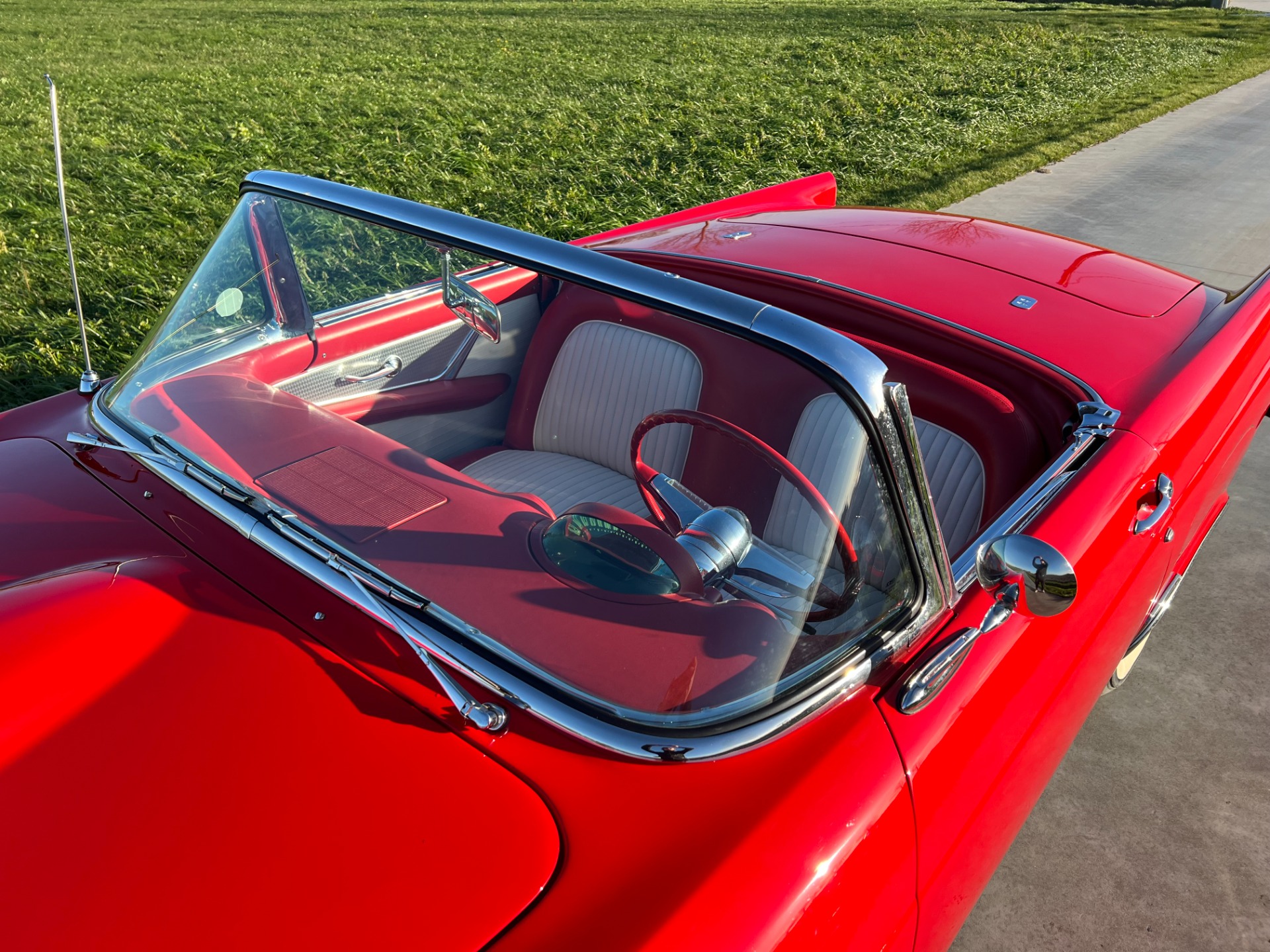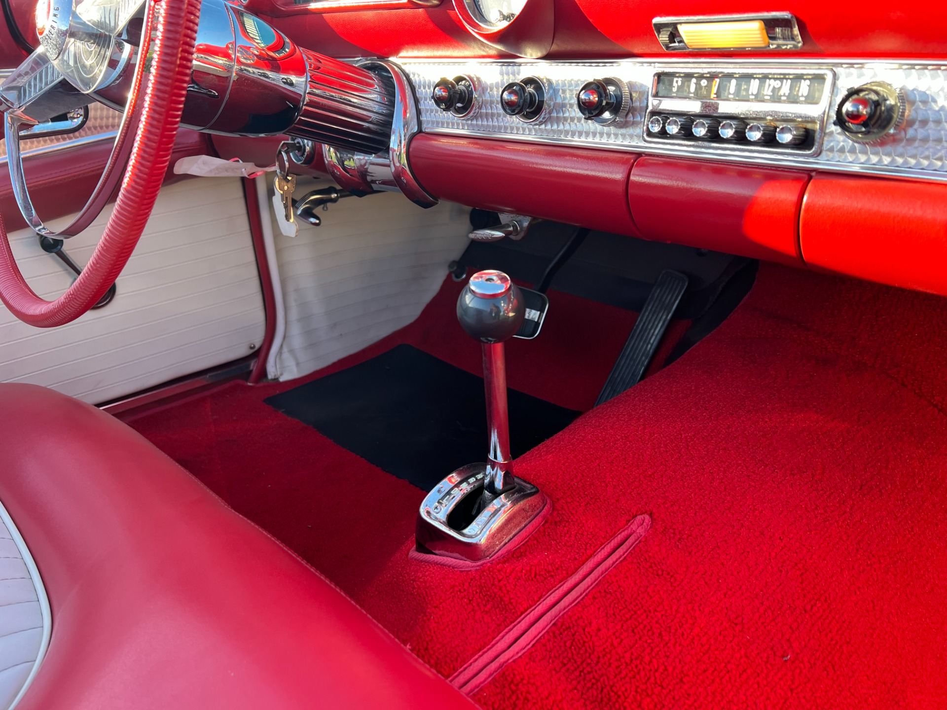 Interior: When you take the top down/off, the beautiful white and red interior looks very fresh and clean, and the trim tag says that this example was born this way. The seat, carpeting, door panels, and dash have a quality and fresh feel that gets the fundamentals right. This '55 bird comes with a power seat feature.