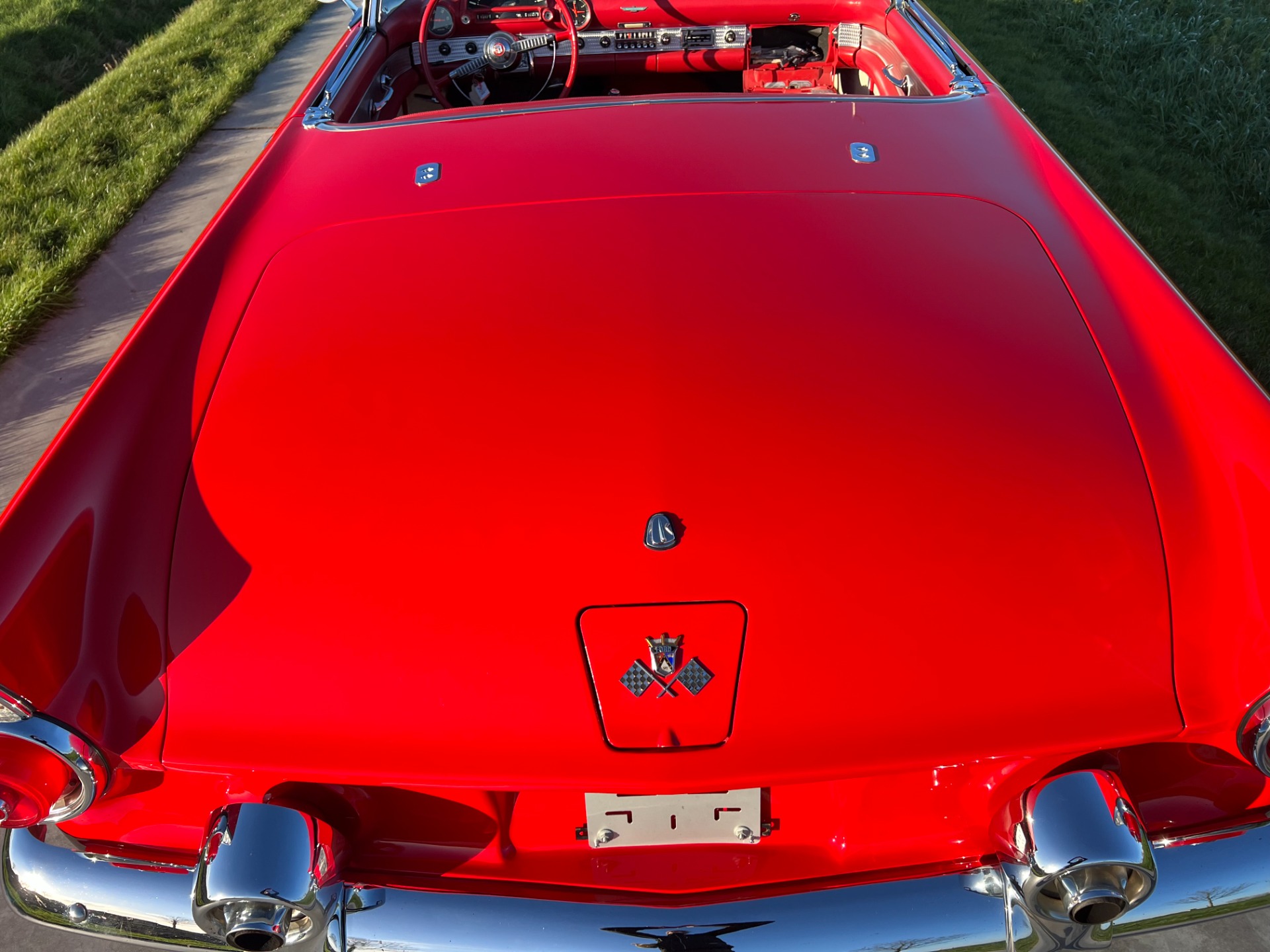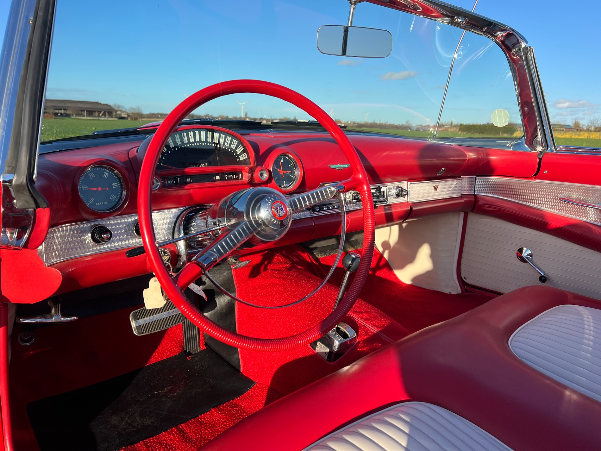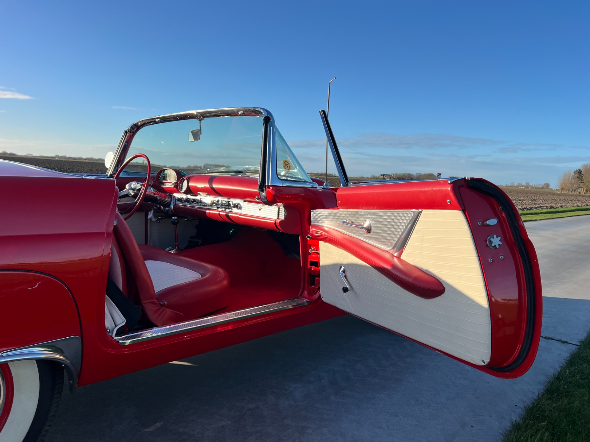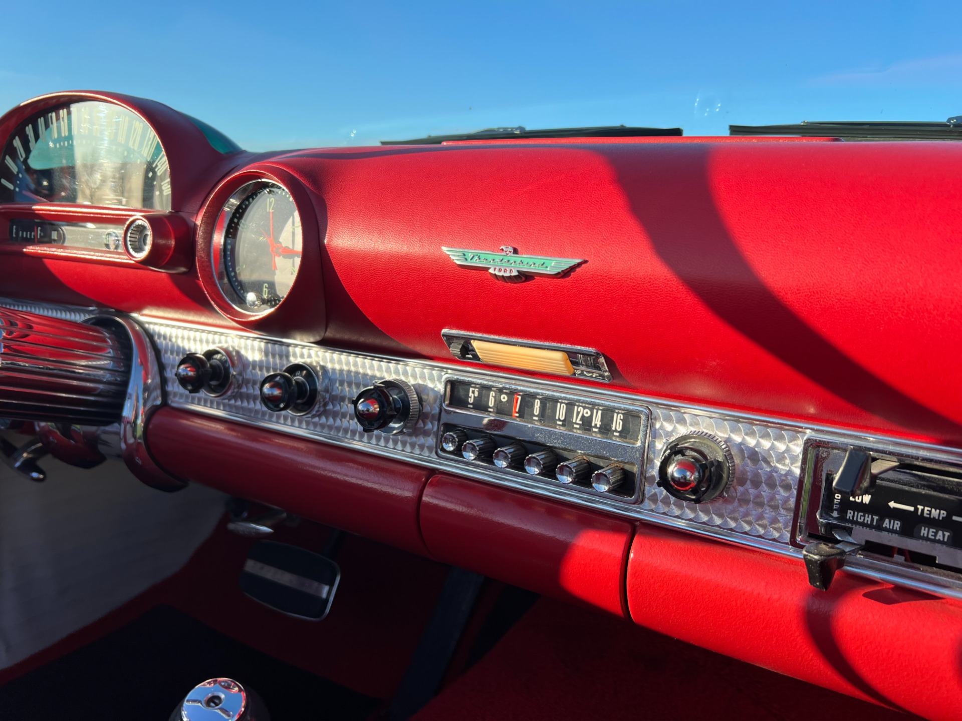 Interior: When you take the top down/off, the beautiful white and red interior looks very fresh and clean, and the trim tag says that this example was born this way. The seat, carpeting, door panels, and dash have a quality and fresh feel that gets the fundamentals right. This '55 bird comes with a power seat feature.
