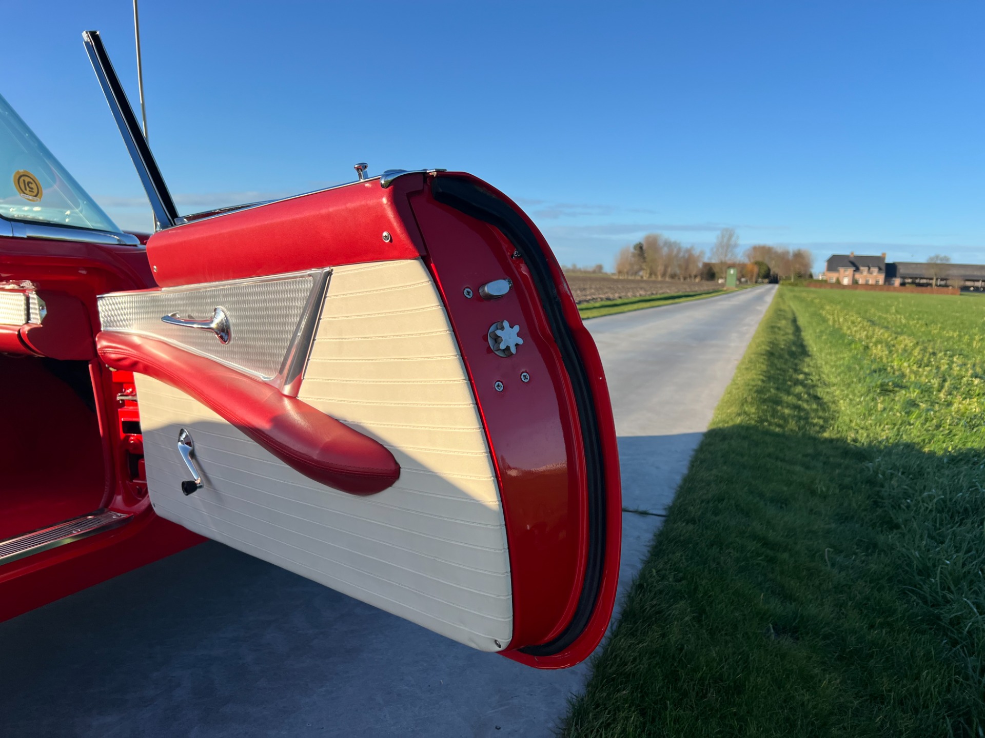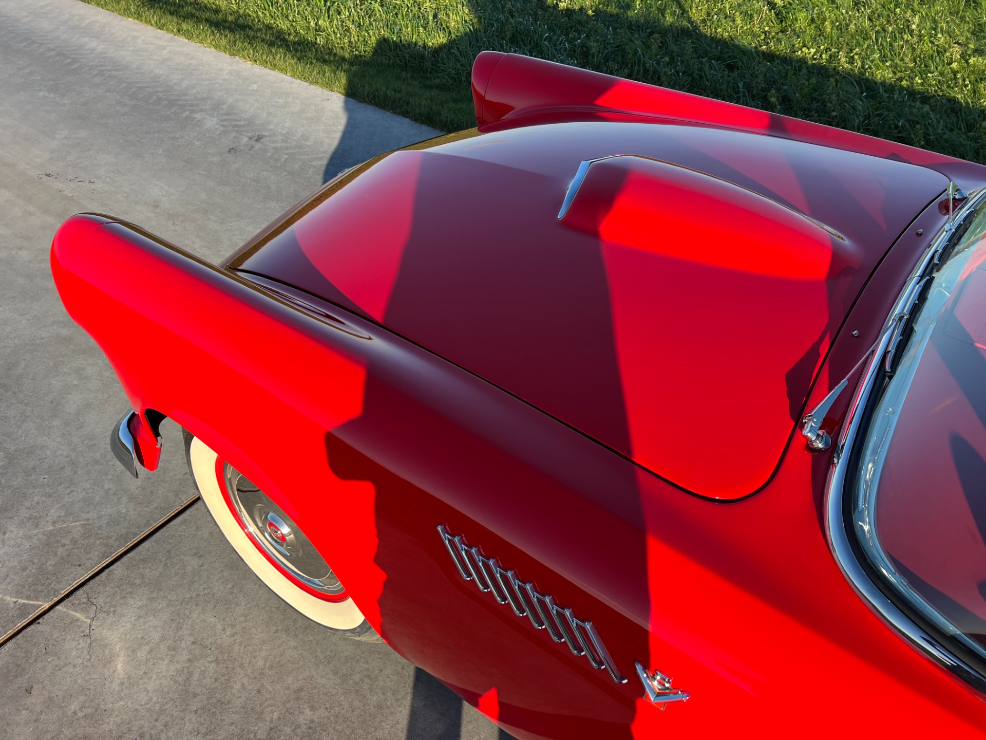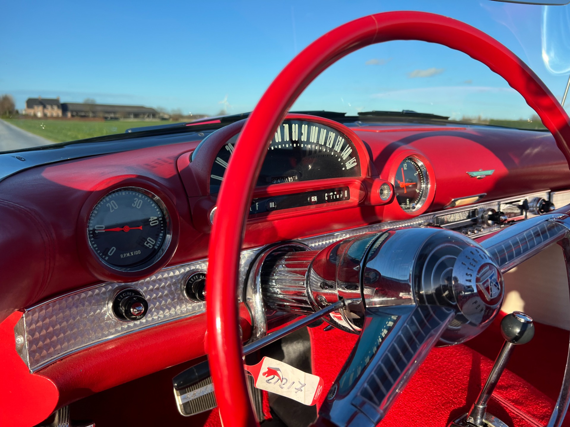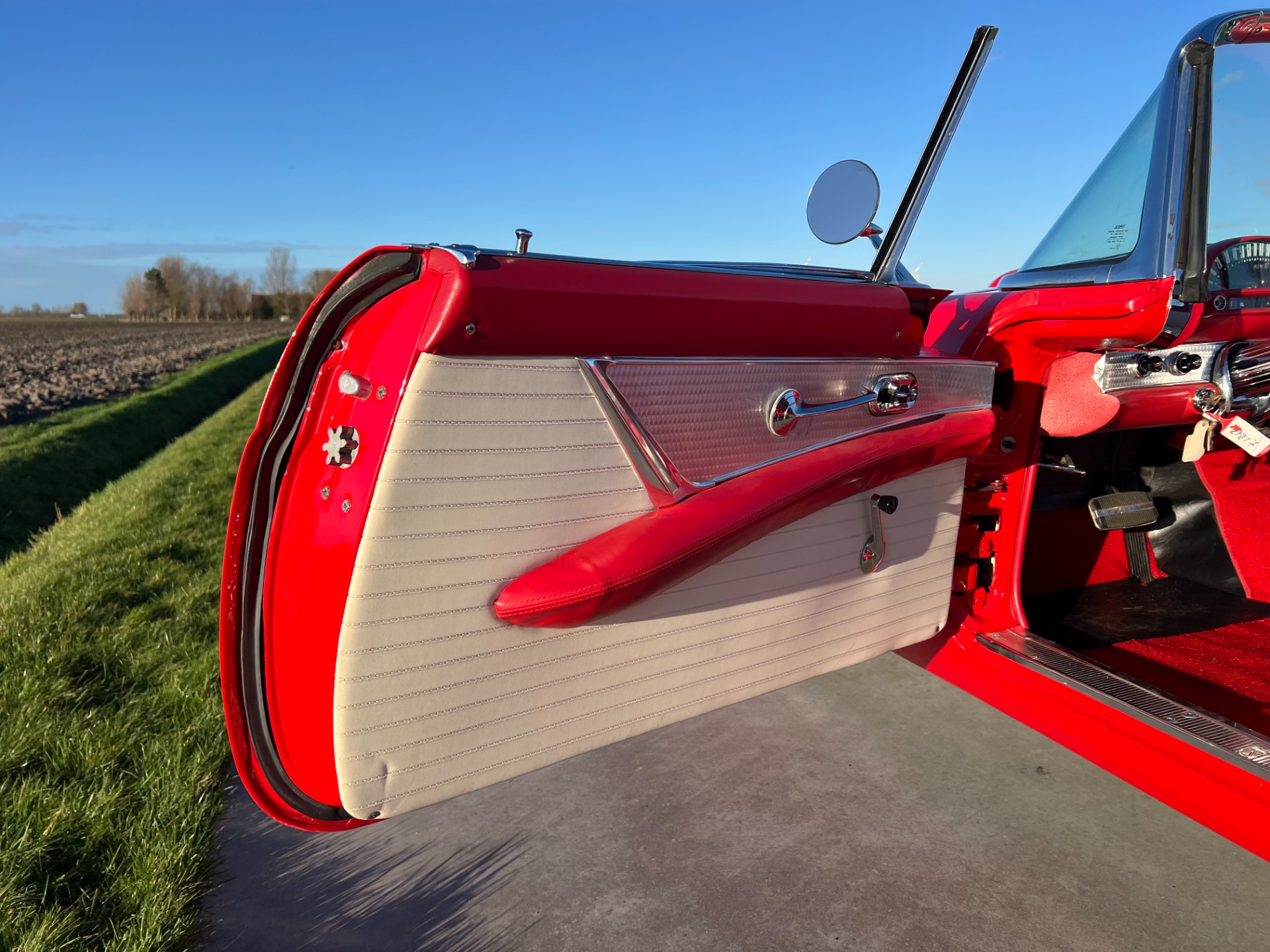 Interior: When you take the top down/off, the beautiful white and red interior looks very fresh and clean, and the trim tag says that this example was born this way. The seat, carpeting, door panels, and dash have a quality and fresh feel that gets the fundamentals right. This '55 bird comes with a power seat feature.