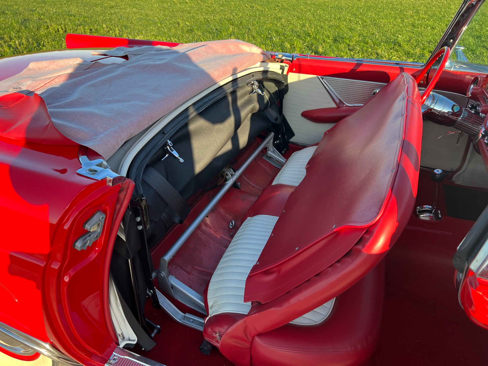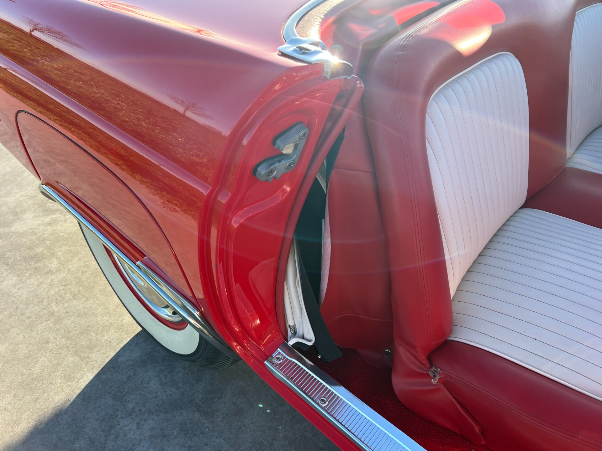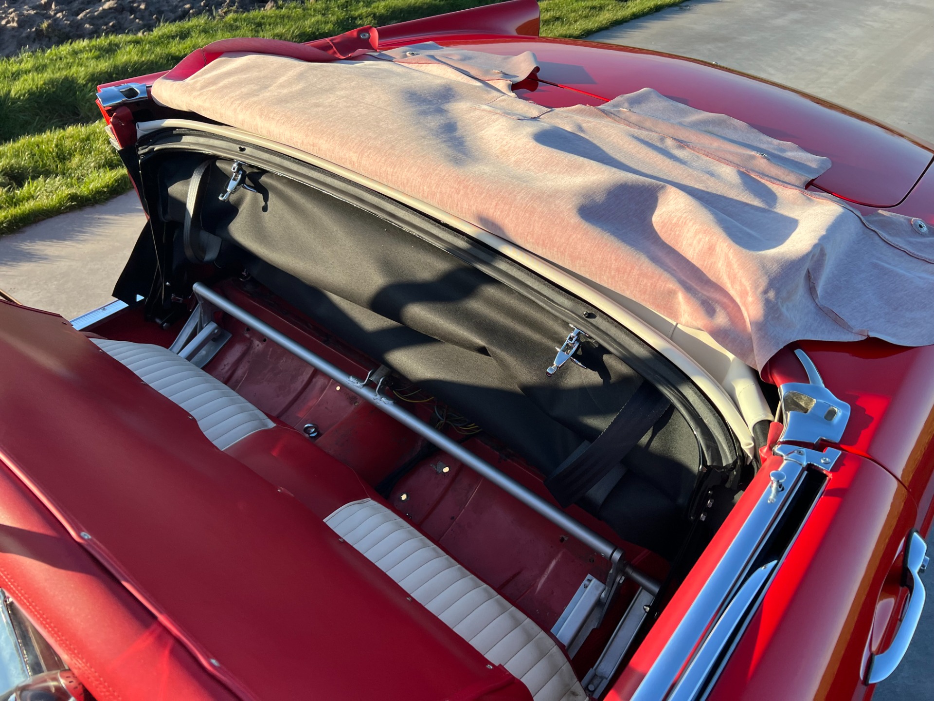 Exterior: The trim tag tells us this was born a Torch red car. The factory-correct color was given a quality respray later in life, so it still carries an excellent shine today. And you can tell there's an overall look of quality with the details like straight body lines and good gaps. The Torch red looks great coordinating with the whitewall tires. Included with the car is also a well-fitting white folding soft top if you feel the weather might become nicer throughout the day.