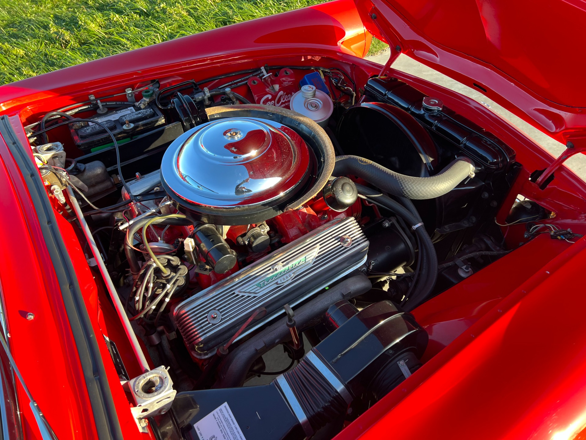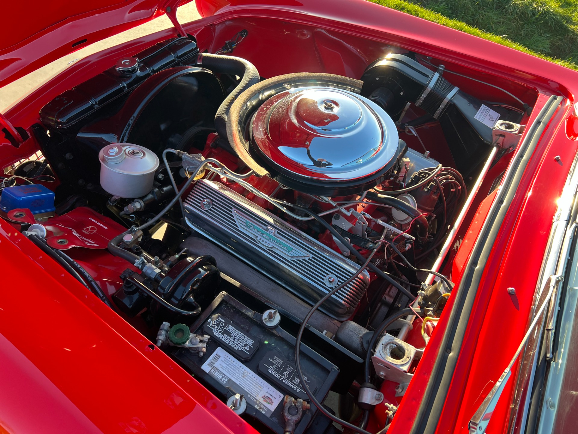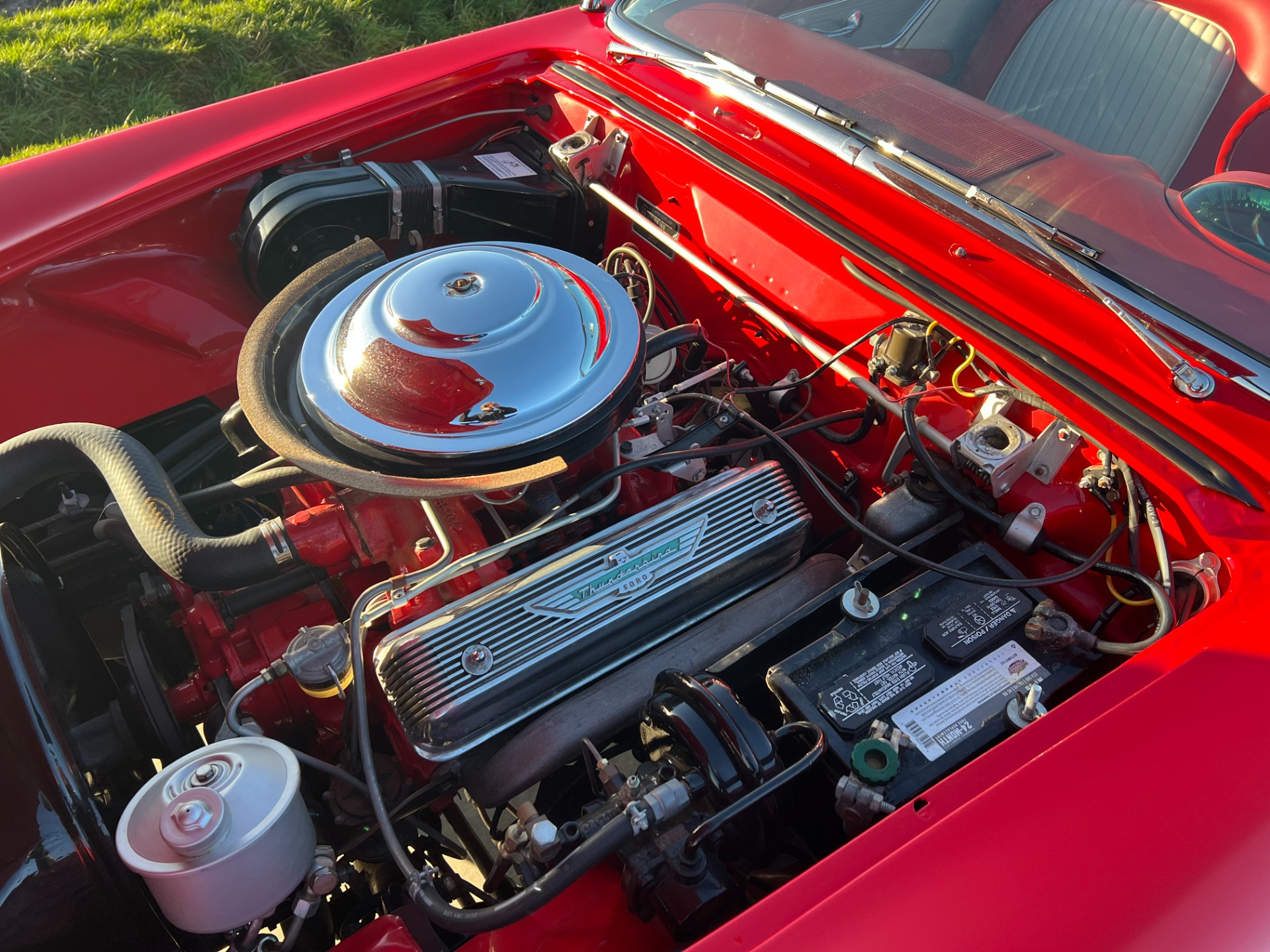 Mechanics: More of that time capsule and quality feeling comes when you open the hood. It's a bright, tidy, and correct presentation. You'll appreciate seeing nice elements like the pie dish air cleaner with gasket, the big red block, and the Thunderbird-specific valve covers. But beneath the aesthetics of that great-looking engine bay is some real substance. This D-code T-bird correctly has the larger 292 cubic-inch V8, and it inhales deeply through a Holley four-barrel carburator. You also have easy driving features like power steering, power brakes and an automatic transmission.