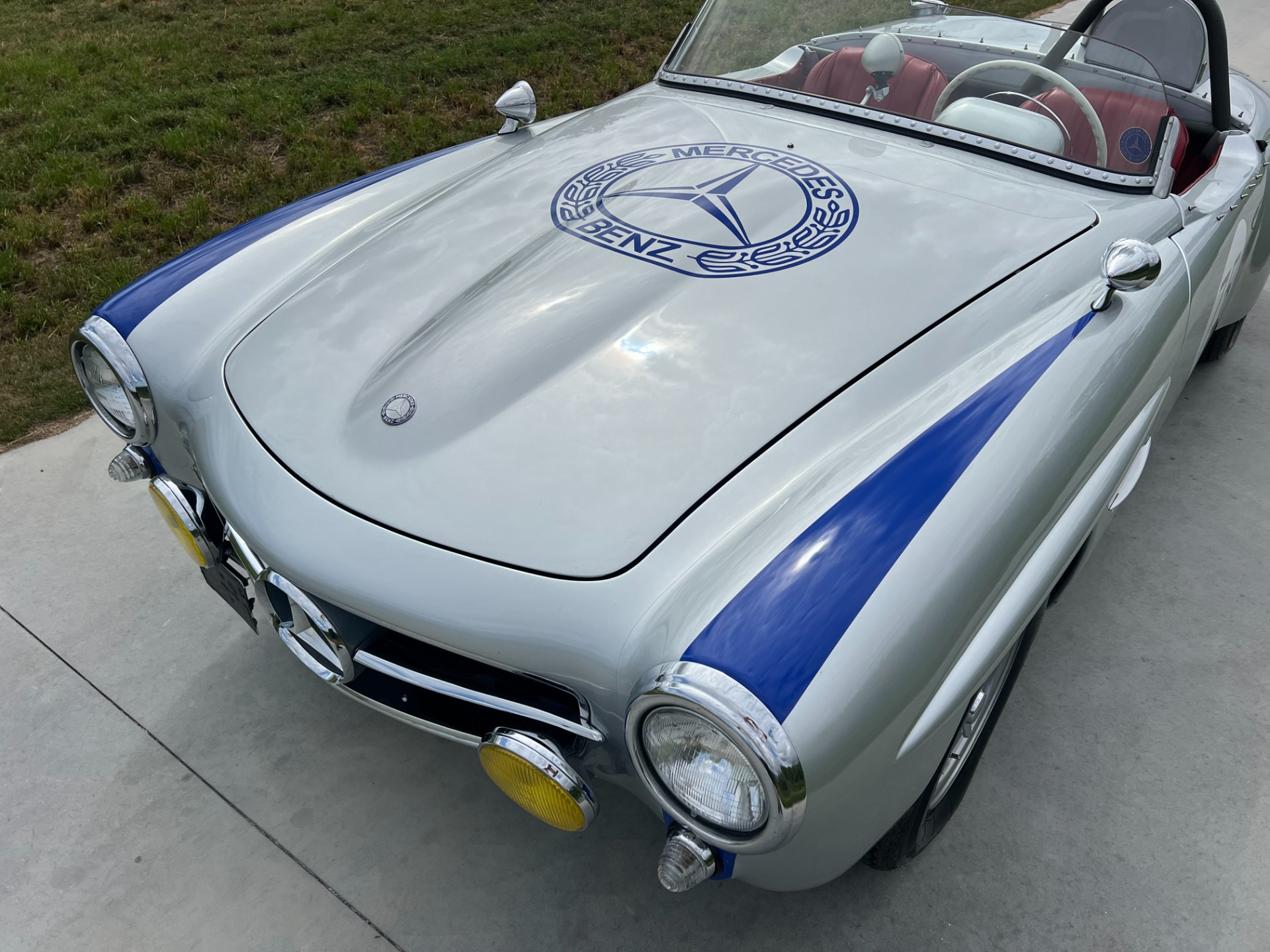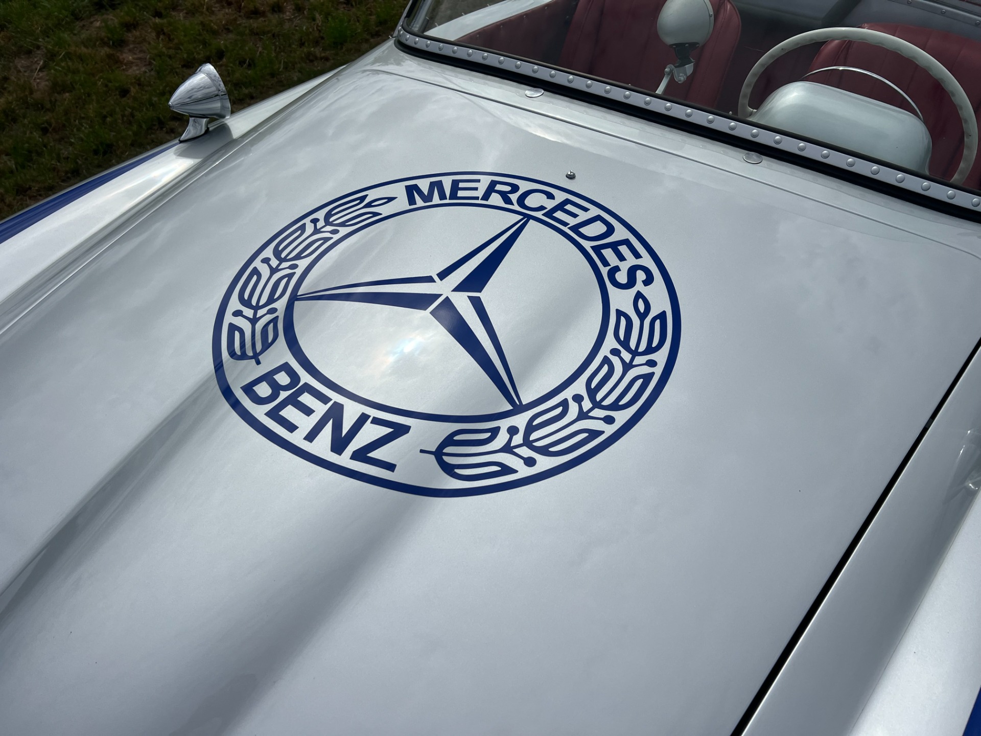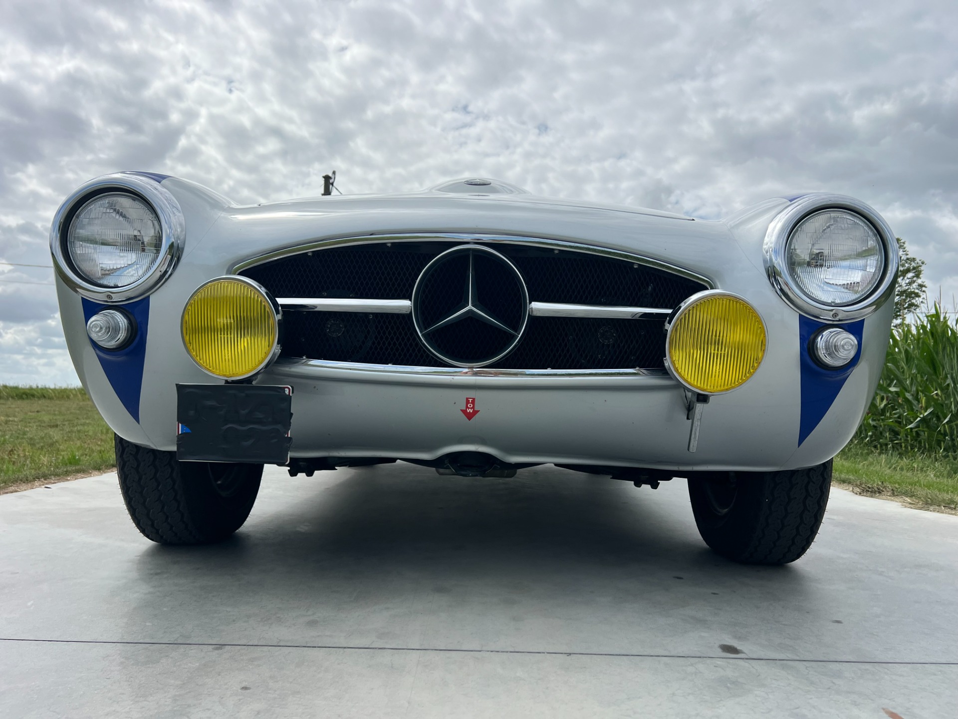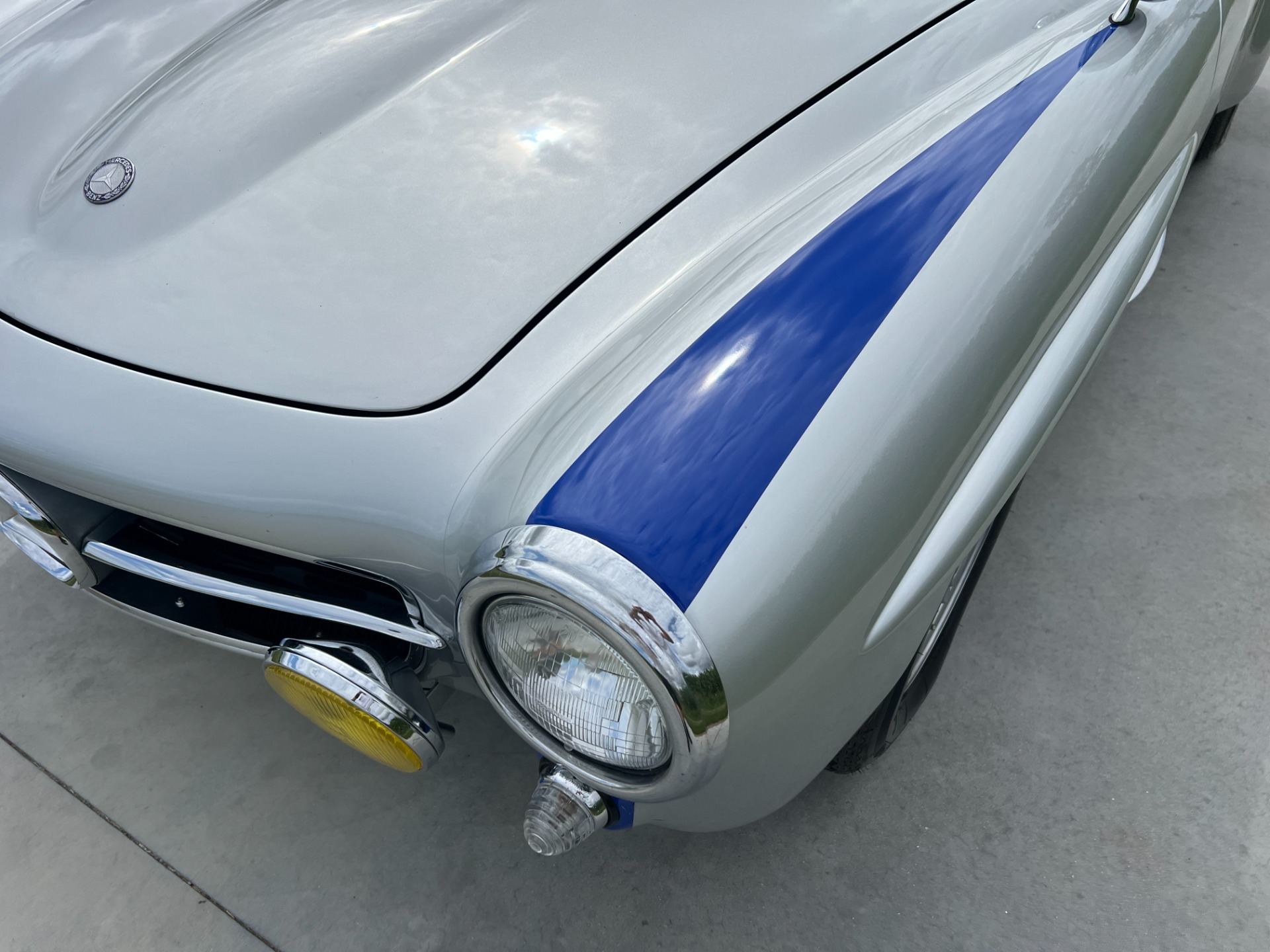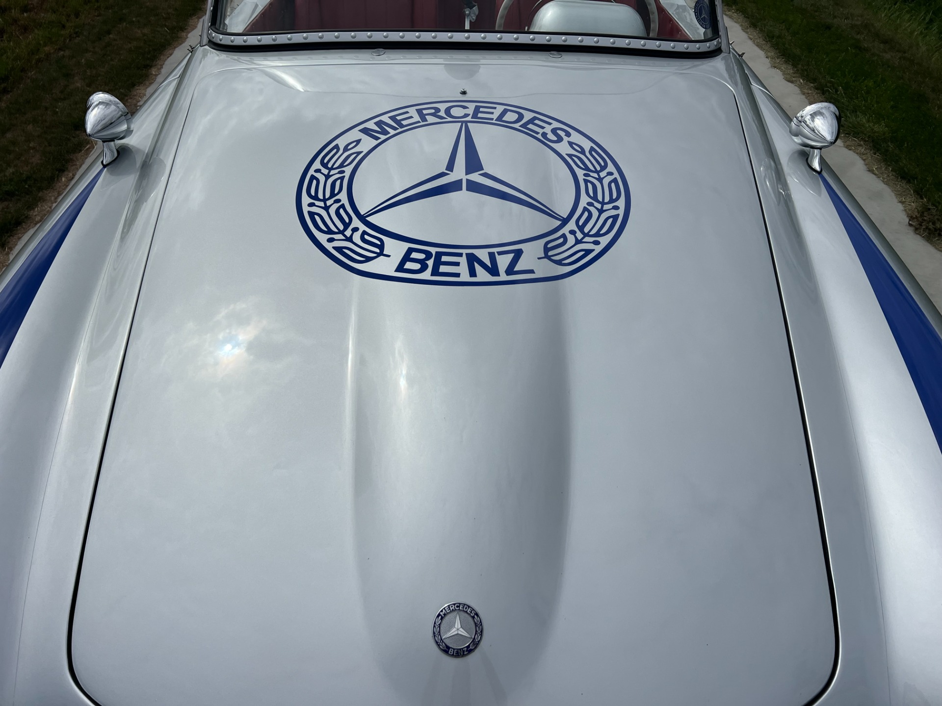 Finished in light silver-gray with blue racing stripes and custom hood art. Features include racing roll hoop, yellow rally fog lamps, bullet mirrors, and number roundels. Stripped-down for vintage racing with no bumpers, lightweight body mods, and period-correct wheels. A head-turning, track-ready classic with timeless Mercedes style.