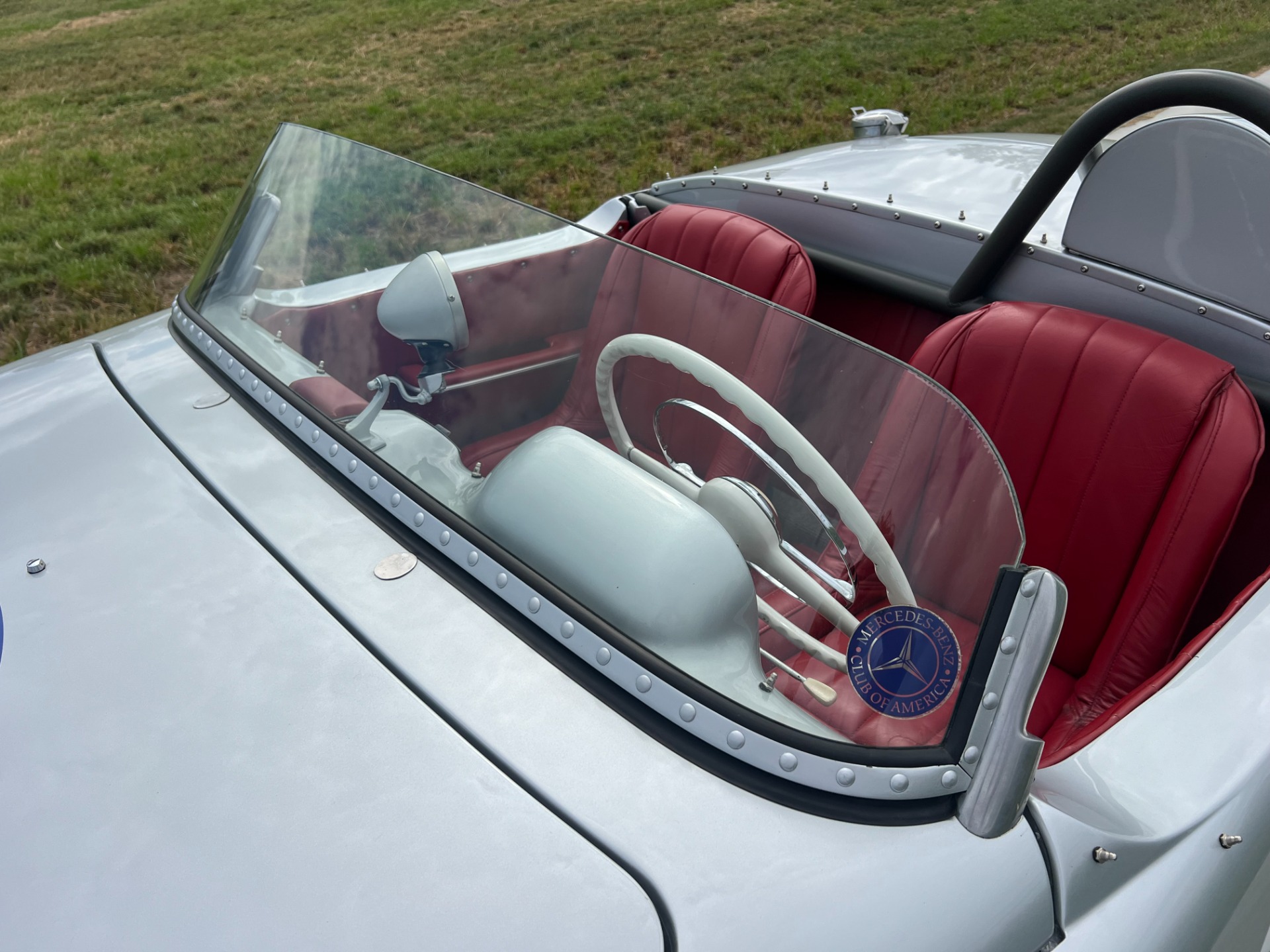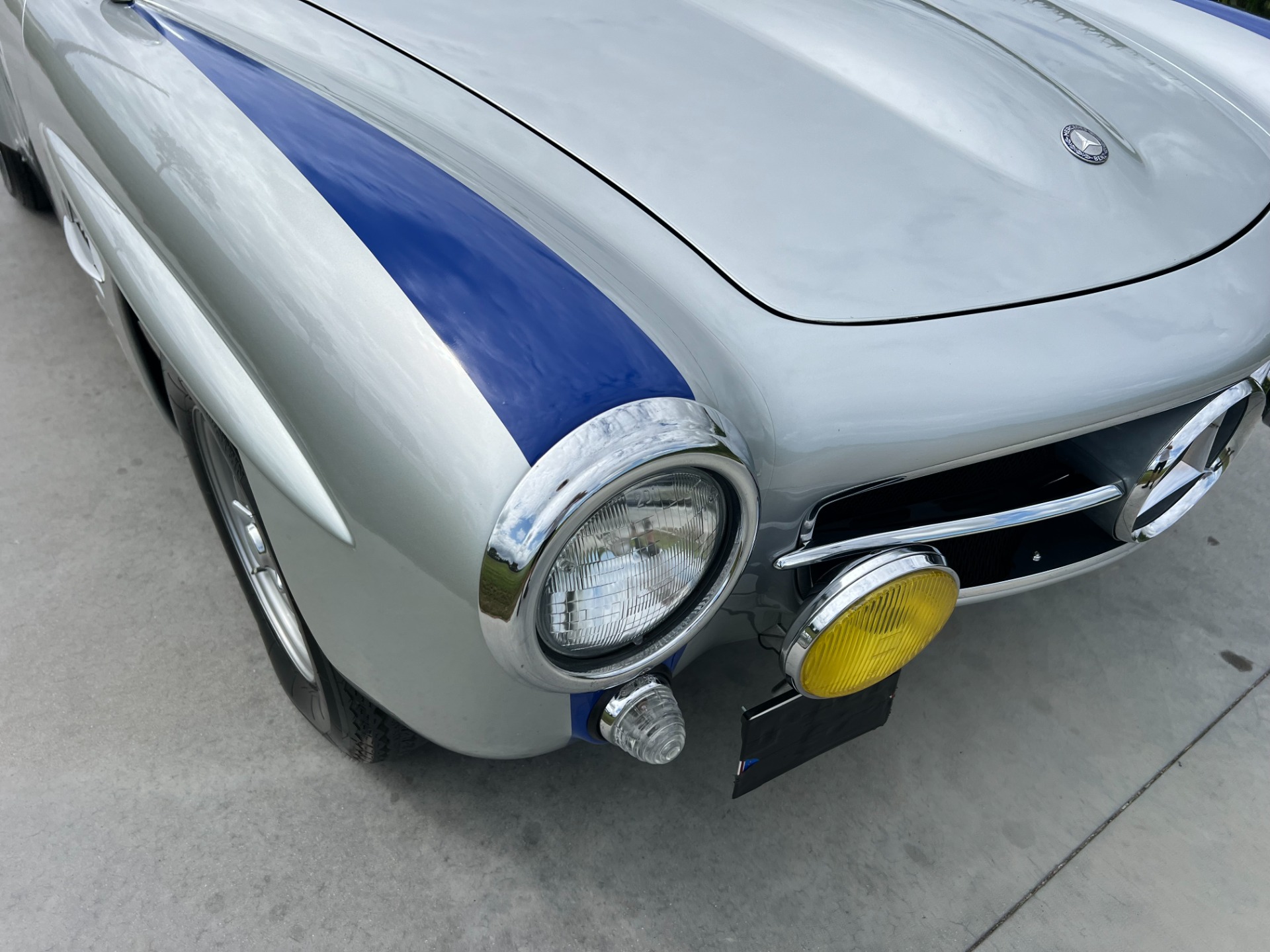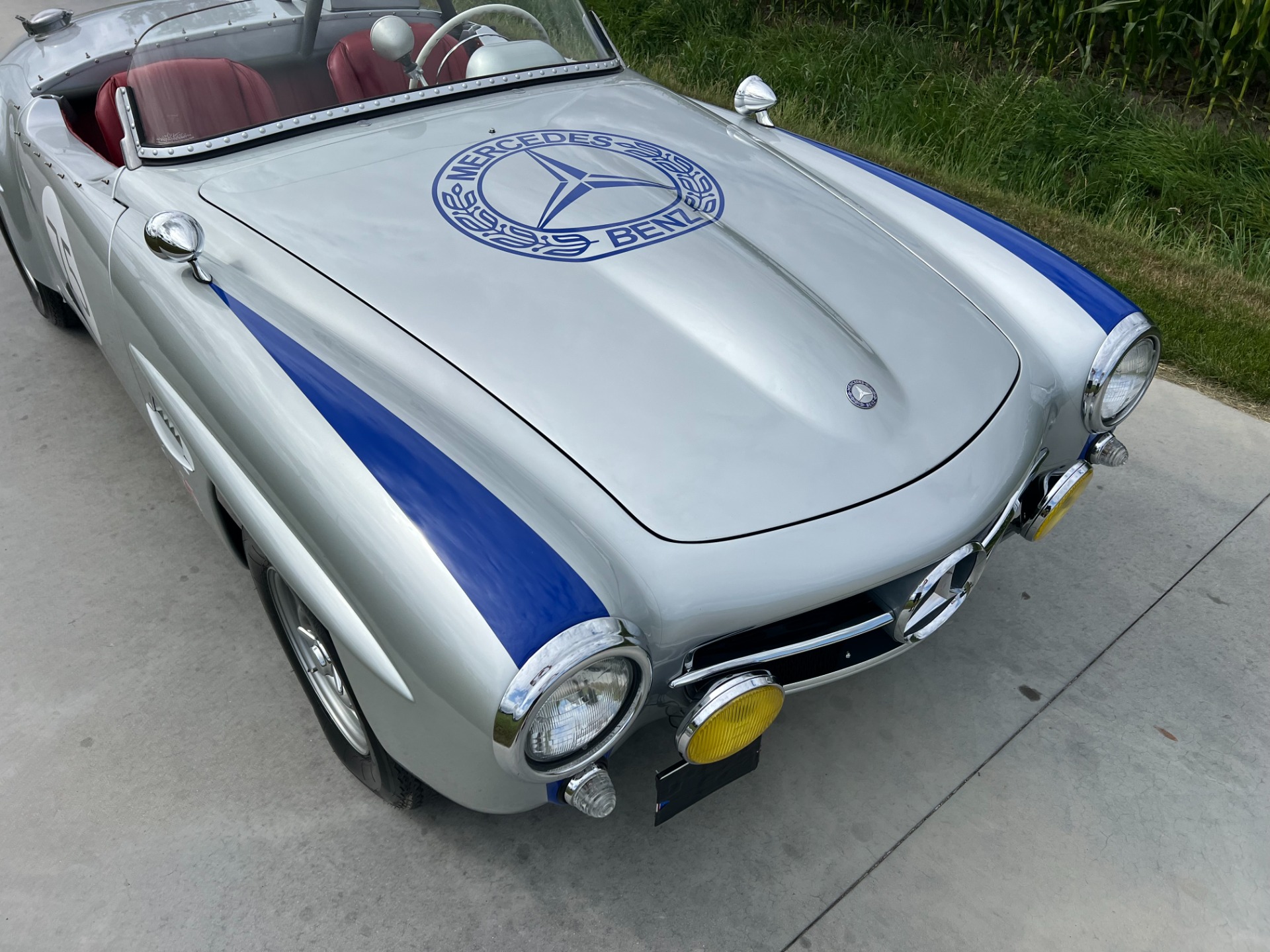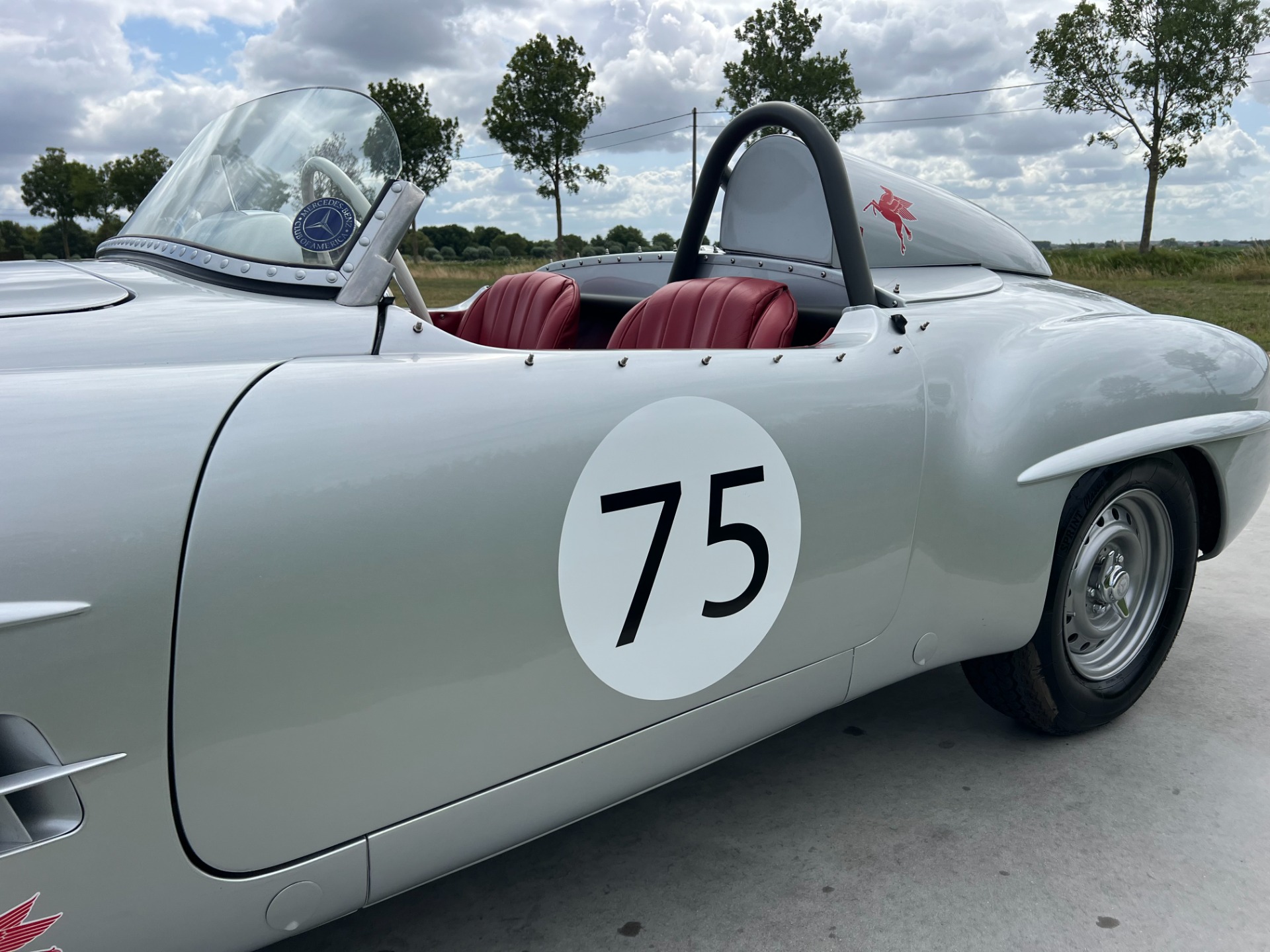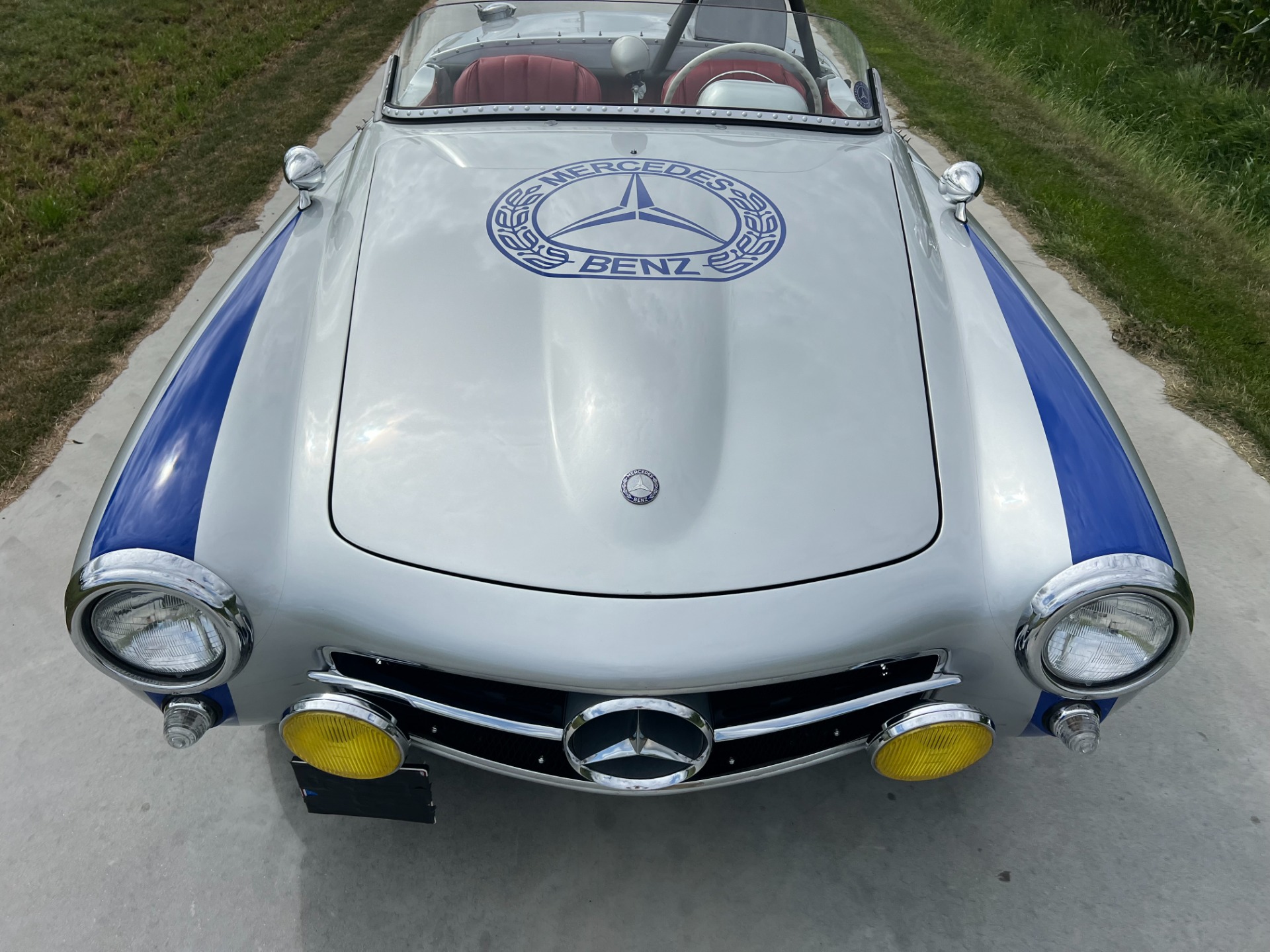 Finished in light silver-gray with blue racing stripes and custom hood art. Features include racing roll hoop, yellow rally fog lamps, bullet mirrors, and number roundels. Stripped-down for vintage racing with no bumpers, lightweight body mods, and period-correct wheels. A head-turning, track-ready classic with timeless Mercedes style.