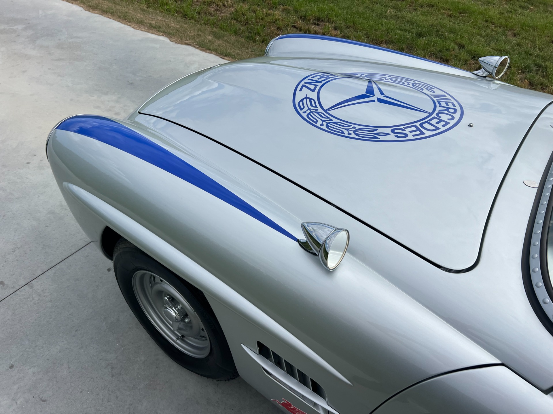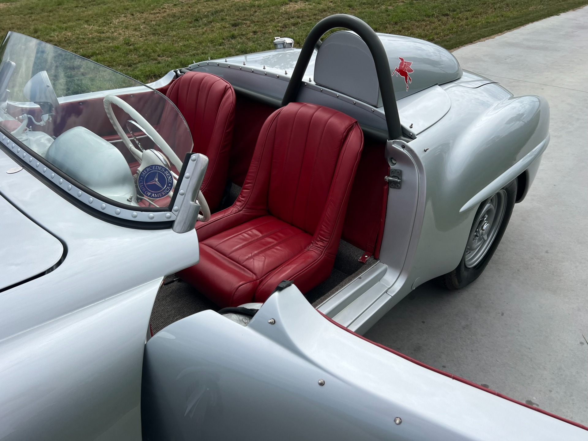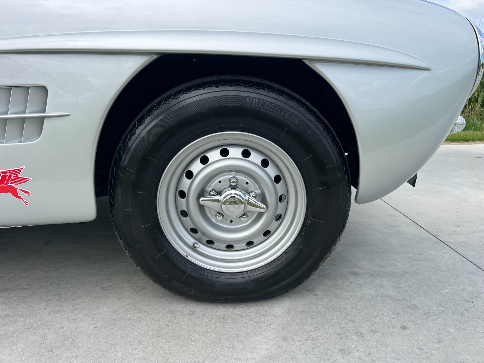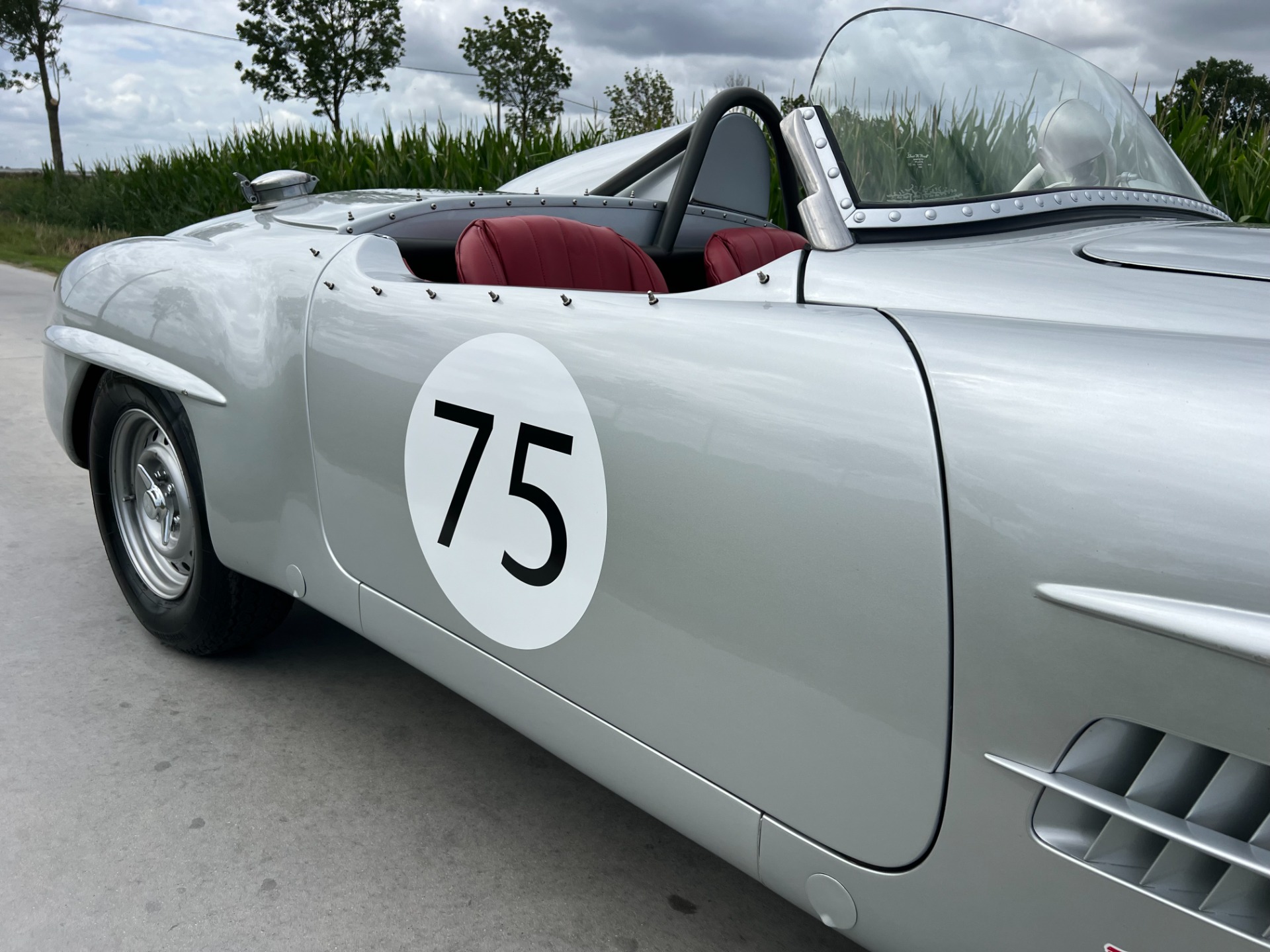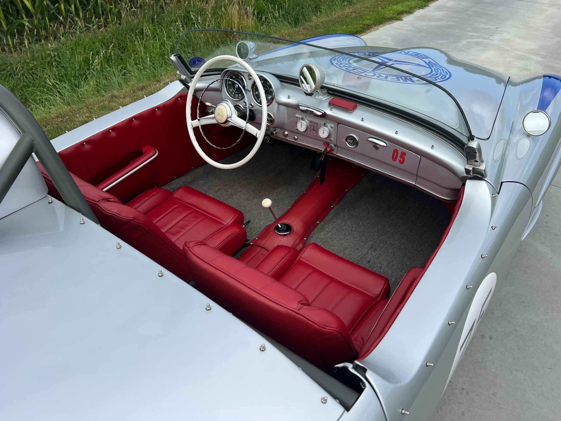 Finished in light silver-gray with blue racing stripes and custom hood art. Features include racing roll hoop, yellow rally fog lamps, bullet mirrors, and number roundels. Stripped-down for vintage racing with no bumpers, lightweight body mods, and period-correct wheels. A head-turning, track-ready classic with timeless Mercedes style.