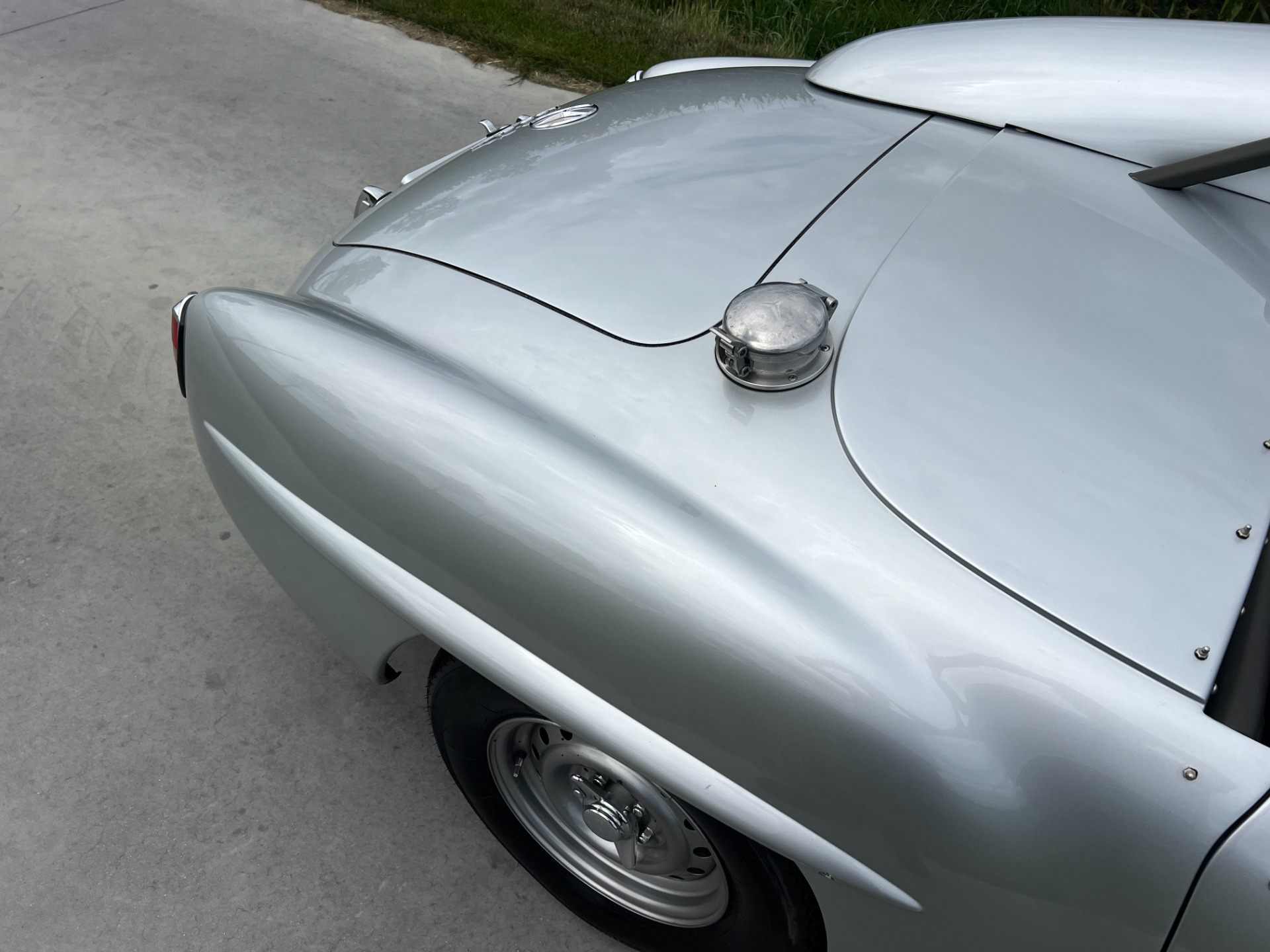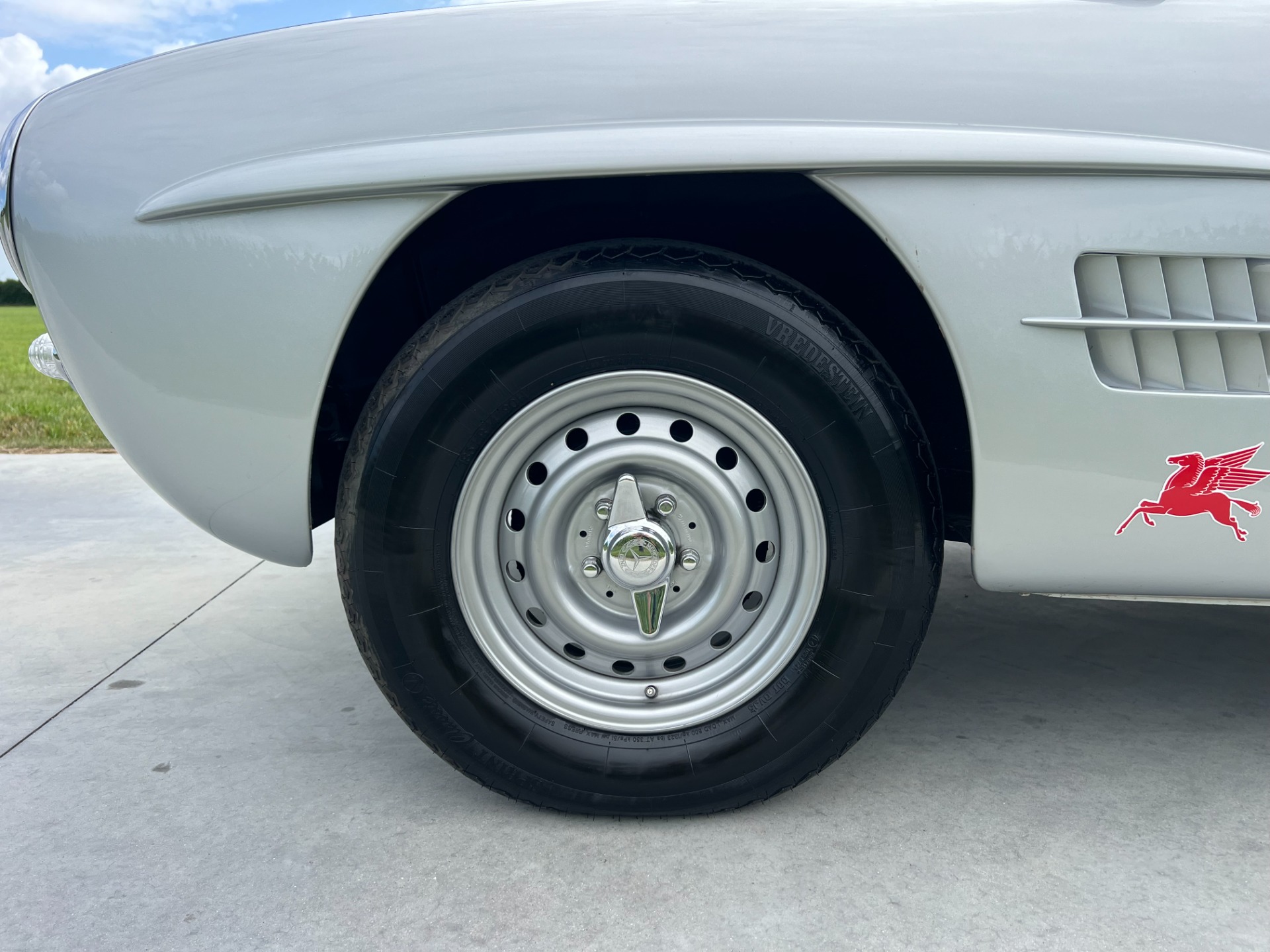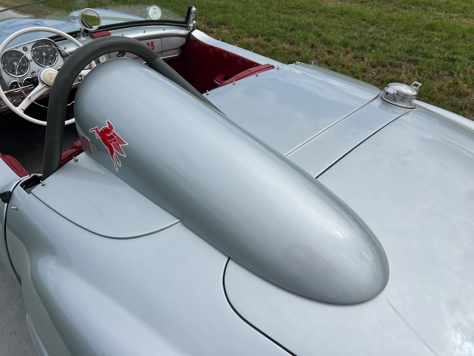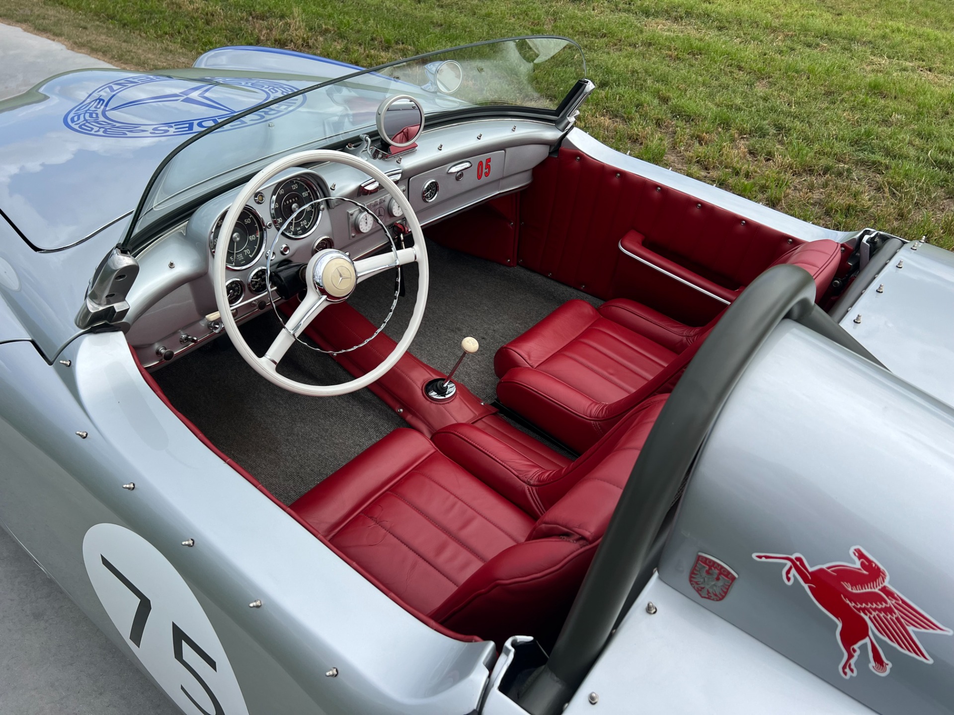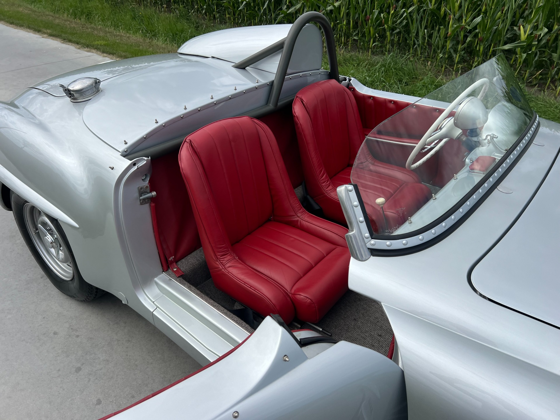 Finished in light silver-gray with blue racing stripes and custom hood art. Features include racing roll hoop, yellow rally fog lamps, bullet mirrors, and number roundels. Stripped-down for vintage racing with no bumpers, lightweight body mods, and period-correct wheels. A head-turning, track-ready classic with timeless Mercedes style.
