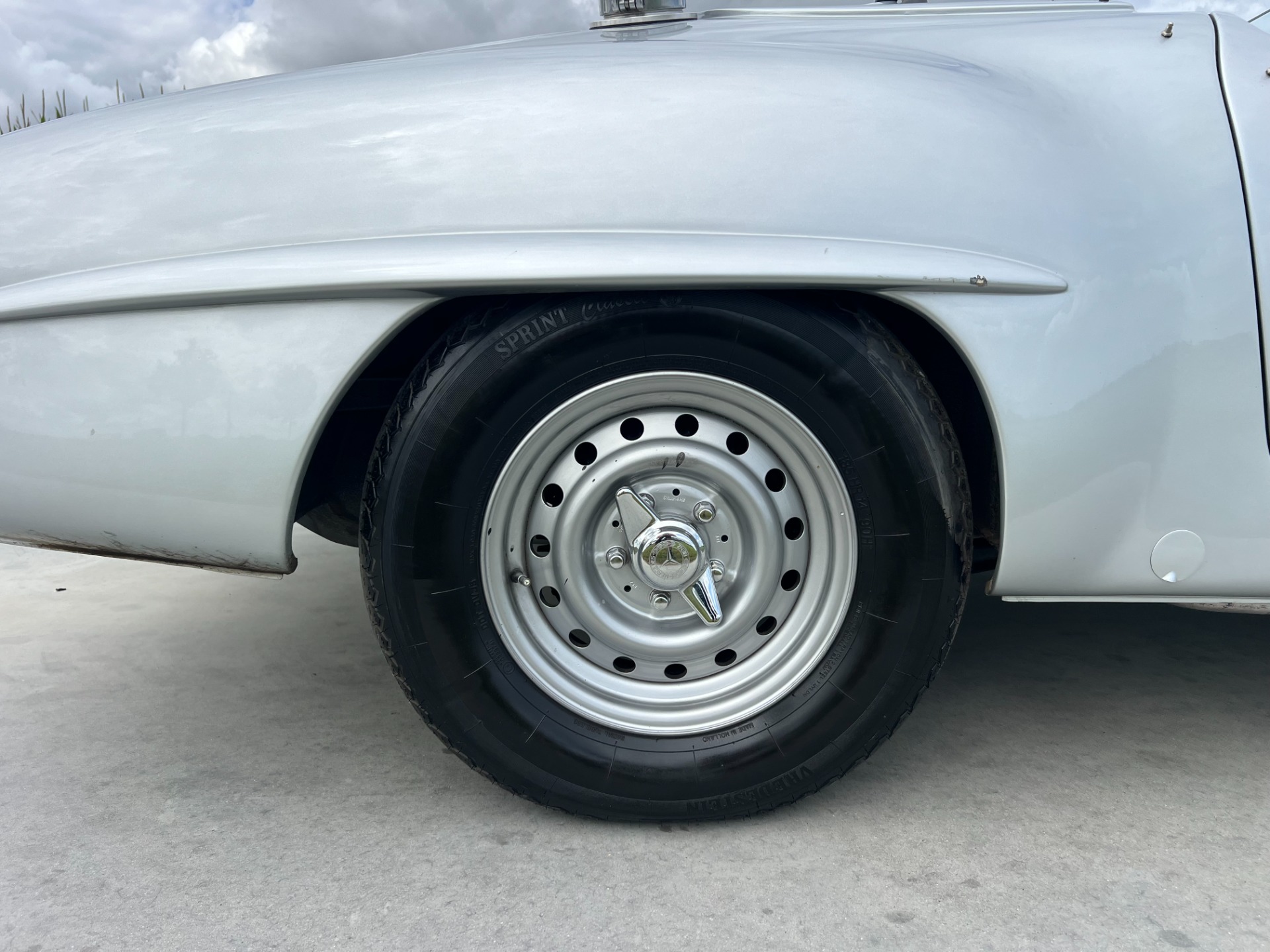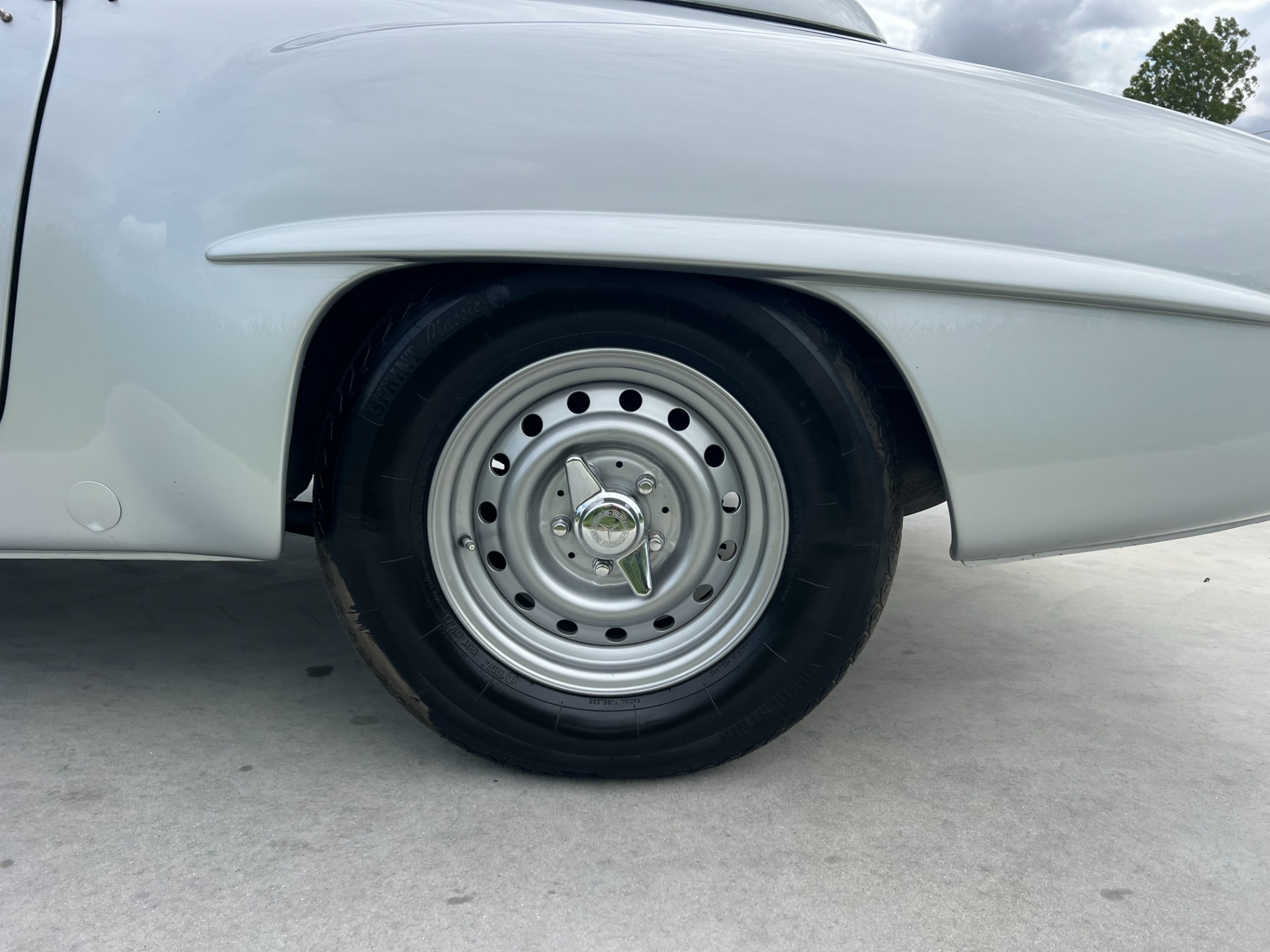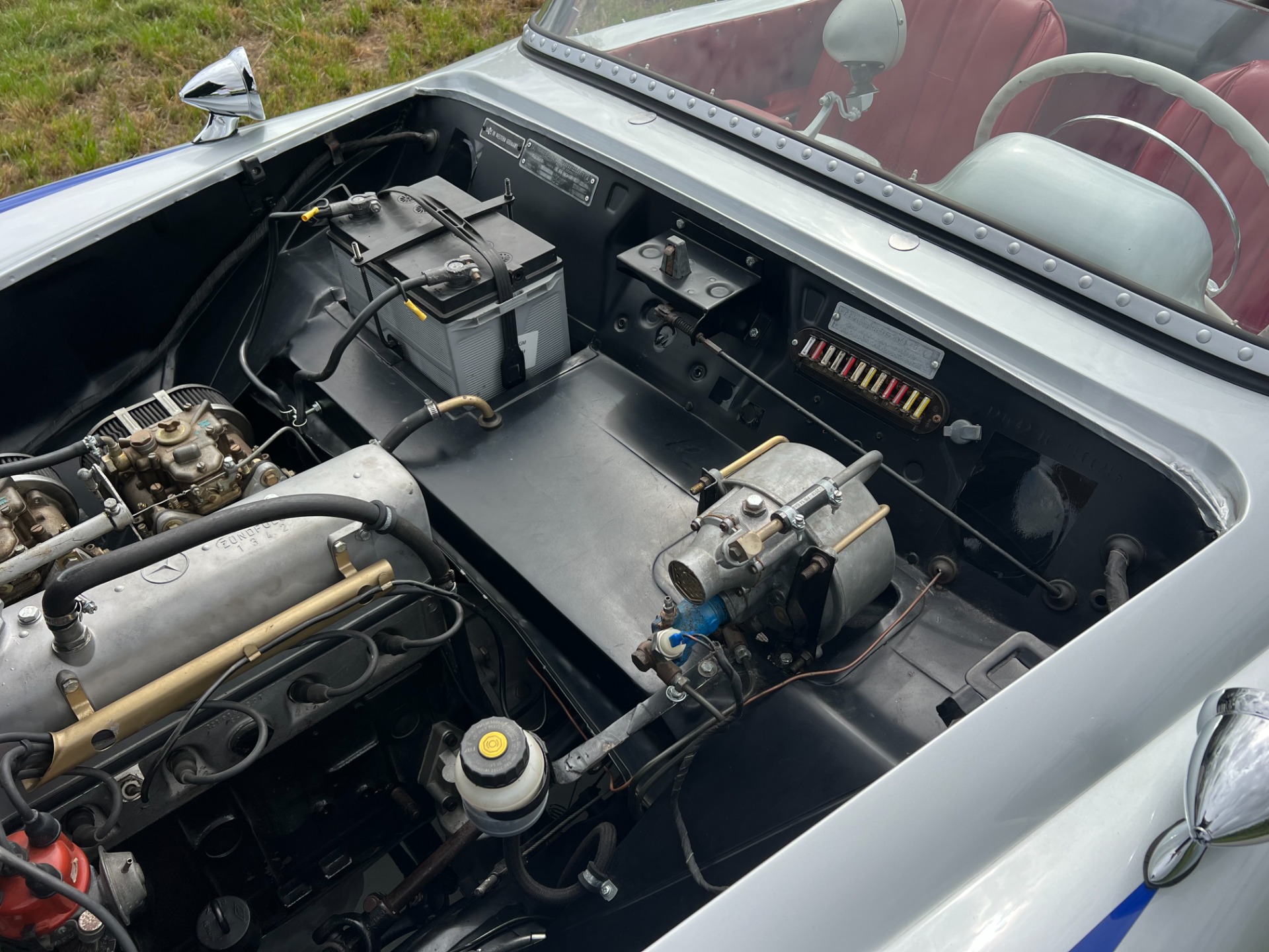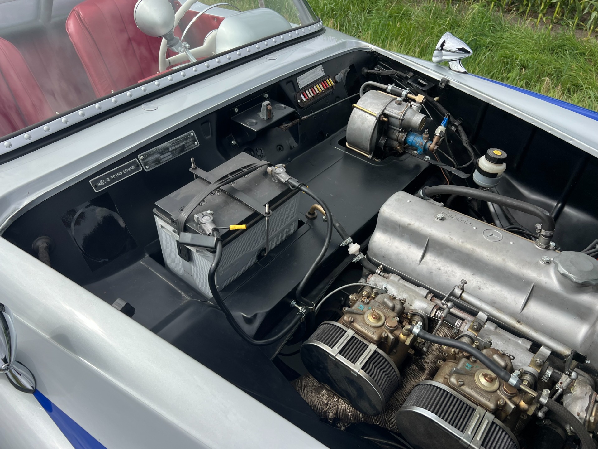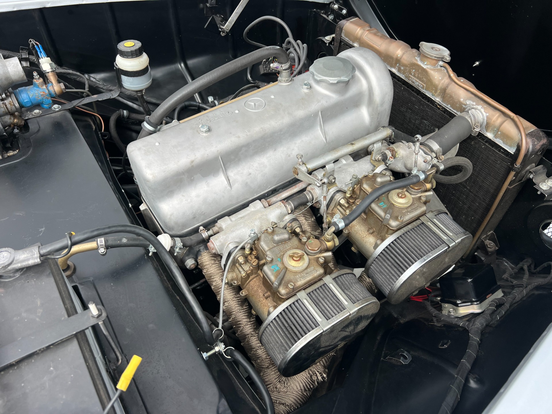 Mechanically, the Mercedes-Benz 190SL is known for its robust and reliable, original 1.9L inline-4 (M121),, and this example has been upgraded for spirited driving. The engine bay shows dual side-draft weber carburetors with performance air filters which improve throttle response and power over the original single-carb setup.