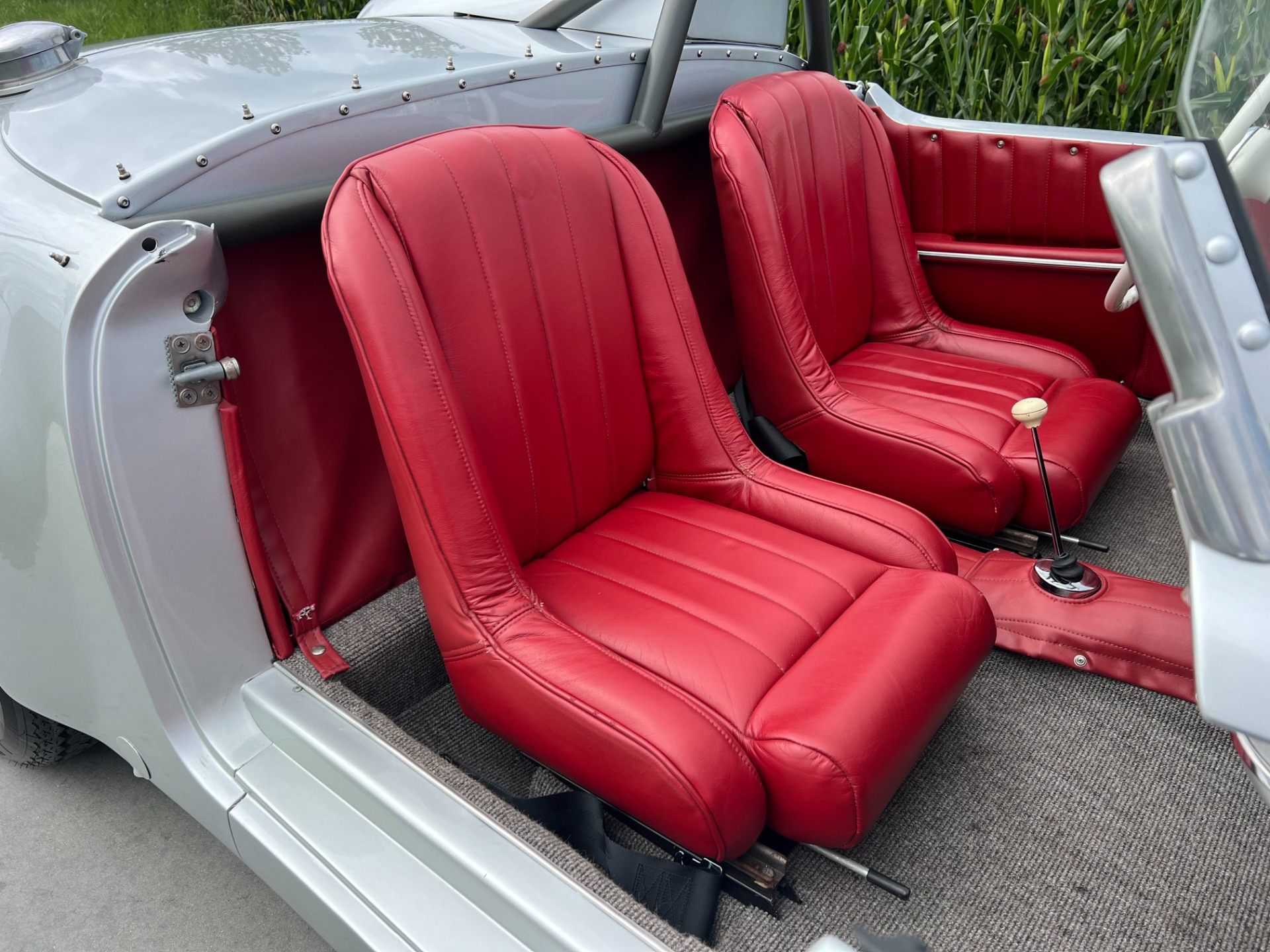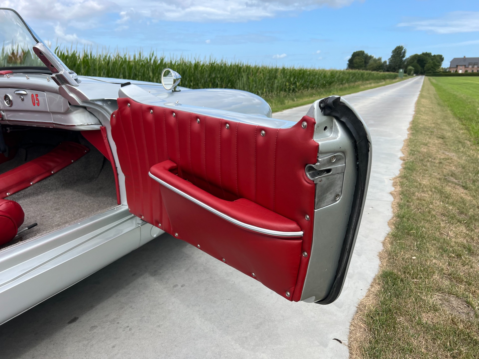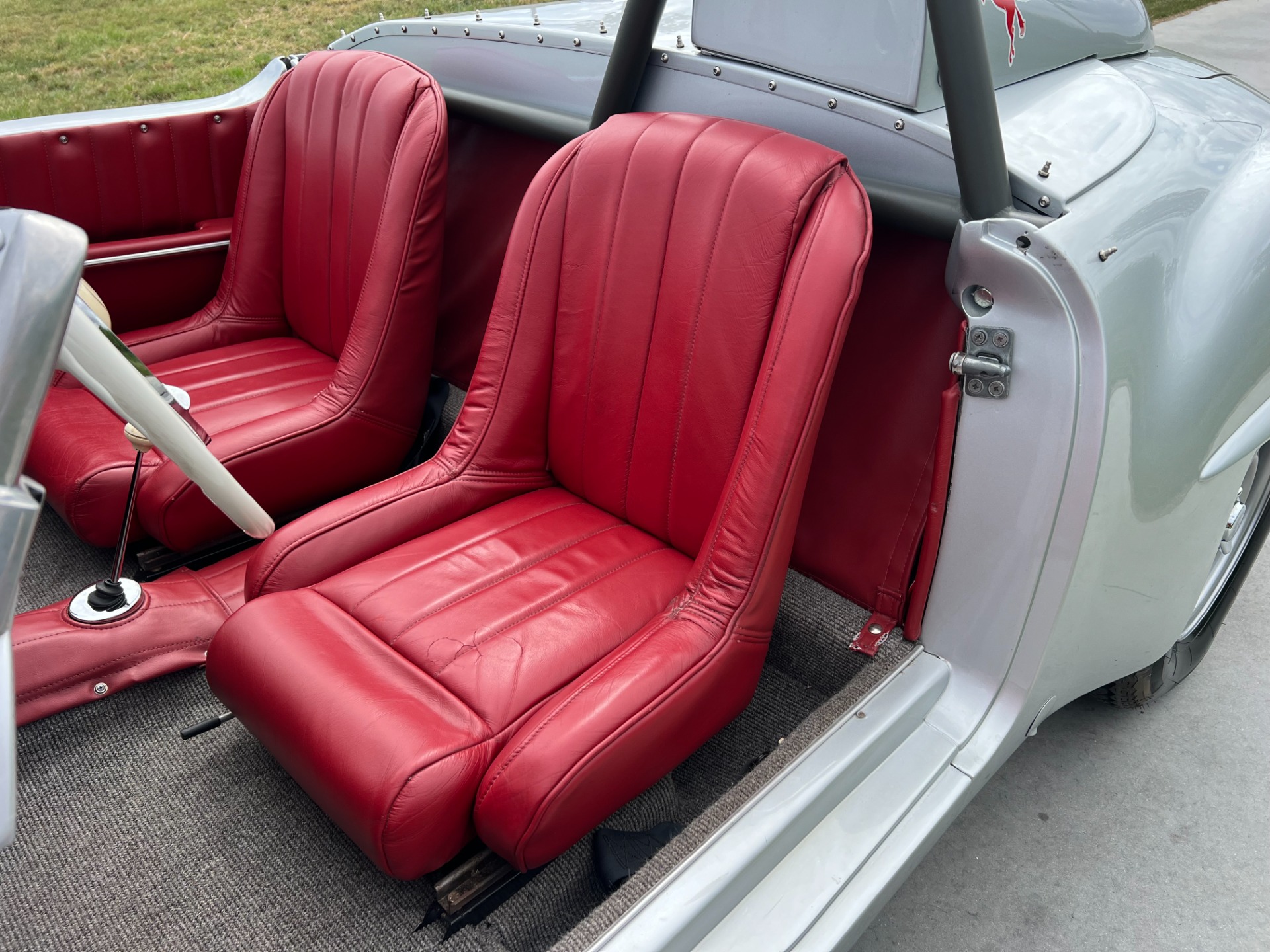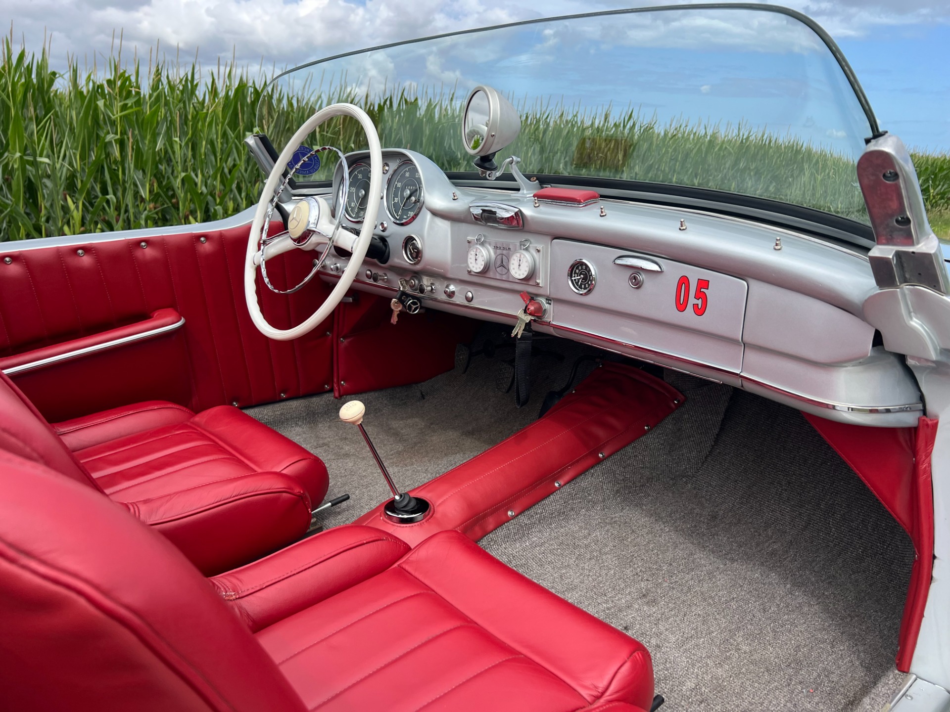 It features striking red leather upholstery throughout, including the low-back bucket seats, door panels, and transmission tunnel. The original-style dashboard is finished in silver with polished accents and a white steering wheel, complemented by period-correct gauges and toggle switches. A large central tachometer, additional rally clocks, and dash-mounted number "05" add to its vintage racing character. The minimalist setup, grey carpet, and exposed rivets reinforce the car's stripped-down, competition-focused personality while preserving unmistakable 1950s elegance.