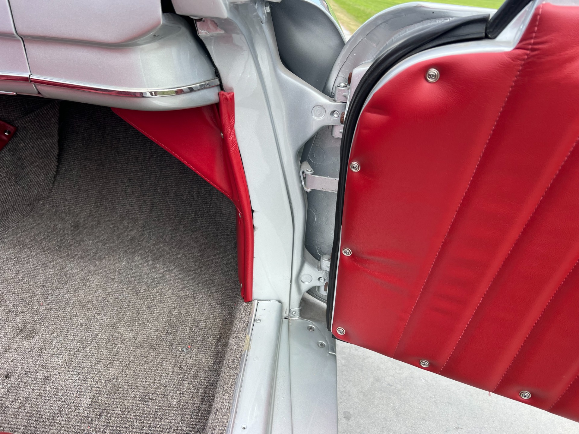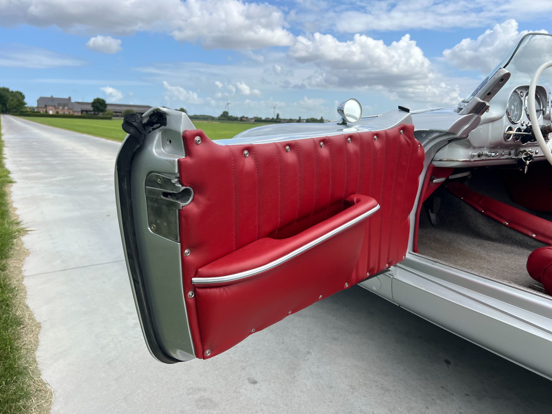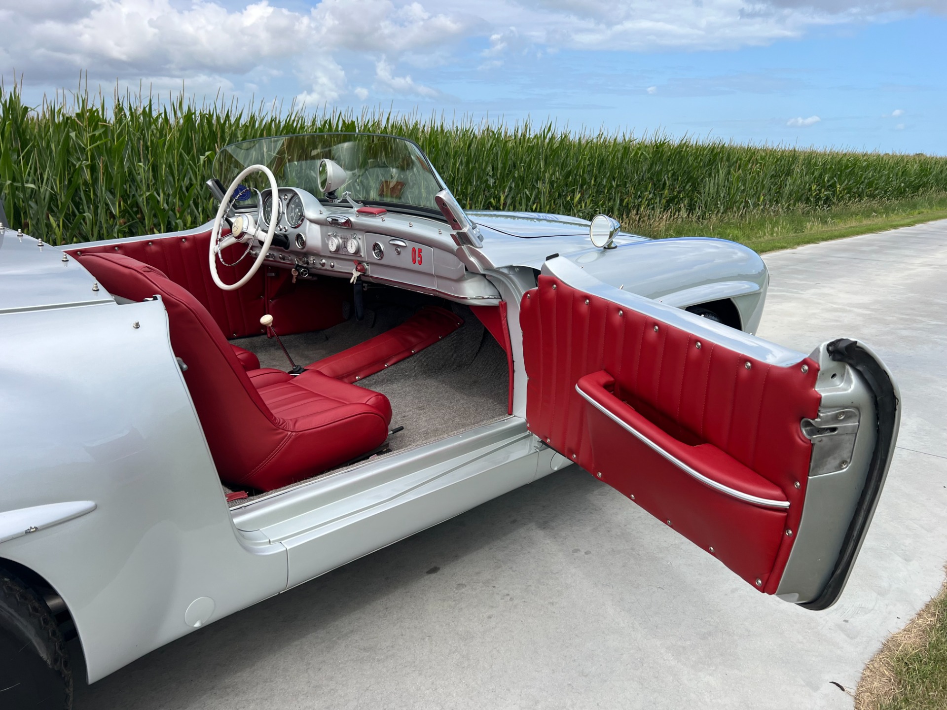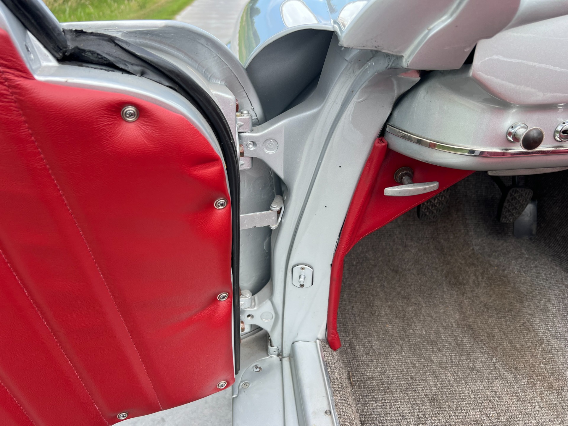 It features striking red leather upholstery throughout, including the low-back bucket seats, door panels, and transmission tunnel. The original-style dashboard is finished in silver with polished accents and a white steering wheel, complemented by period-correct gauges and toggle switches. A large central tachometer, additional rally clocks, and dash-mounted number "05" add to its vintage racing character. The minimalist setup, grey carpet, and exposed rivets reinforce the car's stripped-down, competition-focused personality while preserving unmistakable 1950s elegance.
