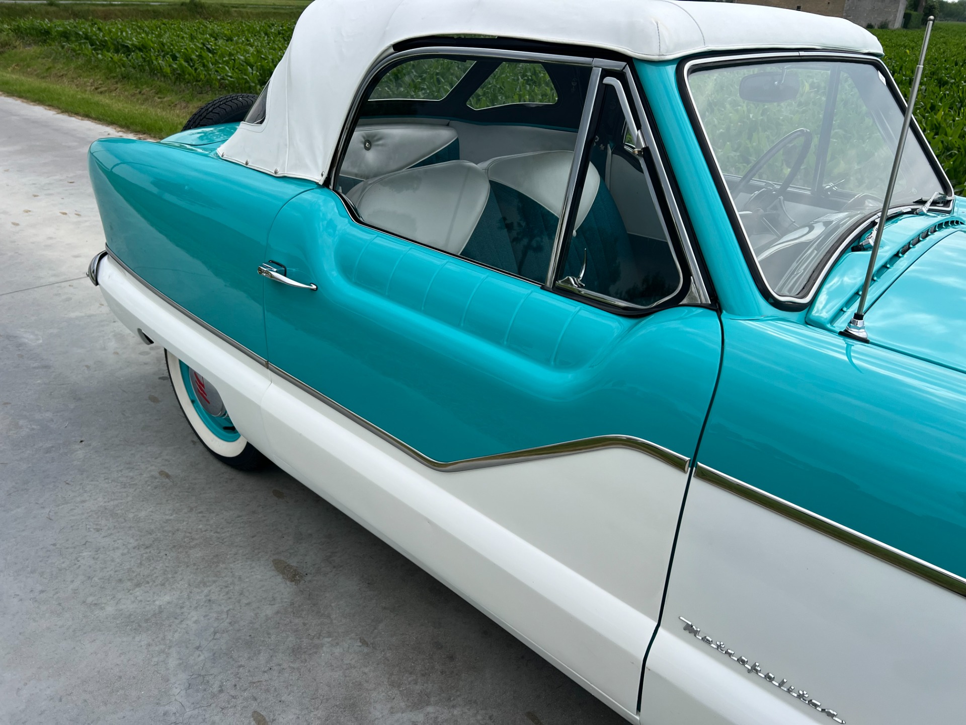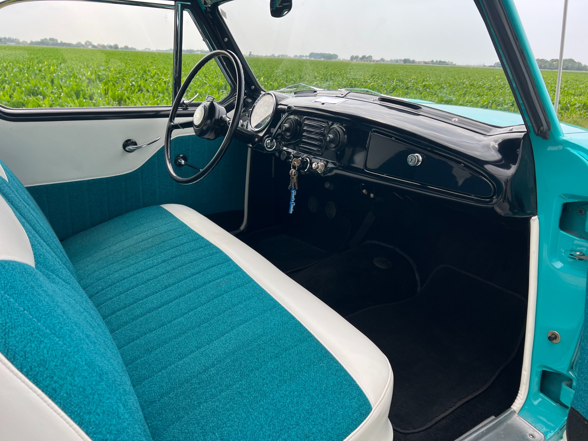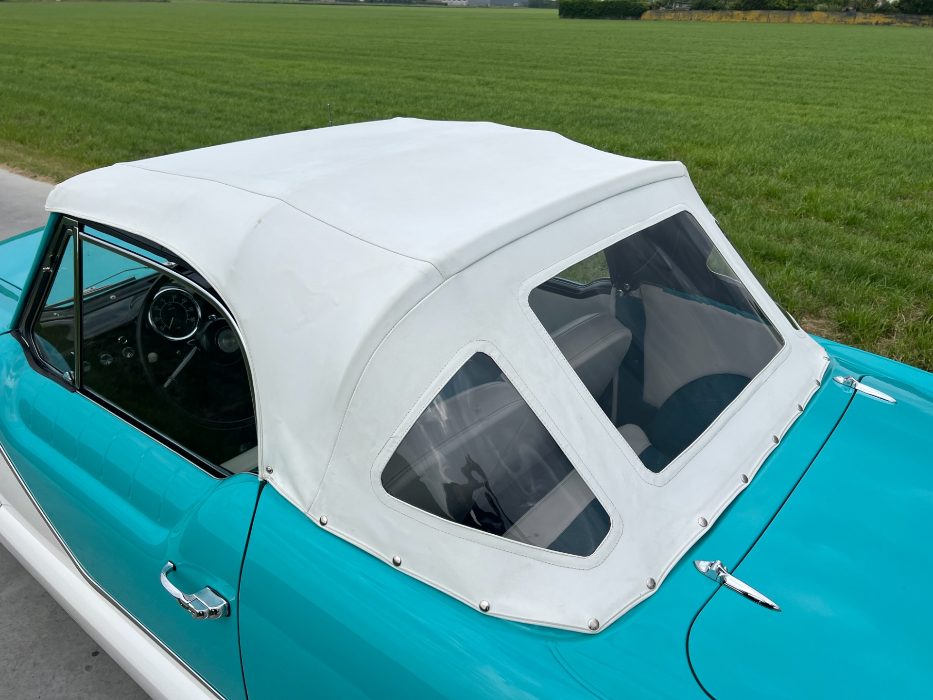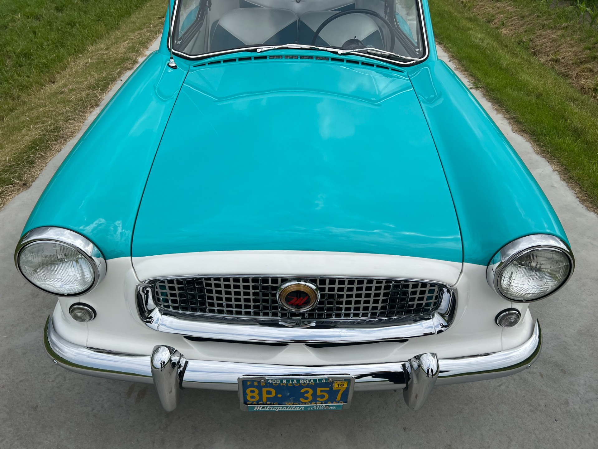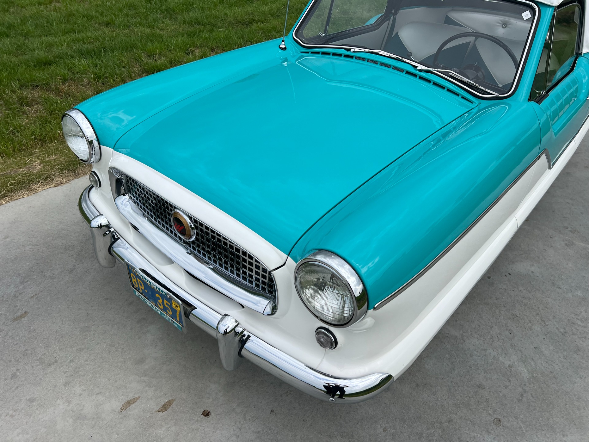New interior in this cute Nash. The blue interior matches the exterior lovely. There are no flaws at all on the seats, carpets or roof lining.