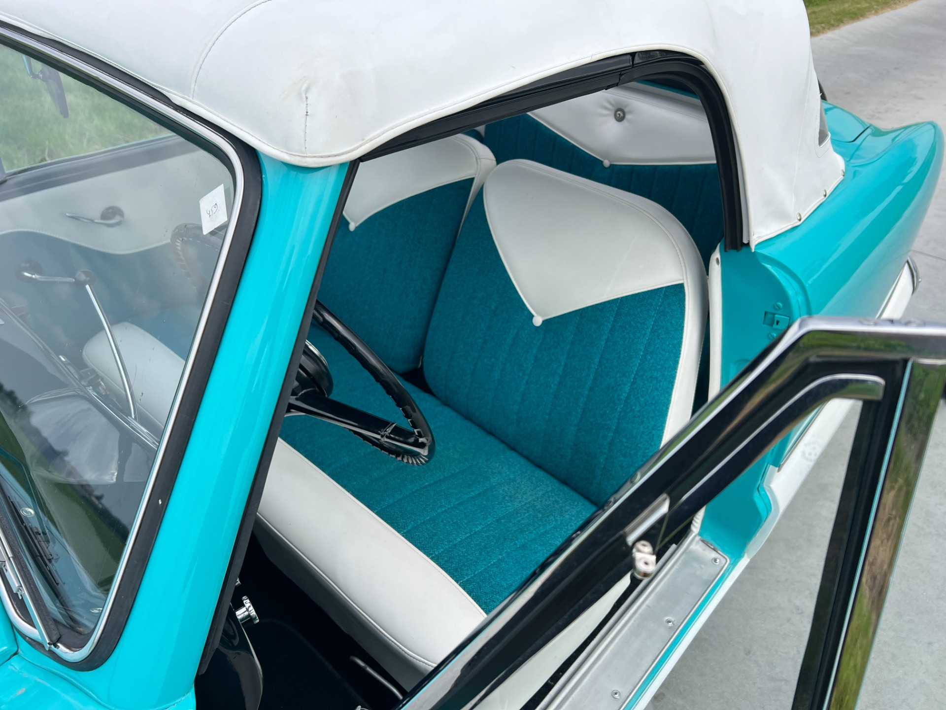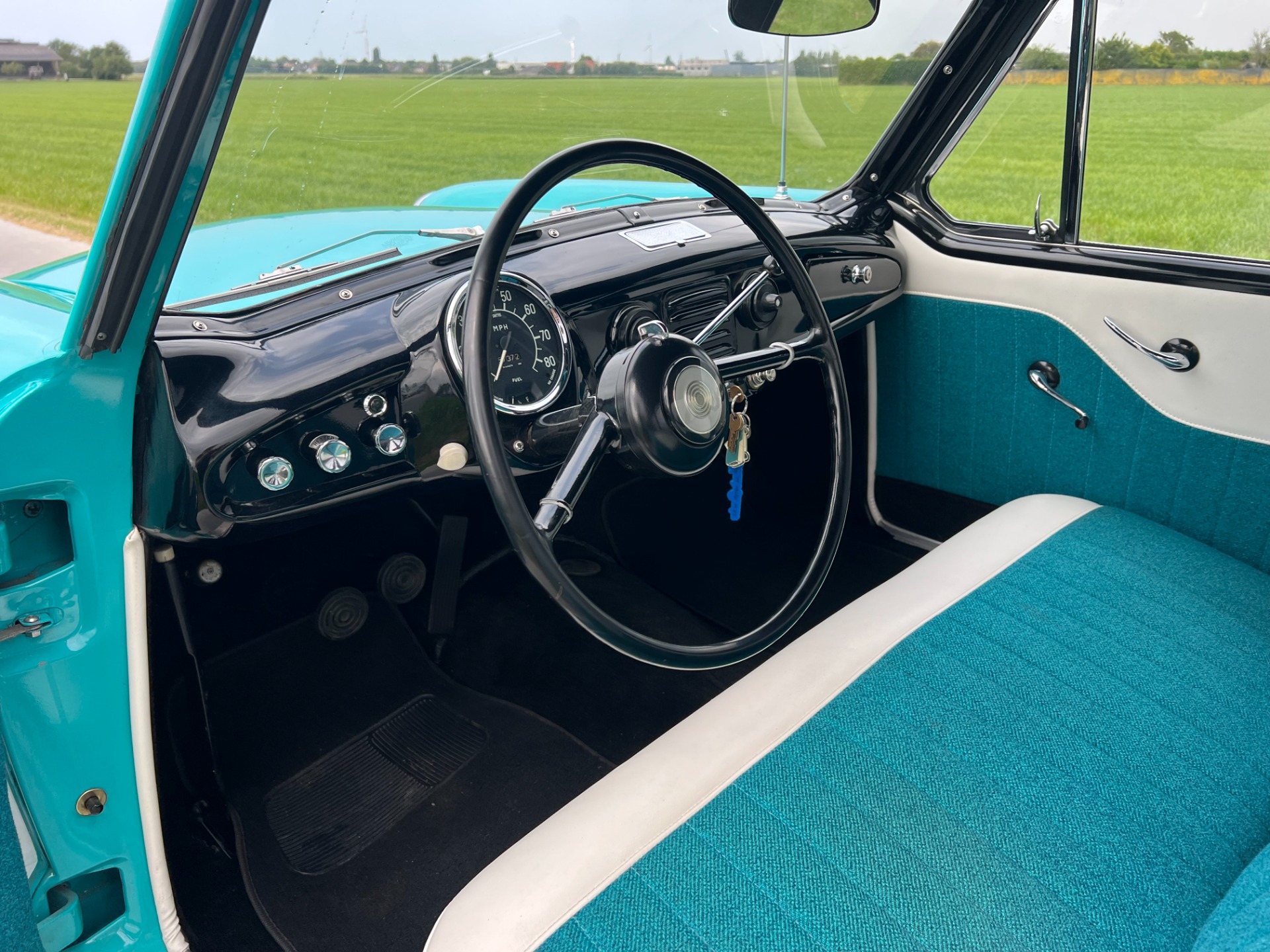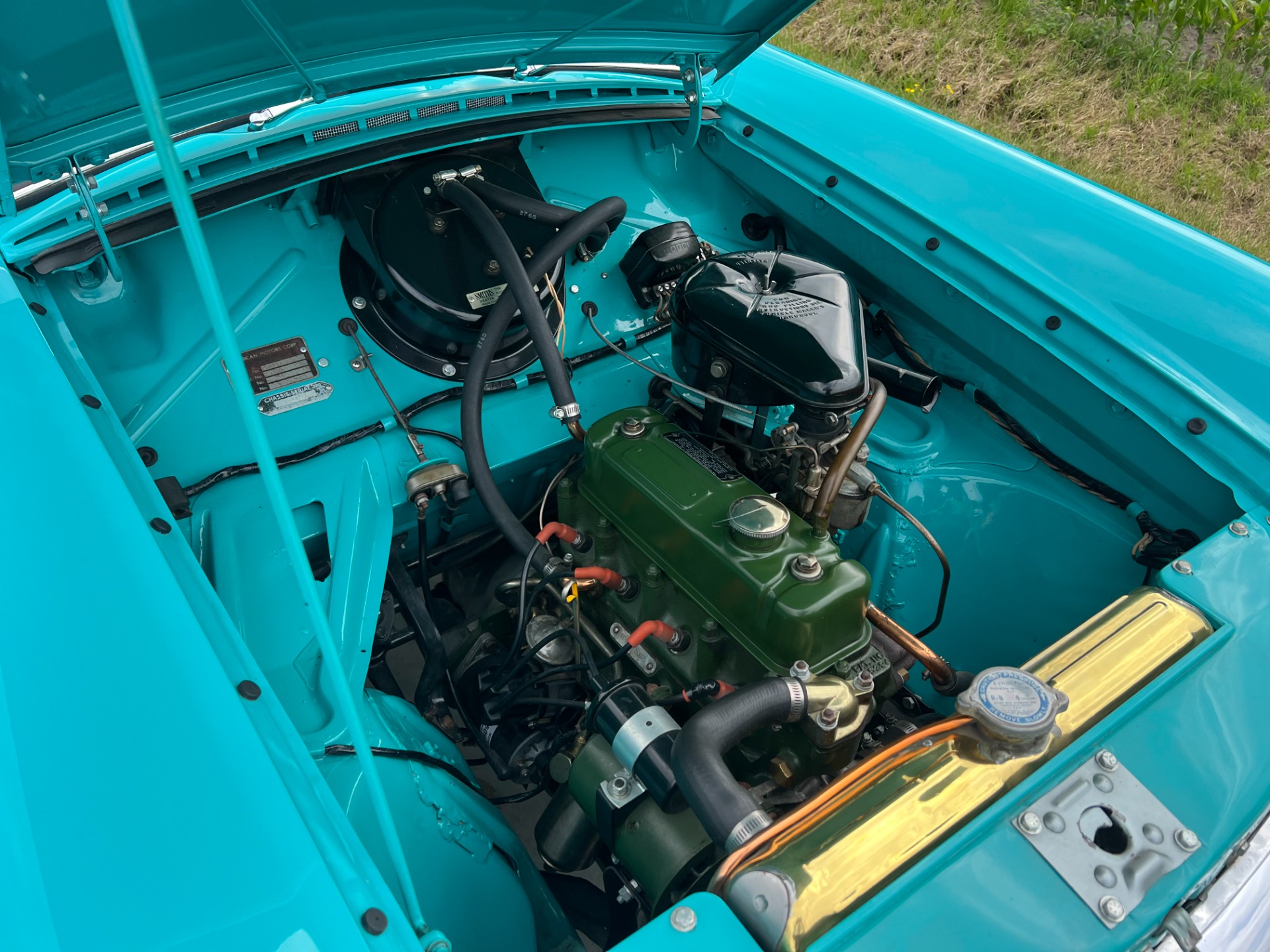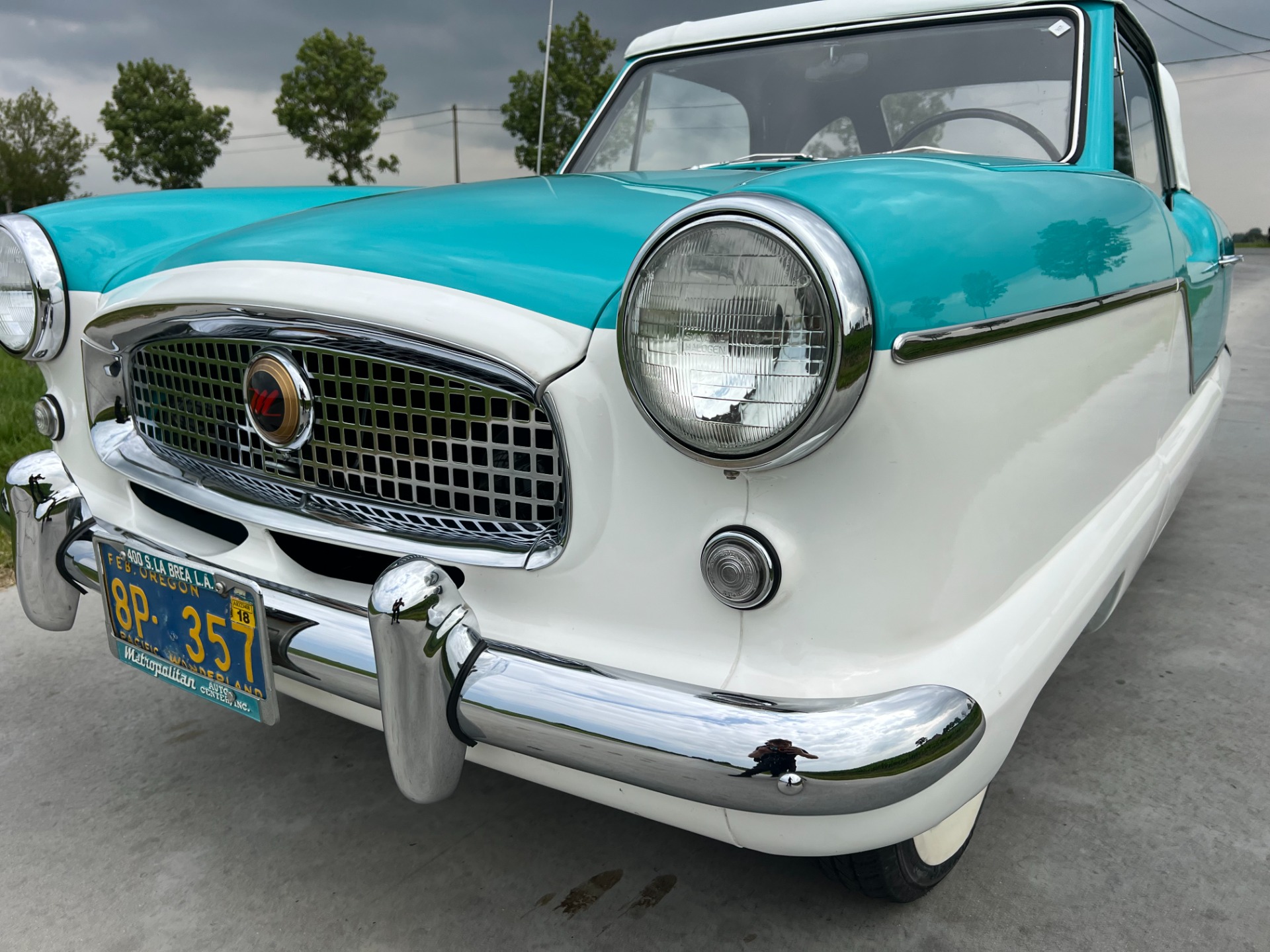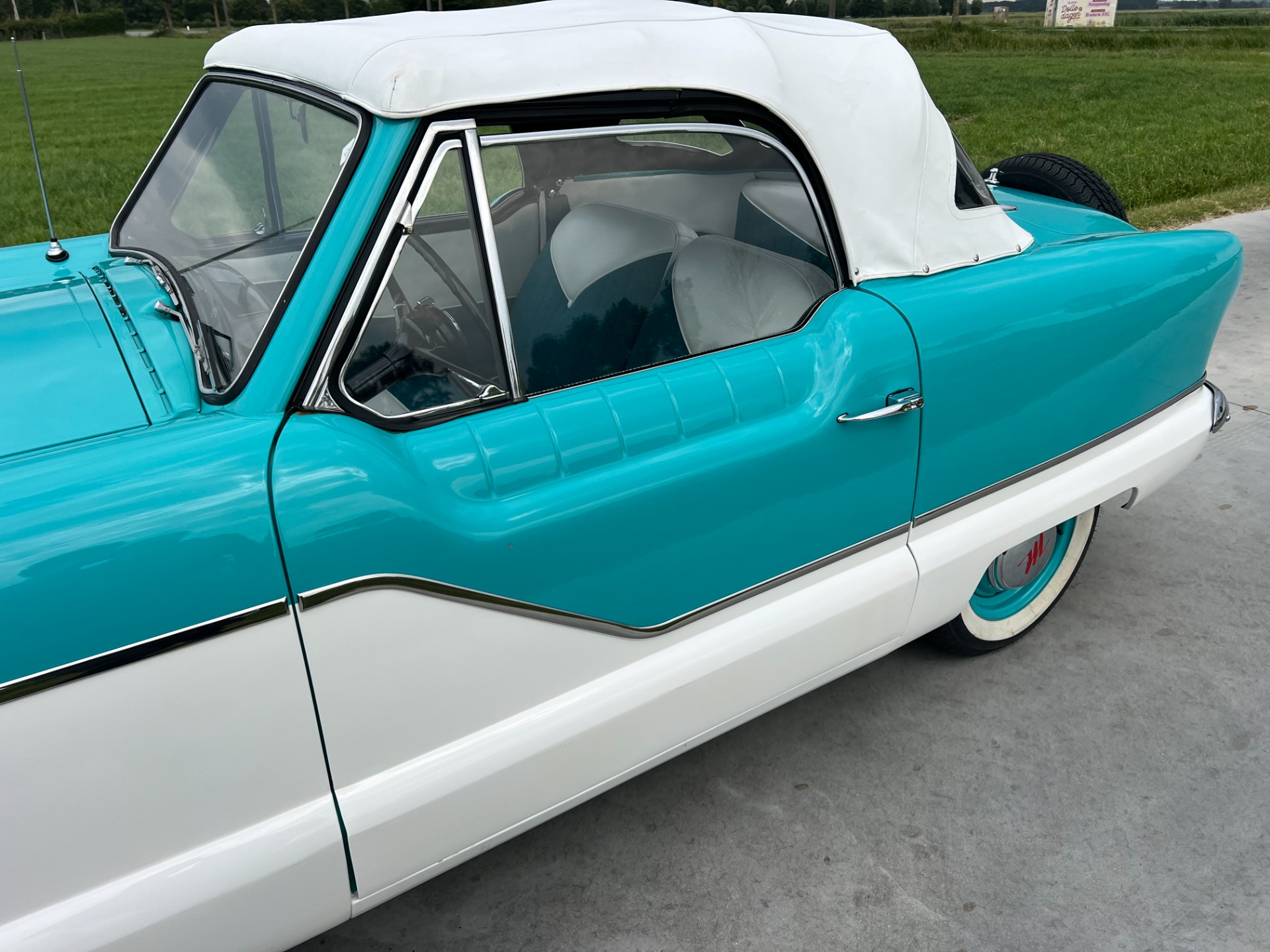 New interior in this cute Nash. The blue interior matches the exterior lovely. There are no flaws at all on the seats, carpets or roof lining.