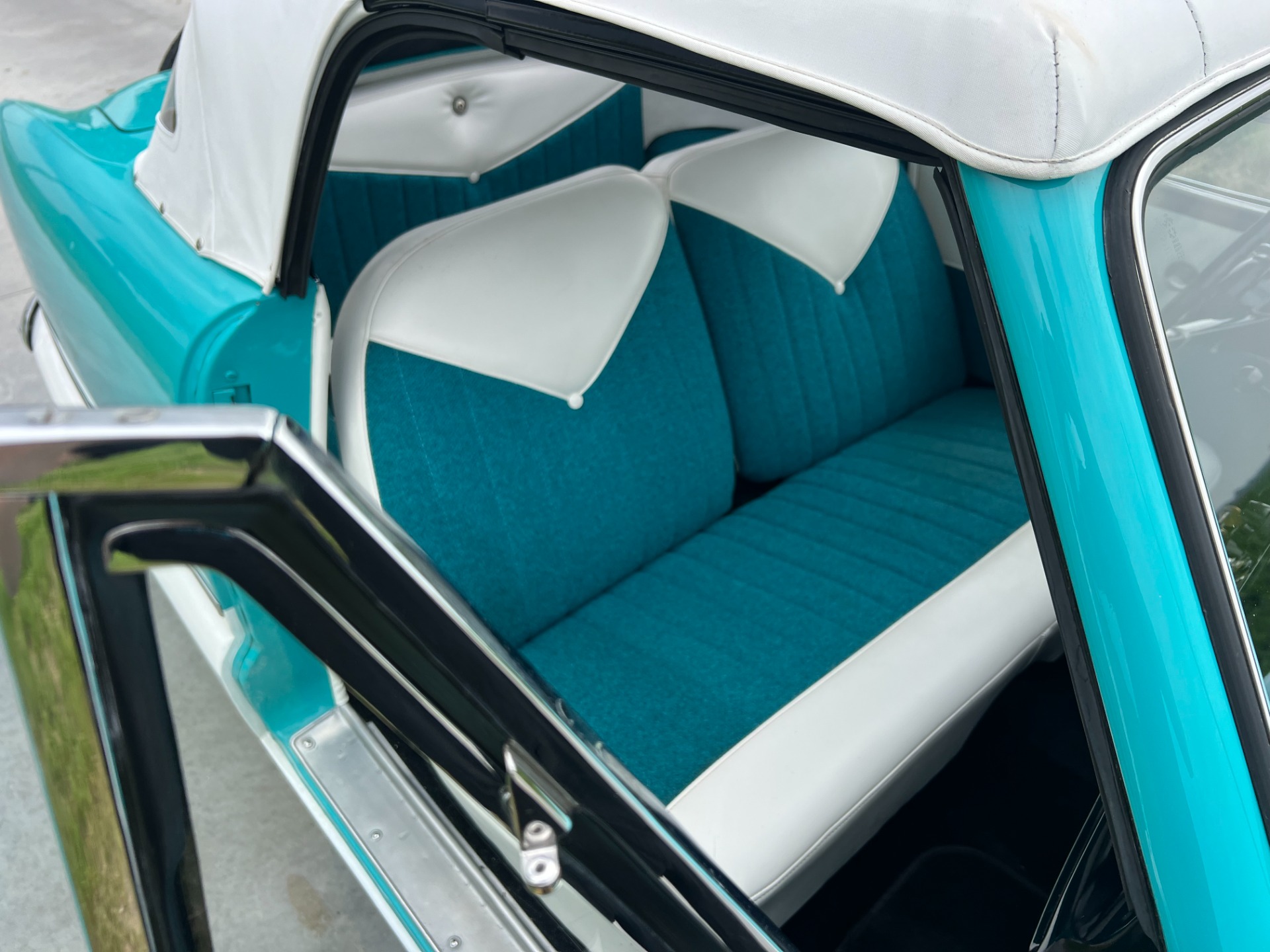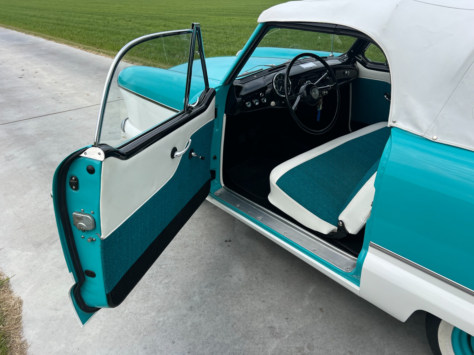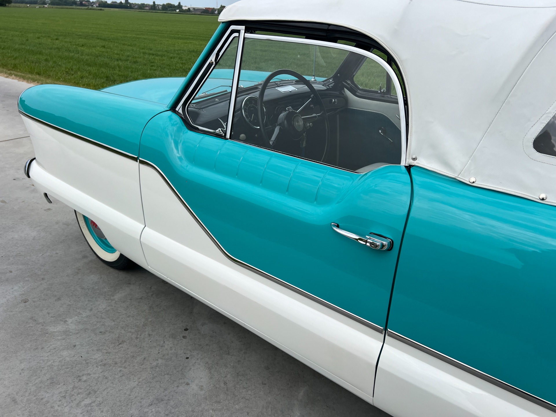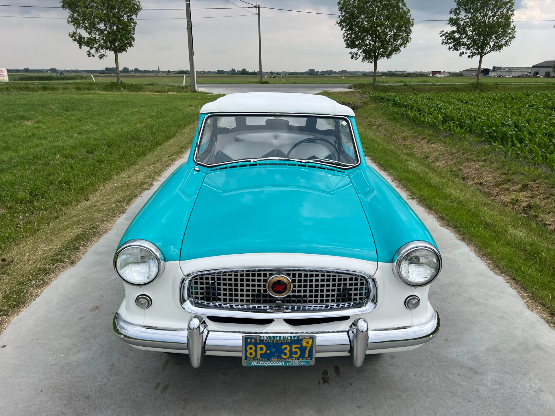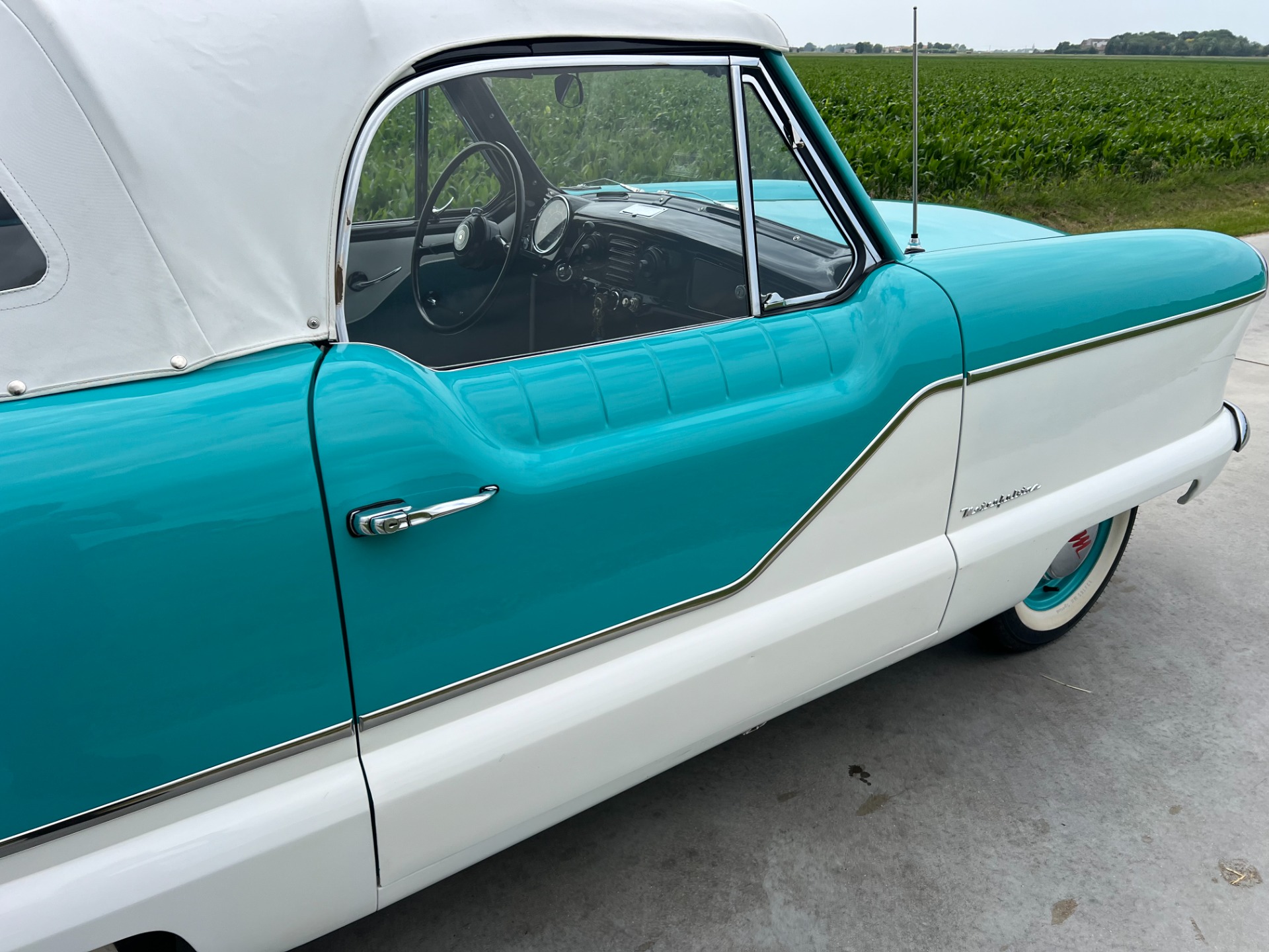 New interior in this cute Nash. The blue interior matches the exterior lovely. There are no flaws at all on the seats, carpets or roof lining.
