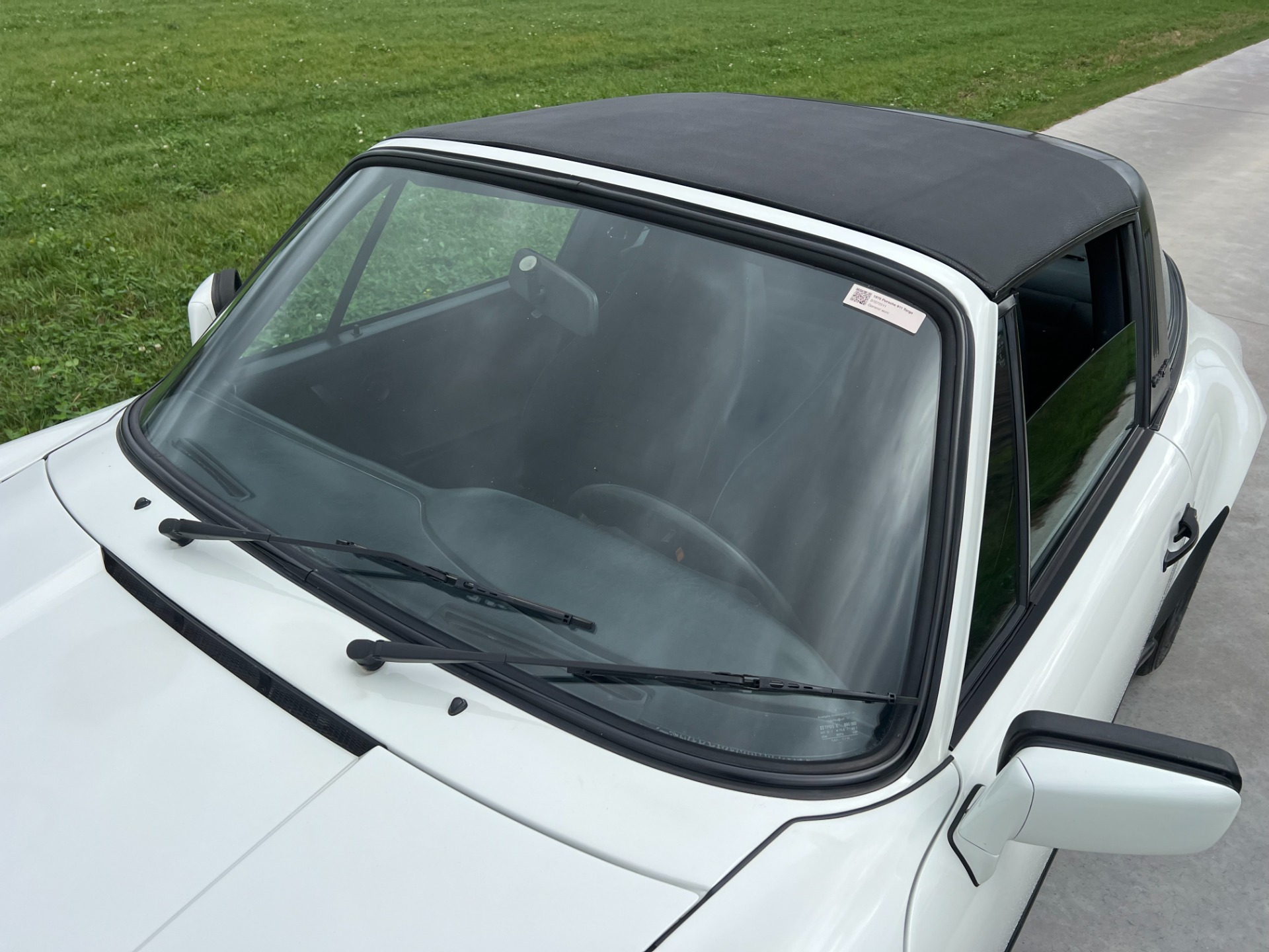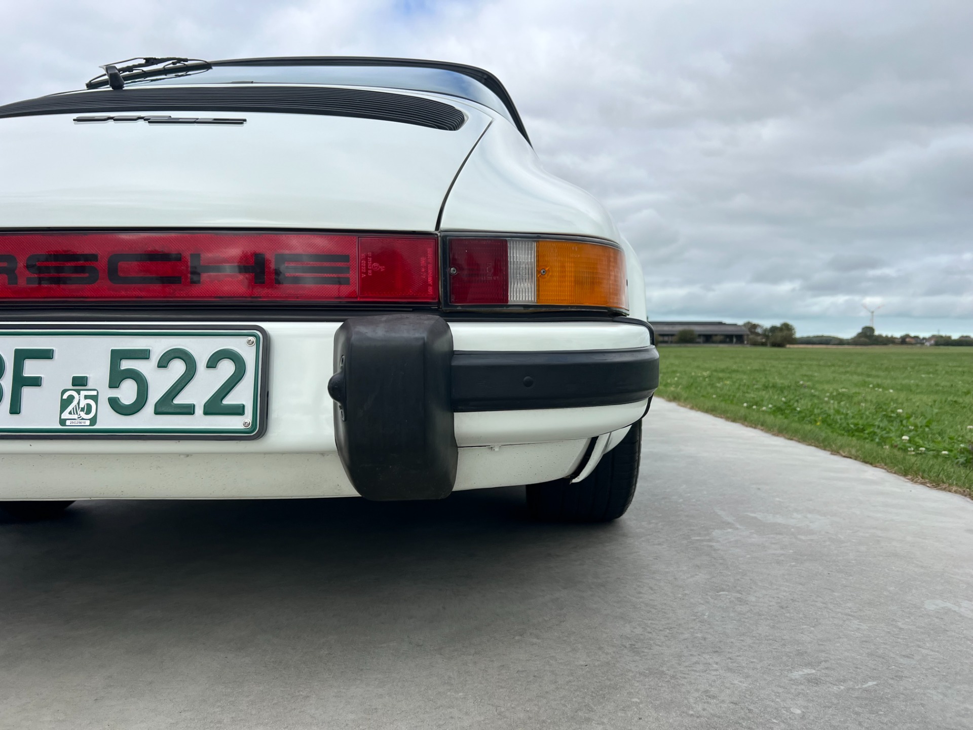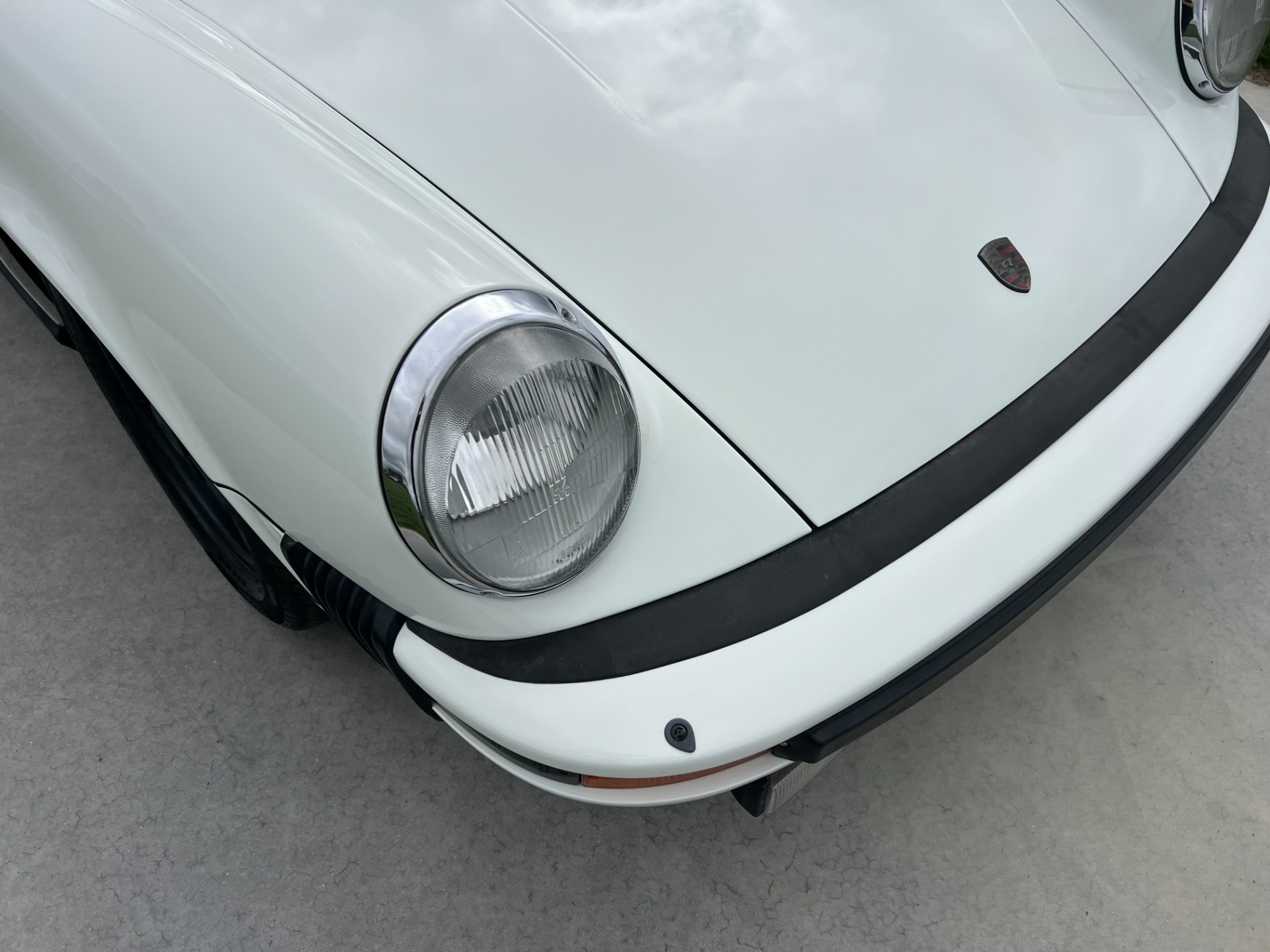 The Targa configuration showcases Porsche's iconic stainless bar and removable roof panel, blending open-air driving with the unmistakable silhouette of the classic 911. Black trim and subtle rear flares highlight the period styling, while impact bumpers, upright headlights, and front fog lamps complete the look. Out back, the signature red reflector with bold Porsche script ensures instant recognition.