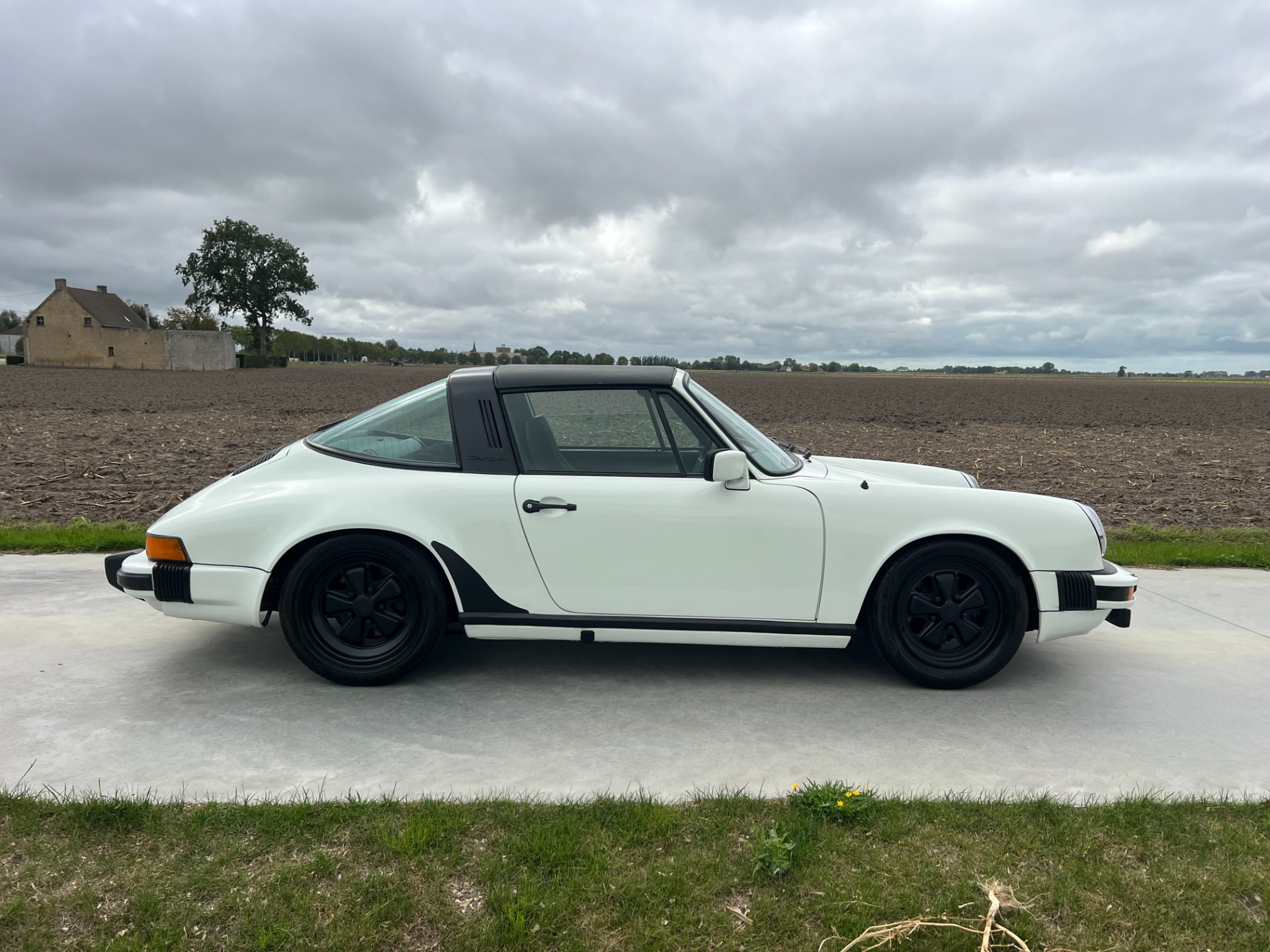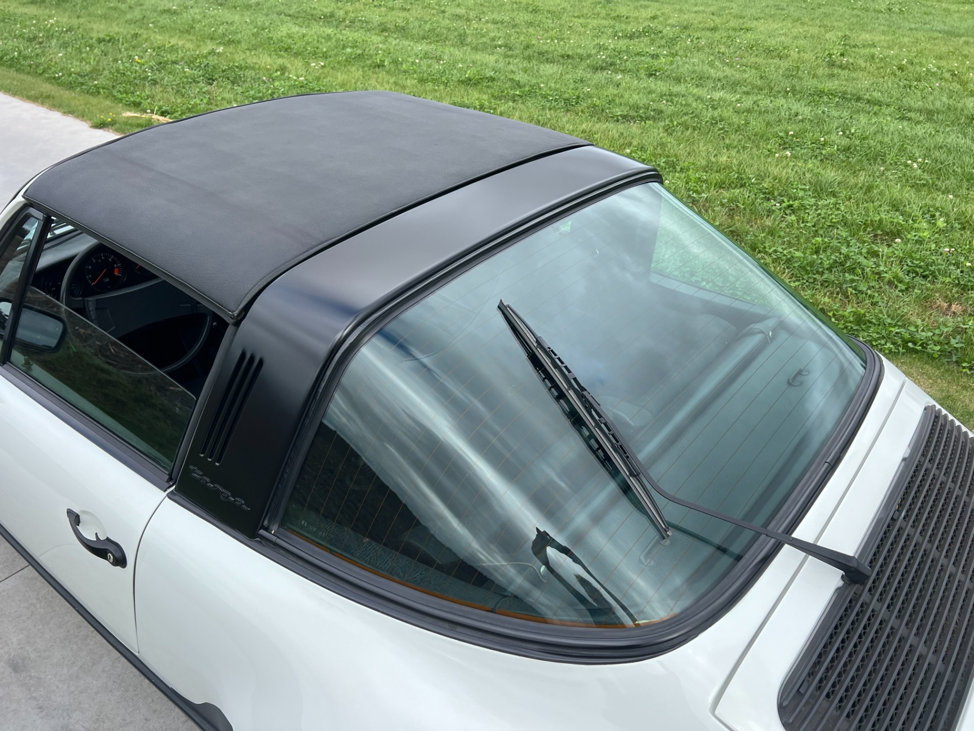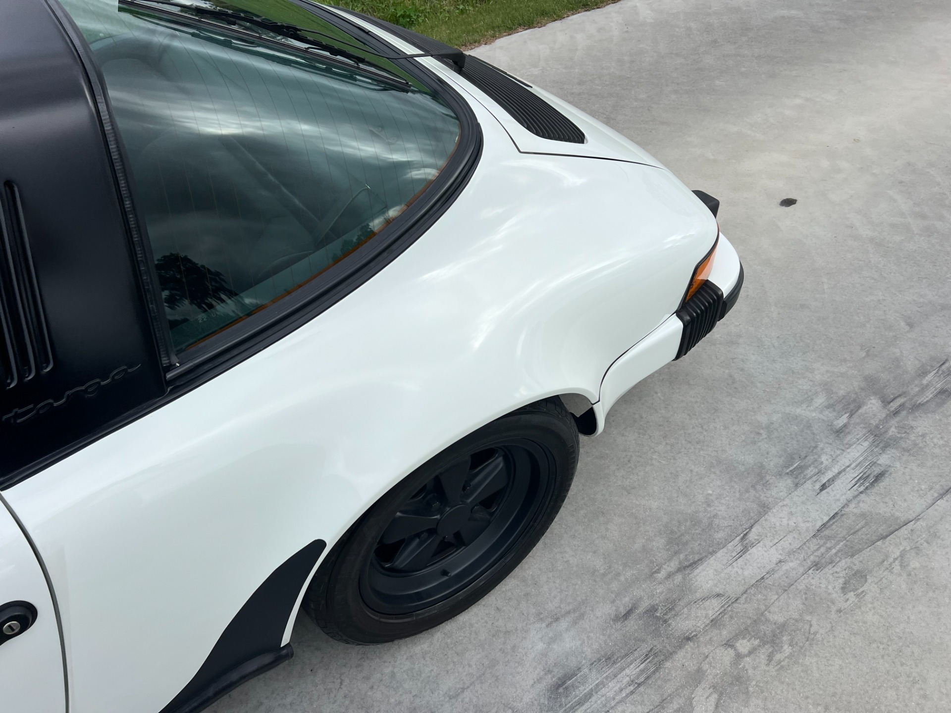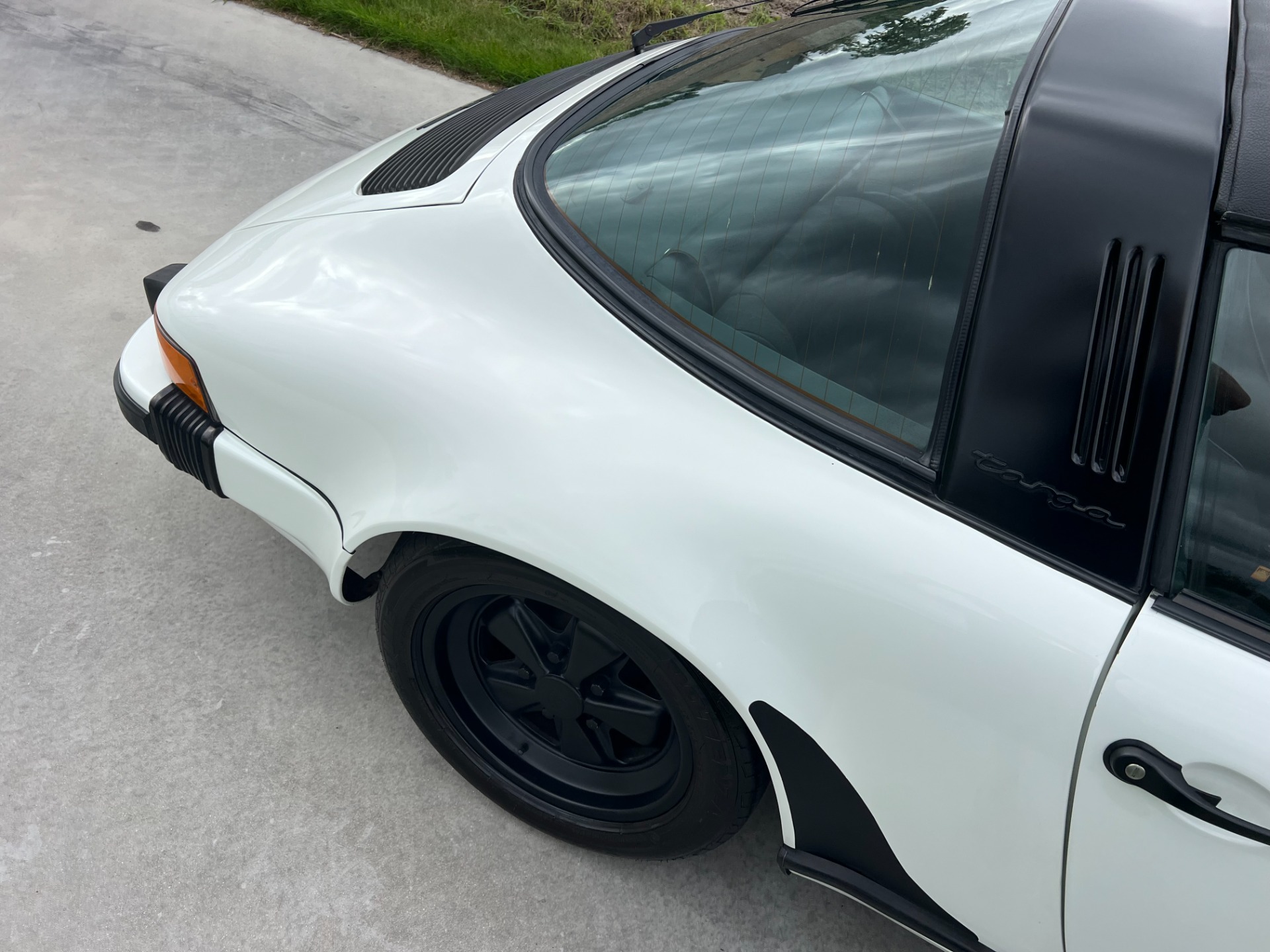 The Targa configuration showcases Porsche's iconic stainless bar and removable roof panel, blending open-air driving with the unmistakable silhouette of the classic 911. Black trim and subtle rear flares highlight the period styling, while impact bumpers, upright headlights, and front fog lamps complete the look. Out back, the signature red reflector with bold Porsche script ensures instant recognition.